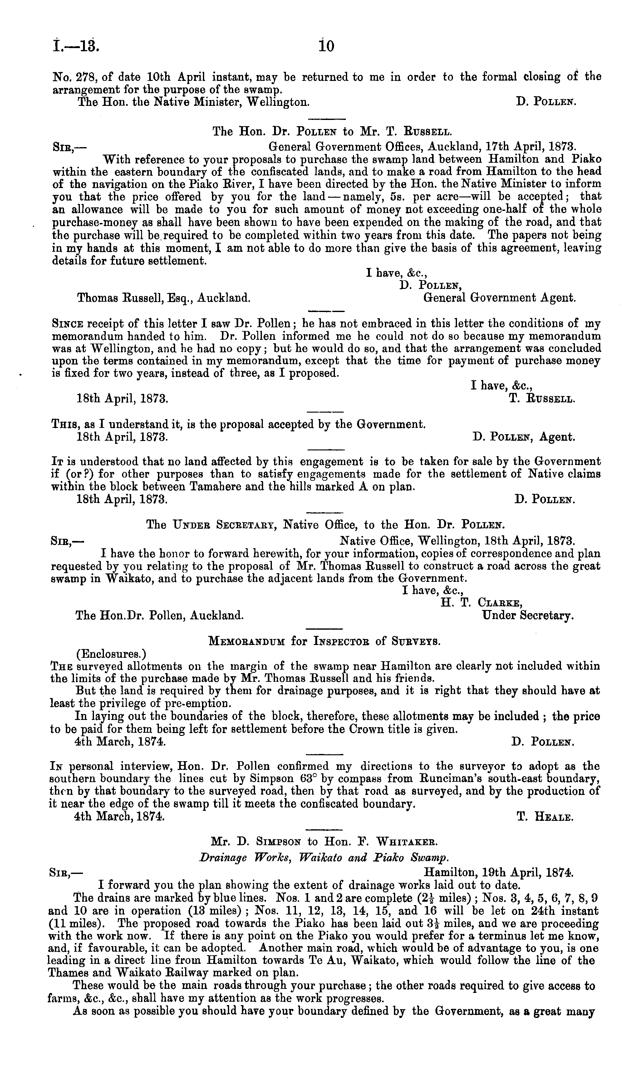 The Hon. Dr. Pollen to Mr. T. Ettssell. Sic, — General Government Offices, Auckland, 17th April, 1873. With reference to your proposals to purchase the swamp land between Hamilton and Piako within the eastern boundary of the confiscated lands, and to make a road from Hamilton to the head of the navigation on the Piako Eiver, I have been directed by the Hon. the Native Minister to inform you that the price offered by you for the land — namely, ss. per acre —will be accepted; that an allowance will be made to you for such amount of money not exceeding one-half of the whole purchase-money as shall have been shown to have been expended on the making of the road, and that the purchase will be required to be completed within two years from this date. The papers not being in my hands at this moment, I am not able to do more than give the basis of this agreement, leaving details for future settlement. I have, &c, D. Pollen, Thomas Eussell, Esq., Auckland. General Government Agent.