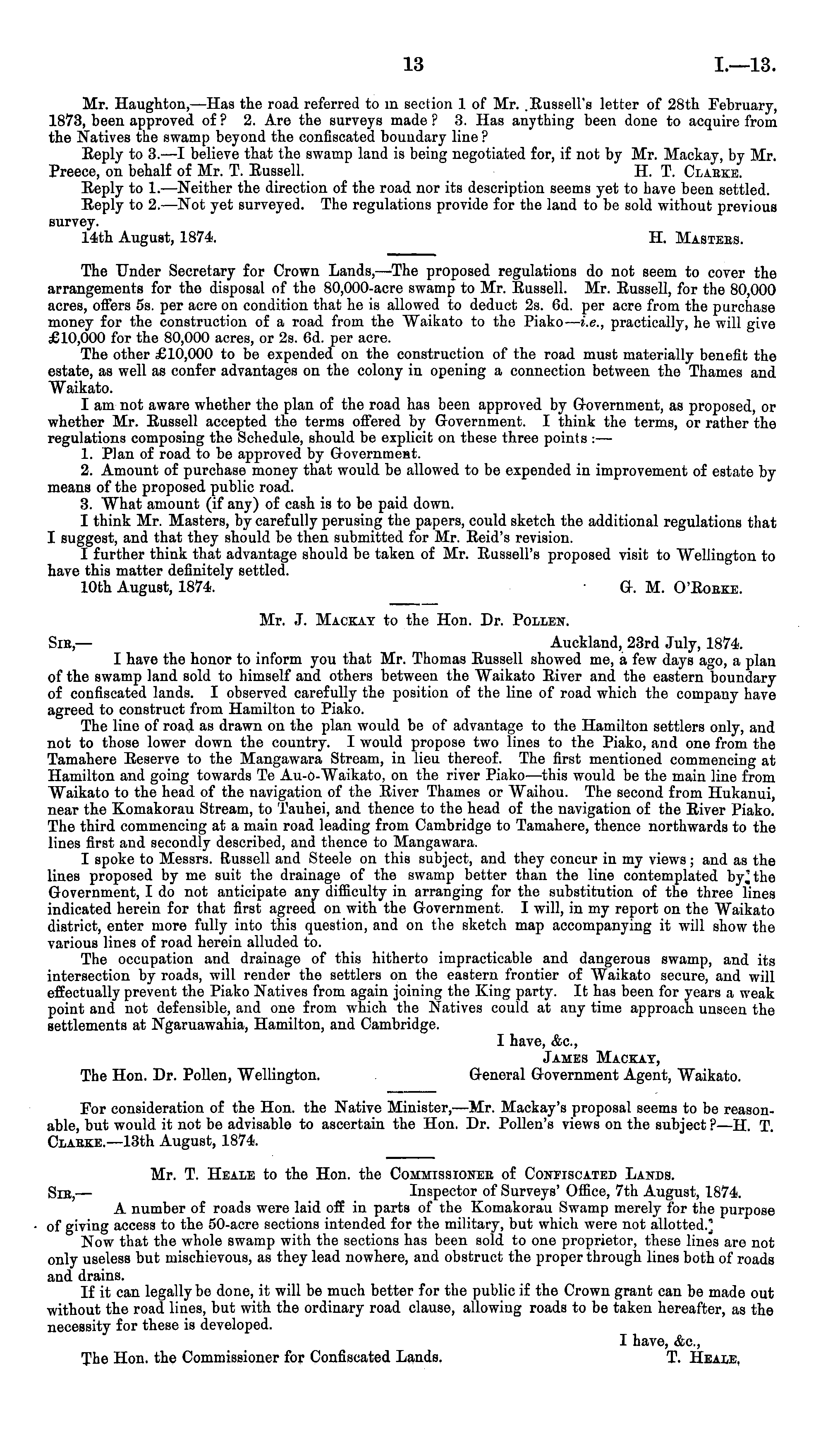 Mr. J. Mackat to the Hon. Dr. Pollen. Sic,— Auckland, 23rd July, 1874. I have the honor to inform you that Mr. Thomas Russell showed me, a few days ago, a plan of the swamp land sold to himself and others between the Waikato River and the eastern boundary of confiscated lands. I observed carefully the position of the line of road which the company have agreed to construct from Hamilton to Piako. The line of road as drawn on the plan would be of advantage to the Hamilton settlers only, and not to those lower down the country. I would propose two lines to the Piako, and one from the Tamahere Reserve to the Mangawara Stream, in lieu thereof. The first mentioned commencing at Hamilton and going towards Te Au-o-Waikato, on the river Piako—this would be the main line from Waikato to the head of the navigation of the River Thames or Waihou. The second from Hukanui, near the Komakorau Stream, to Tauhei, and thence to the head of the navigation of the River Piako. The third commencing at a main road leading from Cambridge to Tamahere, thence northwards to the lines first and secondly described, and thence to Mangawara. I spoke to Messrs. Russell and Steele on this subject, and they concur in my views; and as the lines proposed by me suit the drainage of the swamp better than the line contemplated by^the Government, I do not anticipate any difficulty in arranging for the substitution of the three lines indicated herein for that first agreed on with the Government. I will, in my report on the Waikato district, enter more fully into this question, and on the sketch map accompanying it will show the various lines of road herein alluded to. The occupation and drainage of this hitherto impracticable and dangerous swamp, and its intersection by roads, will render the settlers on the eastern frontier of Waikato secure, and will effectually prevent the Piako Natives from again joining the King party. It has been for years a weak point and not defensible, and one from which the Natives could at any time approach unseen the settlements at Ngaruawahia, Hamilton, and Cambridge. I have, &c, James Mackax, The Hon. Dr. Pollen, Wellington. General Government Agent, Waikato.