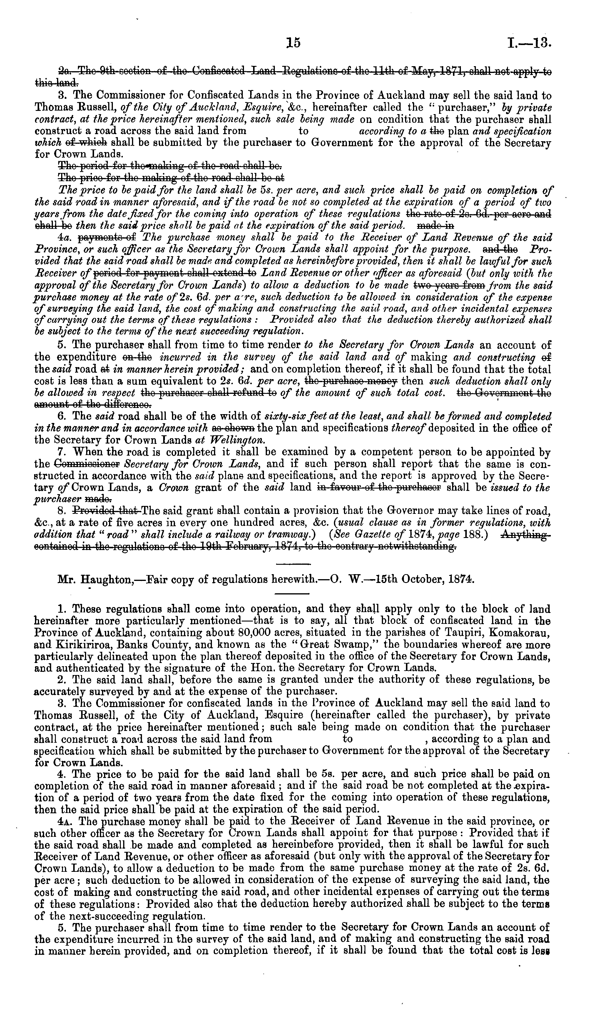 2a. Tho 9th section of the Confiscated Land Rogulationo-of the 11th of May,'lB7l, shall net-apply to 8. The Commissioner for Confiscated Lands in the Province of Auckland may sell the said land to Thomas Russell, of the City of Auckland, Esquire, &c, hereinafter called the " purchaser," by private contract, at the price hereinafter mentioned, such sale being made on condition that the purchaser shall construct a road across the said land from to according to a the plan and specification which of whieb shall be submitted by the purchaser to Government for tho approval of the Secretary for Crown Lands. Tho period for tho-making of tho road ahall bo. Tho prioo for tho making of tho road ohall bo at The price to be paid for the land shall be ss. per acre, and such price shall be paid on completion of the said road in manner aforesaid, and if the road be not so completed at the expiration of a period of two years from the date fixed for the coming into operation of these regulations tho rato of 2s. 6d. })or aero and ohall bo then the said price shall be paid at the expiration of the said period, made in 4a. payments of The purchase money shall be paid to the Receiver of Land Revenue of the said Province, or such officer as the Secretary for Crown Lands shall appoint for the purpose, and tho Provided that the said road shall be made and completed as hereinbefore provided, then it shall be lawful for such Receiver q/"poriod for payment shall extend to Land Revenue or other officer as aforesaid (but only with the approval of the Secretary for Crown Lands) to allow a deduction to be made two years from from the said purchase money at the rate of 2s. Gd. per a re, such deduction to be allowed in consideration of the expense of surveying the said land, the cost of making and constructing the said road, and other incidental expenses of carrying out the terms of these regulations : Provided also that the deduction thereby authorized shall be subject to the terms of the next succeeding regulation. 5. The purchaser shall from time to time render to the Secretary for Crown Lands an account of the expenditure on tho incurred in the survey of the said land and of making and constructing el the said road at in manner herein provided; and on completion thereof, if it shall be found that the total cost is less than a sum equivalent to 2s. Gd. per acre, tho purchaso money then such deduction shall only be allowed in respect tho purchaser ohall refund to of the amount of such total cost, tho Government tho amount of tho ditforeneo. 6. The said road shall be of the width of sixty-six feet at the least, and shall be formed and completed in the manner and in accordance with as shown the plan and specifications thereof deposited in the office of the Secretary for Crown Lands at Wellington. 7. When the road is completed it shall be examined by a competent person to be appointed by the Commissioner Secretary for Croivn Lands, and if such person shall report that the same is constructed in accordance with the said plane and specifications, and the report is approved by the Secretary of Crown Lands, a Crown grant of the said land in favour of tho purehasor shall be issued to the purchaser saader 8. Provided that The said grant shall contain a provision that the Governor may take lines of road, &c, at a rate of five acres in every one hundred acres, &c. {usual clause as in former regulations, with addition that " road " shall include a railway or tramway.) (See Gazette of 1874, page 188.) Anything oontainod in the regulations of tho 19th February, 1871, to tho ooiitrary notwithstanding.