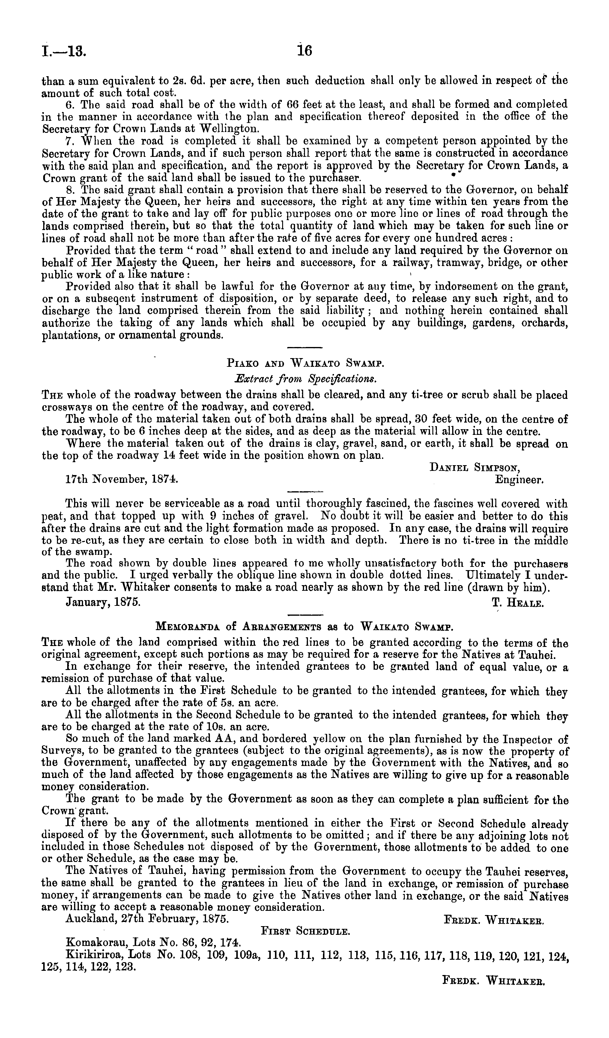 Piako and Waikato Swamp. Extract from Specifications. The whole of the roadway between the drains shall be cleared, and any ti-tree or scrub shall be placed crossways on the centre of the roadway, and covered. The whole of the material taken out of both drains shall be spread, 30 feet wide, on the centre of the roadway, to be 6 inches deep at the sides, and as deep as the material will allow in the centre. Where the material taken out of the drains is clay, gravel, sand, or earth, it shall be spread on the top of the roadway 14 feet wide in the position shown on plan. Daniel Simpson, 17th November, 1874. Engineer.