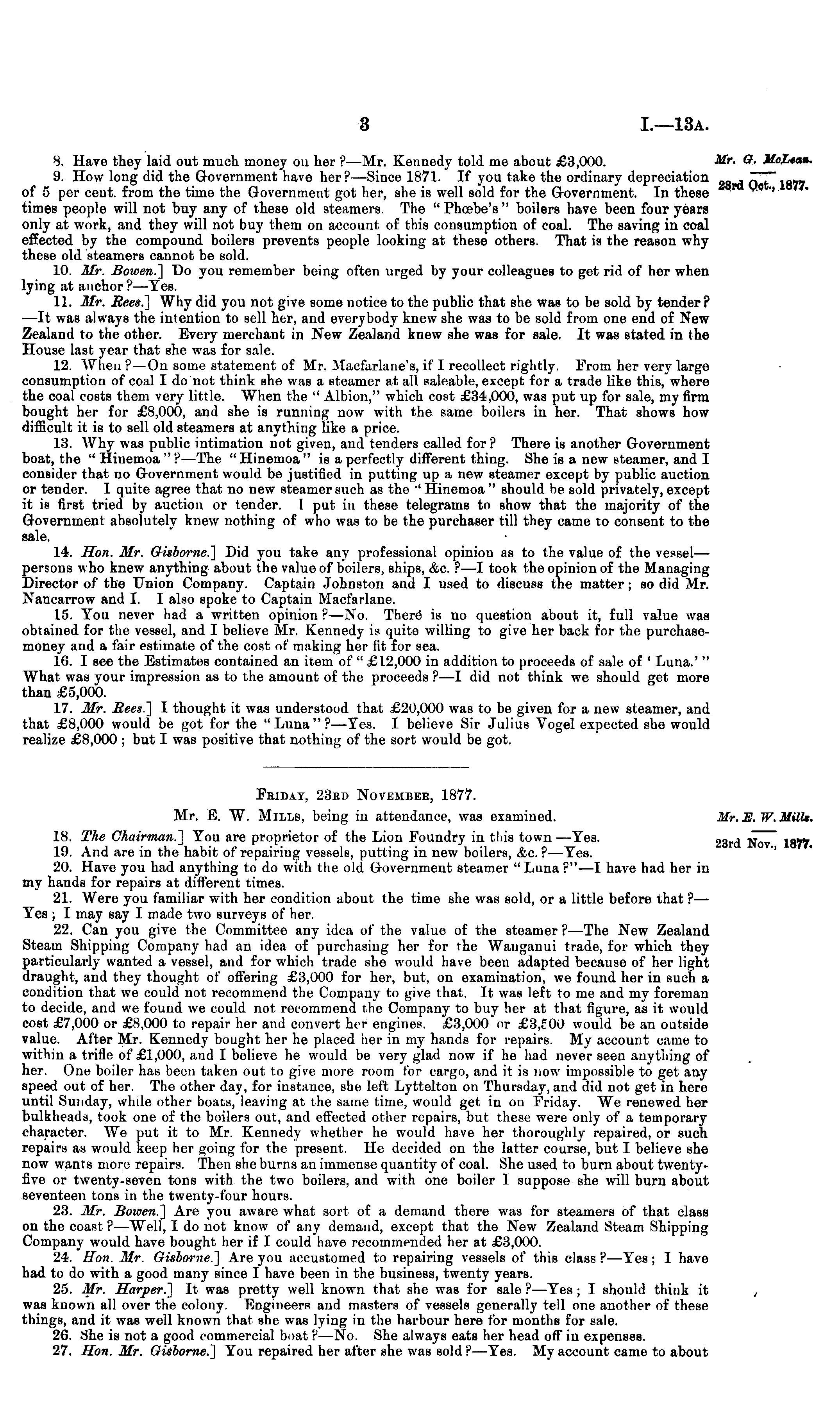 Fbiday, 23rd November, 1877. Mr. B. W. Mills, being in attendance, waa examined. 18. The Chairman.'] You are proprietor of the Lion Foundry in this town —Yes. 19. And are in the habit of repairing vessels, putting in new boilers, &c. ?—Yes. 20. Have you had anything to do with the old Government steamer " Luna ?" —I have had her in my hands for repairs at different times. 21. Were you familiar with her condition about the time she was sold, or a little before that ? — Yes ; I may say I made two surveys of her. 22. Can you give the Committee any idea of the value of the steamer ?—The New Zealand Steam Shipping Company had an idea of purchasing her for the Wanganui trade, for which they particularly wanted a vessel, and for which trade she would have been adapted because of her light draught, and they thought of offering £3,000 for her, but, on examination, we found her in such a condition that we could not recommend the Company to give that. It was left to me and my foreman to decide, and we found we could not recommend the Company to buy her at that figure, as it would cost £7,000 or £8,000 to repair her and convert her engines. £3,000 or £3,f 00 would be an outside value. After Mr. Kennedy bought her he placed her in my hands for repairs. My account came to within a trifle of £1,000, and I believe he would be very glad now if he had never seen anything of her. One boiler has been taken out to give more room for cargo, and it is now impossible to get any speed out of her. The other day, for instance, she left Lyttelton on Thursday, and did not get in here until Sunday, while other boats, leaving at the same time, would get in on Friday. We renewed her bulkheads, took one of the boilers out, and effected other repairs, but these were only of a temporary character. We put it to Mr. Kennedy whether he would have her thoroughly repaired, or such repairs as would keep her going for the present. He decided on the latter course, but I believe she now wants more repairs. Then she burns an immense quantity of coal. She used to burn about twentyfive or twenty-seven tons with the two boilers, and with one boiler I suppose she will burn about seventeen tons in the twenty-four hours. 23. Mr. Bowen.] Are you aware what sort of a demand there was for steamers of that class on the coast ? —Well, I do not know of any demand, except that the New Zealand Steam Shipping Company would have bought her if I could have recommended her at £3,000. 24. Hon. Mr. Gisborne.] Are you accustomed to repairing vessels of this class ?—Yes; I have had to do with a good many since I have been in the business, twenty years. 25. Mr. Harper.'] It was pretty well known that she was for sale ?—Yes ; I should thiuk it was known all over the colony. Engineers and masters of vessels generally tell one another of these things, and it was well known that she was lying in the harbour here for months for sale. 26. She is not a good commercial boat ? —No. She always eats her head off in expenses. 27. Hon. Mr. Gislorne.] You repaired her after she was sold ? —Yes. My account came to about