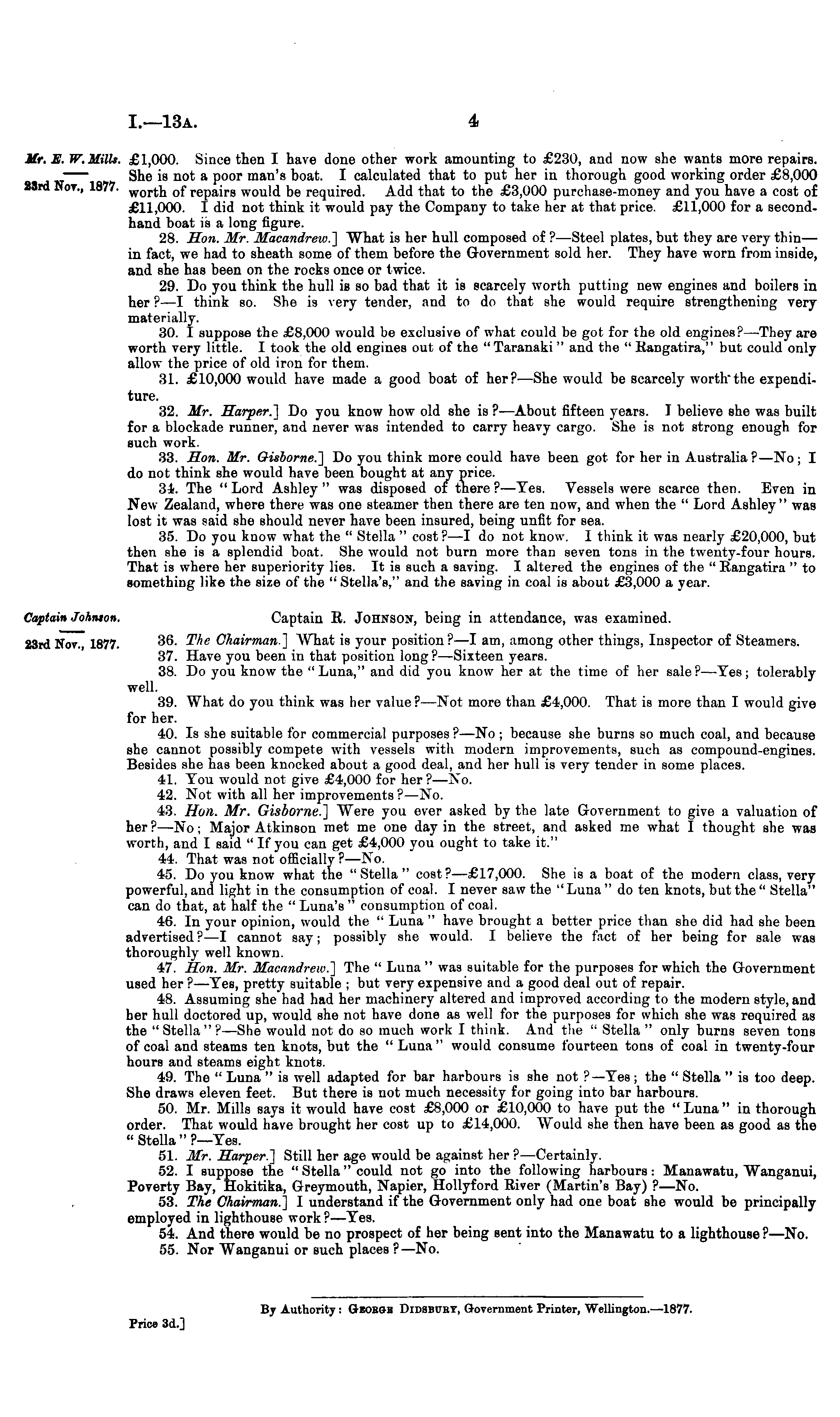 £1,000. Since then I have done other work amounting to £230, and now she wants more repairs. She is not a poor man's boat. I calculated that to put her in thorough good working order £8,000 worth of repairs would be required. Add that to the £3,000 purchase-money and you have a cost of £11,000. I did not think it would pay the Company to take her at that price. £11,000 for a secondhand boat is a long figure. 28. Hon. Mr. Macandrew.] What is her hull composed of ? —Steel plates, but they are very thin— in fact, we had to sheath some of them before the Government sold her. They have worn from inside, and she has been on the rocks once or twice. 29. Do you think the hull is so bad that it is scarcely worth putting new engines and boilers in her ? —I think so. She is very tender, and to do that she would require strengthening very materially. 30. I suppose the £8,000 would be exclusive of what could be got for the old engines?— They are worth very little. I took the old engines out of the " Taranaki " and the " Eangatira," but could only allow the price of old iron for them. 31. £10,000 would have made a good boat of her?— She would be scarcely worth the expenditure. 32. Mr. Harper.] Do you know how old she is ?—About fifteen years. I believe Bhe was built for a blockade runner, and never was intended to carry heavy cargo. She is not strong enough for such work. 33. Hon. Mr. Oisborne.] Do you think more could have been got for her in Australia ? —No; I do not think she would have been bought at any price. 31. The " Lord Ashley " was disposed of there ?—Tes. Vessels were scarce then. Even in New Zealand, where there was one steamer then there are ten now, and when the " Lord Ashley" was lost it was said she should never have been insured, being unfit for sea. 35. Do you know what the " Stella " cost ?—I do not know. I think it was nearly £20,000, but then she is a splendid boat. She would not burn more than seven tons in the twenty-four hours. That is where her superiority lies. It is such a saving. I altered the engines of the " Eangatira "to something like the size of the " Stella's," and the saving in coal is about £3,000 a year. Captain E. Johnson, being in attendance, was examined. 36. The Chairman.] What is your position?—l am, among other things, Inspector of Steamers. 37. Have you been in that position long ?—Sixteen years. 38. Do you know the "Luna," and did you know her at the time of her sale?— Yes; tolerably well. 39. What do you think was her value? —Not more than £4,000. That is more than I would give for her. 40. Is she suitable for commercial purposes ? —No ; because she burns so much coal, and because she cannot possibly compete with vessels with modern improvements, such as compound-engines. Besides she has been knocked about a good deal, and her hull is very tender in some places. 41. You would not give £4,000 for her ?—No. 42. Not with all her improvements ? —No. 43. Hon. Mr. Gisborne.] Were you ever asked by the late Government to give a valuation of her ?—No; Major Atkinson met me one day in the street, and asked me what I thought she was worth, and I said " If you can get £4,000 you ought to take it." 44. That was not officially ?—No. 45. Do you know what the "Stella" cost? —£17,000. She is a boat of the modern class, very powerful, and light in the consumption of coal. I never saw the "Luna " do ten knots, but the " Stella" can do that, at half the " Luna's " consumption of coal. 46. In your opinion, would the " Luna " have brought a better price than she did had she been advertised?—l cannot say; possibly she would. I believe the fact of her being for sale was thoroughly well known. 47. Hon. Mr. Macandrew.] The " Luna " was suitable for the purposes for which the Government used her ?—Yes, pretty suitable ; but very expensive and a good deal out of repair. 48. Assuming she had had her machinery altered and improved according to the modern style, and her hull doctored up, would she not have done as well for the purposes for which she was required as the "Stella"?— She would not do so much work I think. And the " Stella " only burns seven tons of coal and steams ten knots, but the "Luna" would consume fourteen tons of coal in twenty-four hours and steams eight knots. 49. The " Luna " is well adapted for bar harbours is she not ?—Yes; the " Stella " is too deep. She draws eleven feet. But there is not much necessity for going into bar harbours. 50. Mr. Mills says it would have cost £8,000 or £10,000 to have put the " Luna " in thorough order. That would have brought her cost up to £14,000. Would she then have been as good as the " Stella " ?—Yes. 51. Mr. Harper.] Still her age would be against her ? —Certainly. 52. I suppose the " Stella" could not go into the following harbours : Manawatu, Wanganui, Poverty Bay, Hokitika, Greymouth, Napier, Hollyford Eiver (Martin's Bay) ?—No. 53. The Chairman.] I understand if the Government only had one boat she would be principally employed in lighthouse work ?—Yes. 54. And there would be no prospect of her being sent into the Manawatu to a lighthouse ?—No. 55. Nor Wanganui or such places ?—No.
