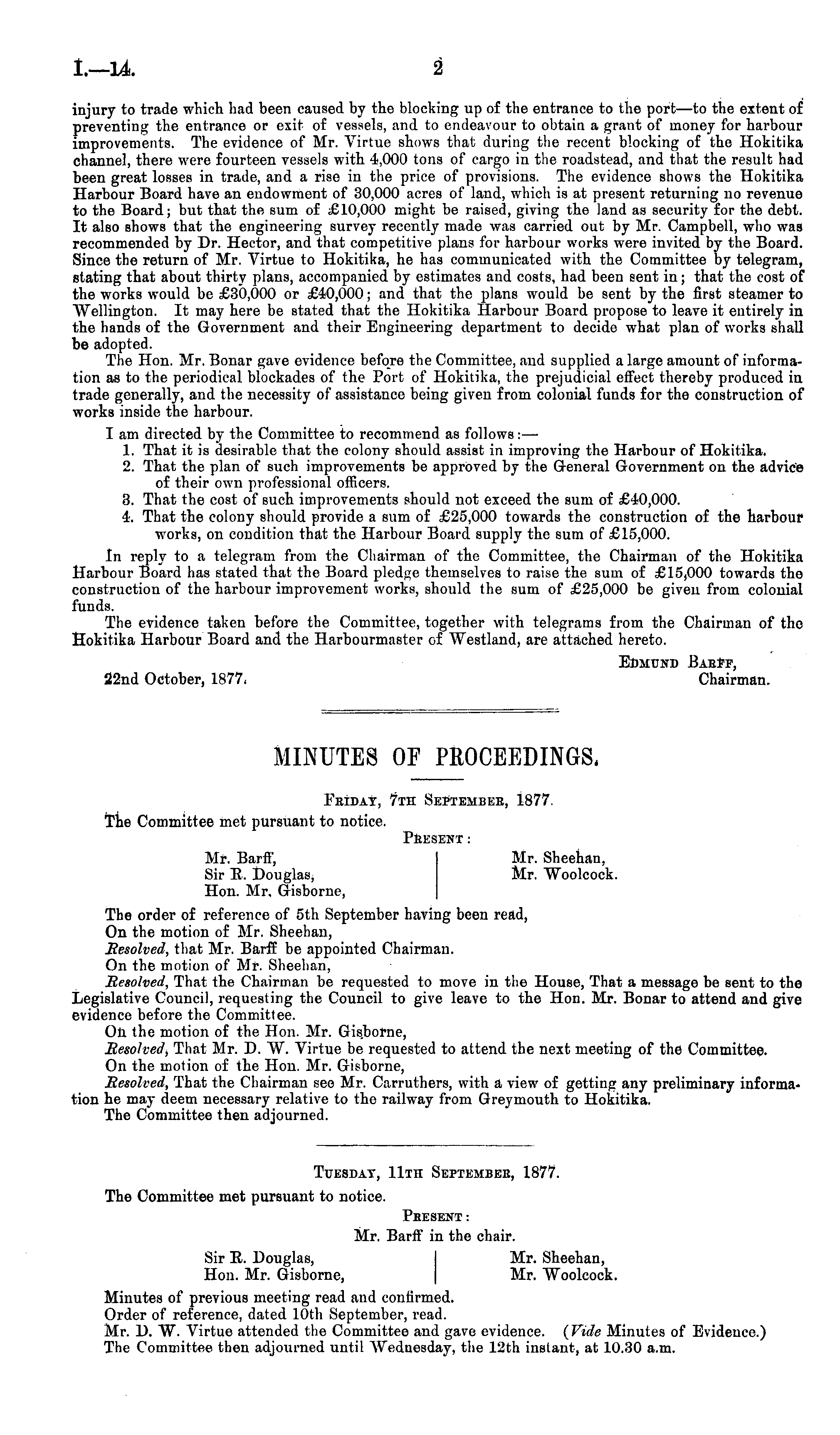 Friday, 7th September, 1877. The Committee met pursuant to notice. PfiESENT : Mr. Barft', Mr. Sheehan, Sir E. Douglas, Mr. Woolcock. Hon. Mr, Gisborne, The order of reference of sth September having been read, On the motion of Mr. Sheehan, Resolved, that Mr. Barff be appointed Chairman. On the motion of Mr. Sheehan, Resolved, That the Chairman be requested to move in the House, That a message be sent to the Legislative Council, requesting the Council to give leave to the Hon. Mr. Bonar to attend and give evidence before the Committee. On the motion of the Hon. Mr. Gisborne, Resolved, That Mr. D. W. Virtue be requested to attend the next meeting of the Committee. On the motion of the Hon. Mr. Gisborne, Resolved, That the Chairman see Mr. Carruthers, with a view of getting any preliminary information he may deem necessary relative to the railway from Greymouth to Hokitika. The Committee then adjourned.