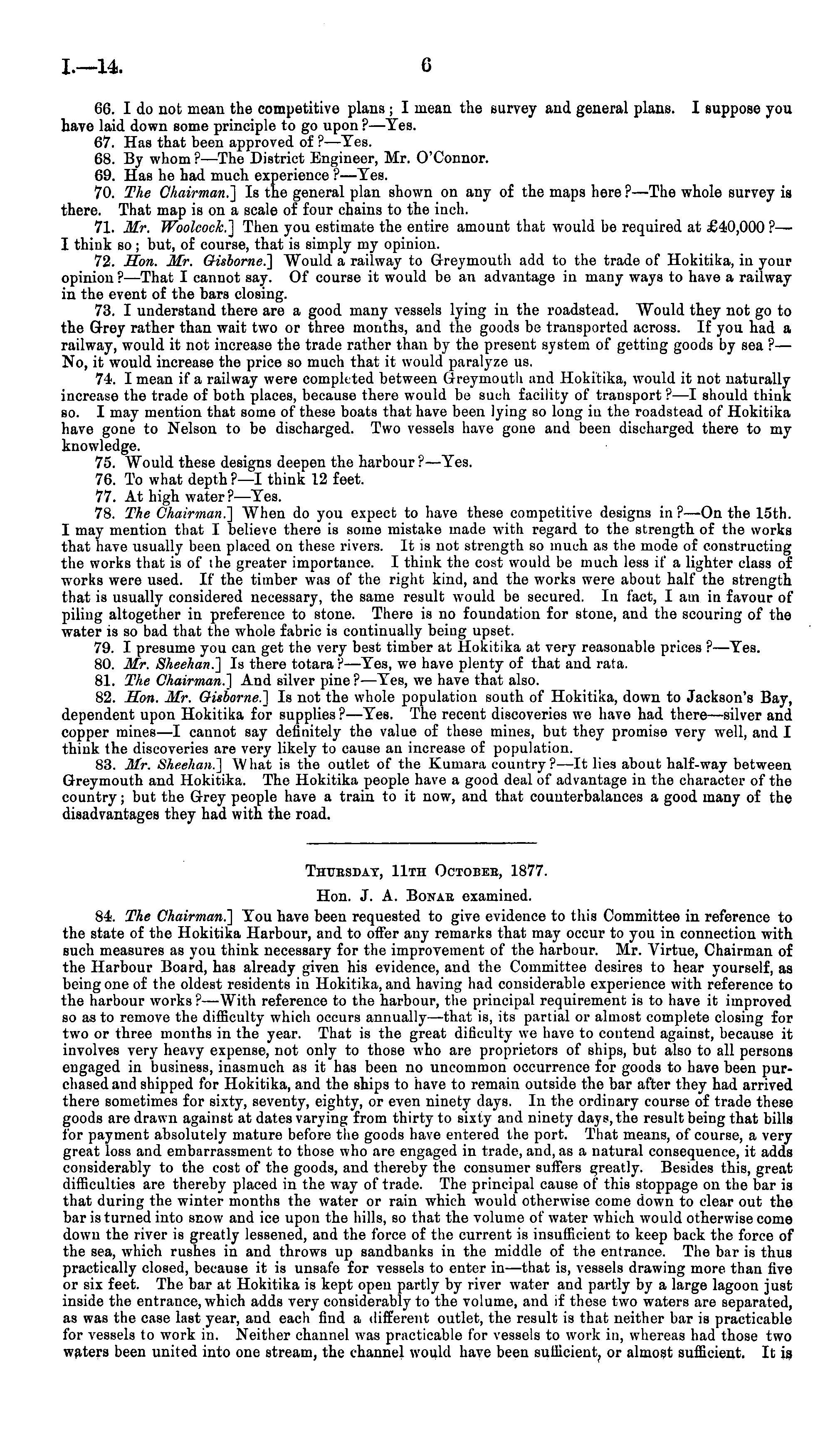 Thtjesdat, lira Octobee, 1877. Hon. J. A. Bonae examined. 84. The Chairman.] You have been requested to give evidence to this Committee in reference to the state of the Hokitika Harbour, and to offer any remarks that may occur to you in connection with such measures as you think necessary for the improvement of the harbour. Mr. Virtue, Chairman of the Harbour Board, has already given his evidence, and the Committee desires to hear yourself, as being one of the oldest residents in Hokitika, and having had considerable experience with reference to the harbour works ?—With reference to the harbour, the principal requirement is to have it improved so as to remove the difficulty which occurs annually —that is, its partial or almost complete closing for two or three months in the year. That is the great dificulty we have to contend against, because it involves very heavy expense, not only to those who are proprietors of ships, but also to all persona engaged in business, inasmuch as it has been no uncommon occurrence for goods to have been purchased and shipped for Hokitika, and the ships to have to remain outside the bar after they had arrived there sometimes for sixty, seventy, eighty, or even ninety days. In the ordinary course of trade these goods are drawn against at dates varying from thirty to sixty and ninety days, the result being that bills for payment absolutely mature before the goods have entered the port. That means, of course, a very great loss and embarrassment to those who arc engaged in trade, and, as a natural consequence, it adds considerably to the cost of the goods, and thereby the consumer suffers greatly. Besides this, great difficulties are thereby placed in the way of trade. The principal cause of this stoppage on the bar is that during the winter months the water or rain which would otherwise come down to clear out the bar is turned into snow and ice upon the hills, so that the volume of water which would otherwise come down the river is greatly lessened, and the force of the current is insufficient to keep back the force of the sea, which rushes in and throws up sandbanks in the middle of the entrance. The bar is thus practically closed, because it is unsafe for vessels to enter in—that is, vessels drawing more than five or six feet. The bar at Hokitika is kept open partly by river water and partly by a large lagoon just inside the entrance, which adds very considerably to the volume, and if these two waters are separated, as was the case last year, and each find a different outlet, the result is that neither bar is practicable for vessels to work in. Neither channel was practicable for vessels to work in, whereas had those two waters been united into one stream, the channel would have been sufficient, or almost sufficient. It is