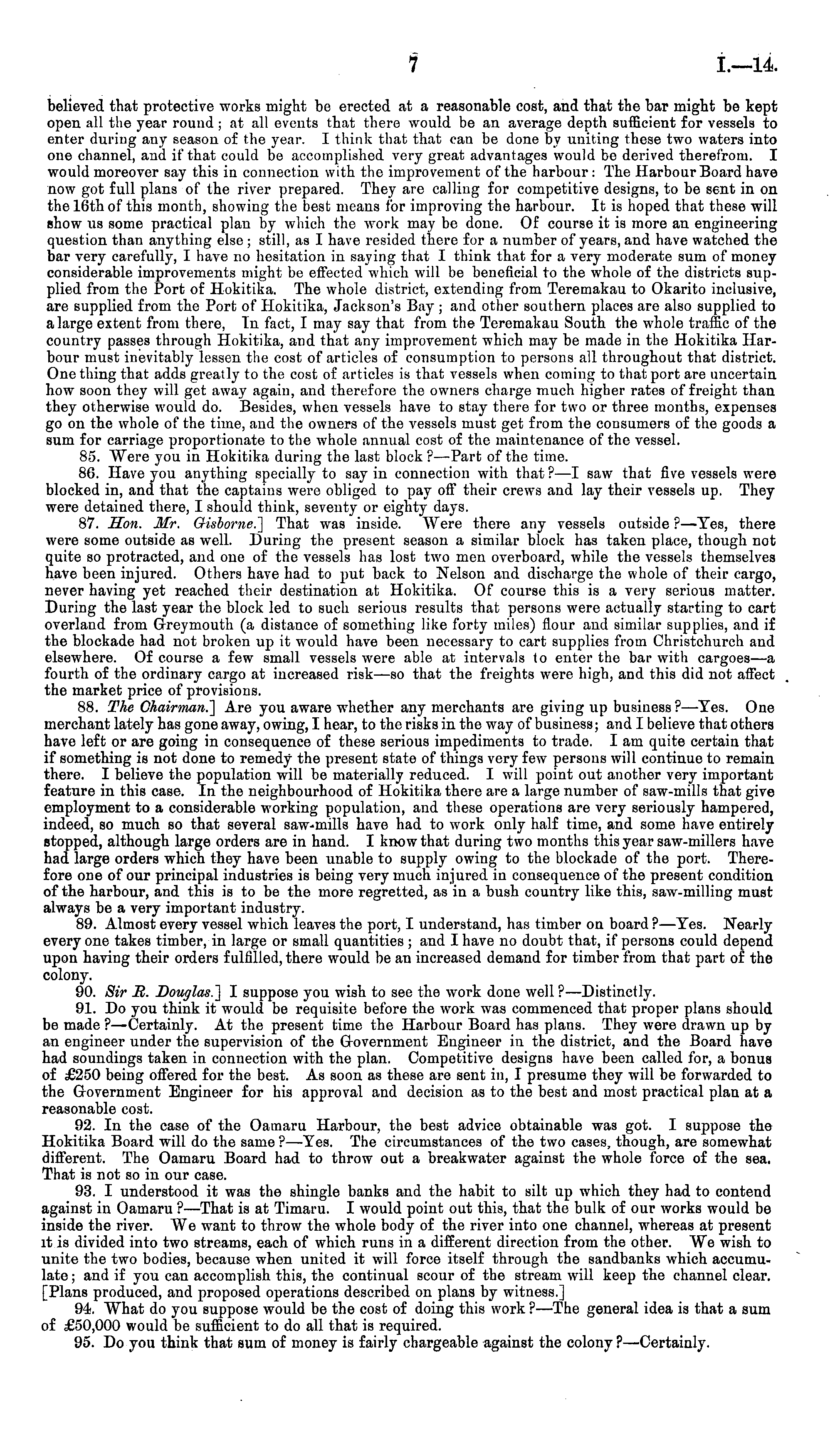 believed that protective works might be erected at a reasonable cost, and that the bar might be kept open all the year round ; at all events that there would be an average depth sufficient for vessels to enter during any season of the year. I think that that can be done by uniting these two waters into one channel, and it'that could be accomplished very great advantages would be derived therefrom. I would moreover say this in connection with the improvement of the harbour : The Harbour Board have now got full plans of the river prepared. They are calling for competitive designs, to be sent in on the 16th of this month, showing the best means for improving the harbour. It is hoped that these will show us some practical plan by which the work may be done. Of course it is more an engineering question than anything else ; still, as I have resided there for a number of years, and have watched the bar very carefully, I have no hesitation in saying that I think that for a very moderate sum of money considerable improvements might be effected which will be beneficial to the whole of the districts supplied from the Port of Hokitika. The whole district, extending from Teremakau to Okarito inclusive, are supplied from the Port of Hokitika, Jackson's Bay ; and other southern places are also supplied to a large extent from there, Tn fact, I may say that from the Teremakau South the whole traffic of the country passes through Hokitika, and that any improvement which may be made in the Hokitika Harbour must inevitably lessen the cost of articles of consumption to persons all throughout that district. One thing that adds greatly to the cost of articles is that vessels when coming to that port are uncertain how soon they will get away again, and therefore the owners charge much higher rates of freight than they otherwise would do. Besides, when vessels have to stay there for two or three months, expenses go on the whole of the time, and the owners of the vessels must get from the consumers of the goods a sum for carriage proportionate to the whole annual cost of the maintenance of the vessel. 85. Were you in Hokitika during the last block? —Part of the time. 86. Have you anything specially to say in connection with that? —I saw that five vessels were blocked in, and that the captains were obliged to pay off their crews and lay their vessels up. They were detained there, I should think, seventy or eighty days. 87. Hon. Mr. G-ishome.~\ That was inside. Were there any vessels outside ?—Yes, there were some outside as well. During the present season a similar block has taken place, though not quite so protracted, and one of the vessels has lost two men overboard, while the vessels themselves have been injured. Others have had to put back to Nelson and discharge the whole of their cargo, never having yet reached their destination at Hokitika. Of course this is a very serious matter. During the last year the block led to such serious results that persons were actually starting to cart overland from Greymouth (a distance of something like forty miles) flour and similar supplies, and if the blockade had not broken up it would have been necessary to cart supplies from Christchurch and elsewhere. Of course a few small vessels were able at intervals to enter the bar with cargoes—a fourth of the ordinary cargo at increased risk —so that the freights were high, and this did not affect the market price of provisions. 88. The Chairman^] Are you aware whether any merchants are giving up business?—Tes. One merchant lately has gone away, owing, I hear, to the risks in the way of business; and I believe that others have left or are going in consequence of these serious impediments to trade. lam quite certain that if something is not done to remedy the present state of things very few persons will continue to remain there. I believe the population will be materially reduced. I will point out another very important feature in this case. In the neighbourhood of Hokitika there are a large number of saw-mills that give employment to a considerable working population, and these operations are very seriously hampered, indeed, so much so that several saw-mills have had to work only half time, and some have entirely stopped, although large orders are in hand. I know that during two months this year saw-millers have had large orders which they have been unable to supply owing to the blockade of the port. Therefore one of our principal industries is being very much injured in consequence of the present condition of the harbour, and this is to be the more regretted, as in a bush country like this, saw-milling must always be a very important industry. 89. Almost every vessel which leaves the port, I understand, has timber on board ?—Yes. Nearly every one takes timber, in large or small quantities ; and I have no doubt that, if persons could depend upon having their orders fulfilled, there would be an increased demand for timber from that part of the colony. 90. Sir JR. Douglas.~\ I suppose you wish to see the work done well ?—Distinctly. 91. Do you think it would be requisite before the work was commenced that proper plans should be made ?—Certainly. At the present time the Harbour Board has plans. They were drawn up by an engineer under the supervision of the Government Engineer in the district, and the Board have had soundings taken in connection with the plan. Competitive designs have been called for, a bonus of £250 being offered for the best. As soon as these are sent in, I presume they will be forwarded to the Government Engineer for his approval and decision as to the best and most practical plan at a reasonable cost. 92. In the case of the Oamaru Harbour, the best advice obtainable was got. I suppose the Hokitika Board will do the same ? —Yes. The circumstances of the two cases, though, are somewhat different. The Oamaru Board had to throw out a breakwater against the whole force of the sea. That is not so 