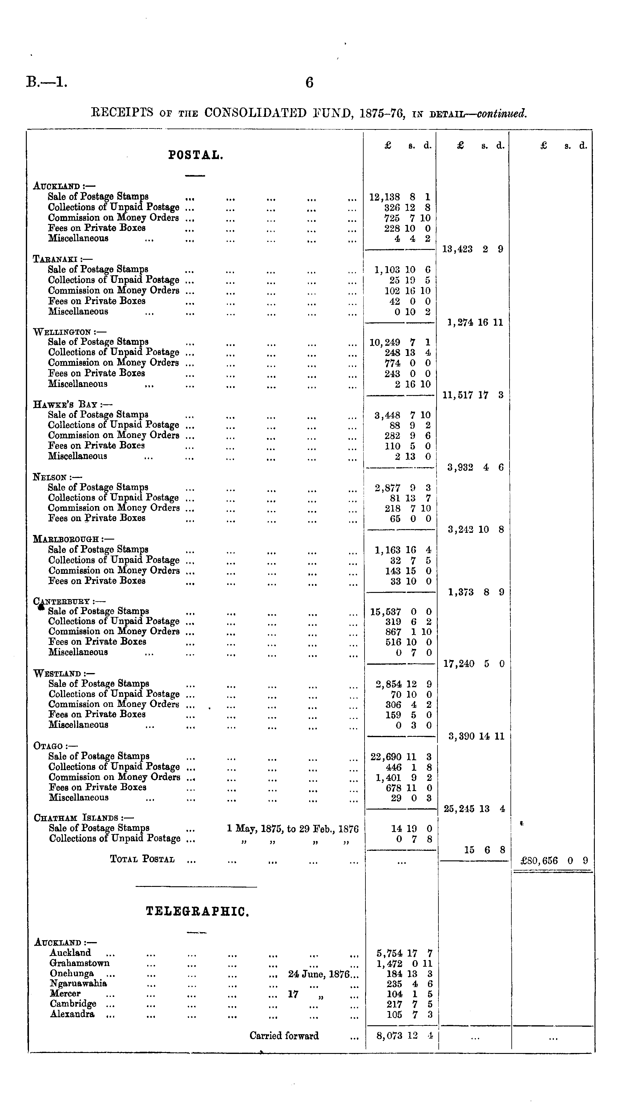 EECEIPTS of the CONSOLIDATED FUND, 875-7G, is detail — contim ued. £ s. d. £ s. d. £ s. d. POSTAL. Auckland : — Sale of Postage Stamps Collections of Unpaid Postage ... Commission on Money Orders ... Fees on Private Boxes Miscellaneous 12,138 8 1 326 12 8 725 7 10 228 10 0 4 4 2 Tabanaki :— Sale of Postage StampB Collections of Unpaid Postage ... Commission on Money Orders ... Fees on Private Boxes Miscellaneous 13,423 2 9 1,103 10 6 25 19 5 102 It! 10 42 0 0 0 10 2 1,274 16 11 Wellington : — Sale of Postage Stamps Collections of Unpaid Postage ... Commission on Money Orders ... Fees on Private Boxes Miscellaneous 10,219 1 1 248 13 4 774 0 0 243 0 0 2 16 10 Hawse's Bat :— Sale of Postage Stamps Collections of Unpaid Postage ... Commission on Money Orders ... Fees on Private Boxes Miscellaneous 11,517 17 3 3,448 7 10 88 9 2 282 9 6 110 5 0 2 13 0 3,932 4 6 Nelson :— Sale of Postage Stamps Collections of Unpaid Postage ... Commission on Money Orders ... Fees on Private Boxes 2,877 0 3 81 13 7 218 7 10 65 0 0 Maelbobottgh : — Sale of Postage Stamps Collections of Unpaid Postage ... Commission on Money Orders ... Fees on Private Boxes 3,212 10 8 1,163 16 4 32 7 5 143 15 0 33 10 0 1,373 8 9 Canteebuey : — Sale of Postage Stamps Collections of Unpaid Postago ... Commission on Money Orders ... Fees on Private Boxes Miscellaneous 15,537 0 0 319 6 2 867 1 10 516 10 0 0 7 0 Westland :— Sale of Postage Stamps Collections of Unpaid Postage ... Commission on Money Orders ... Fees on Private Boxes Miscellaneous 17,240 5 0 2,851 12 9 70 10 0 306 4 2 159 5 0 0 3 0 3,390 14 11 OlAGO :— Sale of Postage Stamps Collections of Unpaid Postage ... Commission on Money Orders ..« Fees on Private Boxes Miscellaneous 22,690 11 3 446 1 8 1,401 9 2 678 11 0 29 0 3 25,215 13 4 Chatham Islands i— Sale of Postage Stamps Collections of Unpaid Postage ... 1 May, 1875, to 29 Feb., 1376 14 19 0 0 7 8 • 15 6 8 £30,656 0 9 Total Postal ... TELEGRAPHIC. Auckland :— Auckland Grahamstown Onehunga Ngaruawalu'a Mercer Cambridge ... Alexandra ... ... 24 June, 1876... ;." 17 '■'„ ::: 5,754 17 7 1,472 0 11 184 13 3 235 4 6 104 1 5 217 7 5 105 7 3 Carried forward 8,073 12 4