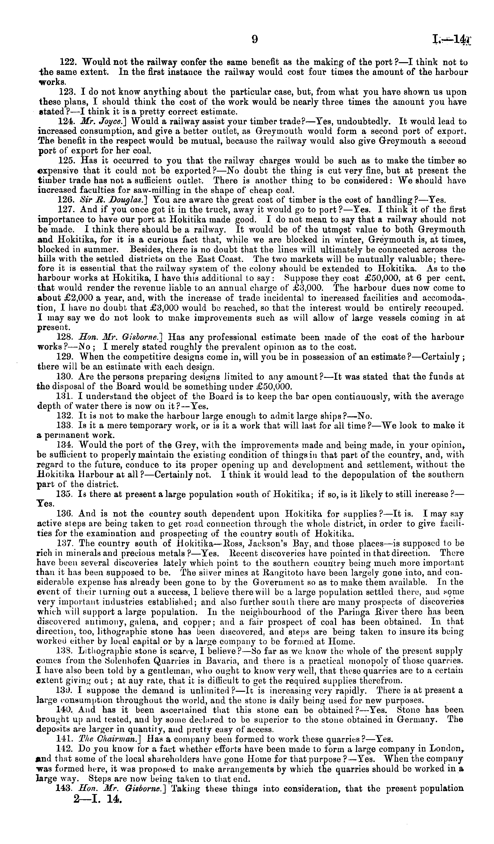 122. Would not the railway confer the same benefit as the making of the port ?—I think not to the same extent. In the first instance the railway would cost four times the amount of the harbour works. 123. I do not know anything about the particular case, but, from what you have shown us upon these plans, I should think the cost of the work would be nearly three times the amount you have stated?—l think it is a pretty correct estimate. 124. Mr. Joyce.~\ Would a railway assist your timber trade?— Yes, undoubtedly. It would lead to increased consumption, and give a better outlet, as G-reymouth would form a second port of export. The benefit in the respect would be mutual, because the railway would also give Greyniouth a second port of export for her coal. 125. Has it occurred to you that the railway charges would be such as to make the timber so expensive that it could not be exported?—No doubt the thing is cut very fine, but at present the timber trade has not a sufficient outlet. There is another thing to be considered: We should have increased faculties for saw-milling in the shape of cheap coal. 126. Sir i?. Douglas.] You aro aware the great cost of timber is the cost of handling? —Yes. 127. And if you once got it in the truck, away it would go to port ? —Yes. I think it of the first importance to have our port at Hokitika made good. I do not mean to say that a railway should not be made. I think there should be a railway. It would be of the utmost value to both Greymouth and Hokitika, for it is a curious fact that, while we are blocked in winter, Greymouth is, at times, blocked in summer. Besides, there is no doubt that the lines will ultimately be connected across the hills with the settled districts on the East Coast. The two markets will be mutually valuable; therefore it is essential that the railway system of the colony should be extended to Hokitika. As to the harbour works at Hokitika, I have this additional to say: Suppose they cost £50,000, at G per cent, that would render the revenue liable to an annual charge of £3,000. The harbour dues now come to about £2,000 a year, and, with the increase of trade incidental to increased facilities and aeeomodation, I have no doubt that £3,000 would bo reached, so that the interest would bs entirely recouped. I may say we do not look to make improvements such as will allow of large vessels coming in at present. 128. Son. ATr. Gisborne^] Has any professional estimate been made of the cost of the harbour works? —No ; I merely stated roughly the prevalent opinion as to the cost. 129. When the competitive designs come in, will you be in possession of an estimate? —Certainly ; there will be an estimate with eacli design. 180. Are the persons preparing designs limited to any amount? —It was stated that the funds at the disposal of the Board would be something under £50,000. 131. I understand the object of the Board is to keep the bar open continuously, with the average depth of water there is now on it?— Yes. 132. It is not to make the harbour large enough to admit large ships ?—No. 133. Is it a mere temporary work, or is it a work that will last for all time ? —"We look to make it a permanent work. 134. Would the port of the Grey, with the improvements made and being made, in your opinion, be sufficient to properly maintain the existing condition of things in that part of the country, and, with regard to the future, conduce to its proper opening up and development and settlement, without the Hokitika Harbour at all? —Certainly not. I think it would lead to the depopulation of the southern part of the district. 135. Is there at present a large population south of Hokitika; if so, is it likely to still increase ?— Yes. 136. And is not the country south dependent upon Hokitika for supplies ? —lt is. I may say active steps are being taken to get road connection through the whole district, in order to give facilities for the examination and prospecting of the country south of Hokitika. 137. The country south of Hokitika —Boss, Jackson's Bay, and those places —is supposed to be rich in minerals and precious metals ?—Yes. Becent discoveries have pointed in that direction. There have been several discoveries lately which point to the southern country being much more important than it has been supposed to be. The siivur mines at Bangitoto have been largely gone into, and considerable expense has already been gone to by the Government so as to make them available. In the event of their turning out a success, 1 believe there will be a large population settled there, and some very important industries established; and also further south there are many prospects of discoveries which will support a large population. In the neighbourhood of the Parings Biver there has been discovered antimony, galena, and copper; and a fair prospect of coal has been obtained. In that direction, too, lithographic stone has been discovered, and steps are being taken to insure its being worked either by local capital or by a large company to be formed at Home. 138. Lithographic stone is scarce, I believe? —So fur as we know the whole of the present supply comes from the Solenhofen Quarries in Bavaria, and there is a practical monopoly of those quarries. I have also been told by a gentleman, who ought to know very well, that these quarries are to a certain extent giving out; at any rate, that it is difficult to get the required supplies therefrom. 13J. I suppose the demand is unlimited?—lt is increasing very rapidly. There is at present a large consumption throughout the world, and the stone is daily being used for new purposes. 140. And has it been ascertained that this stone can be obtained?— Yes. Stone has been, brought up and tested, and by some; declared to be superior to the stone obtained in Germany. The deposits are larger in quantity, and pretty easy of access. 141. The Chairman^ Has a company been formed to work these quar