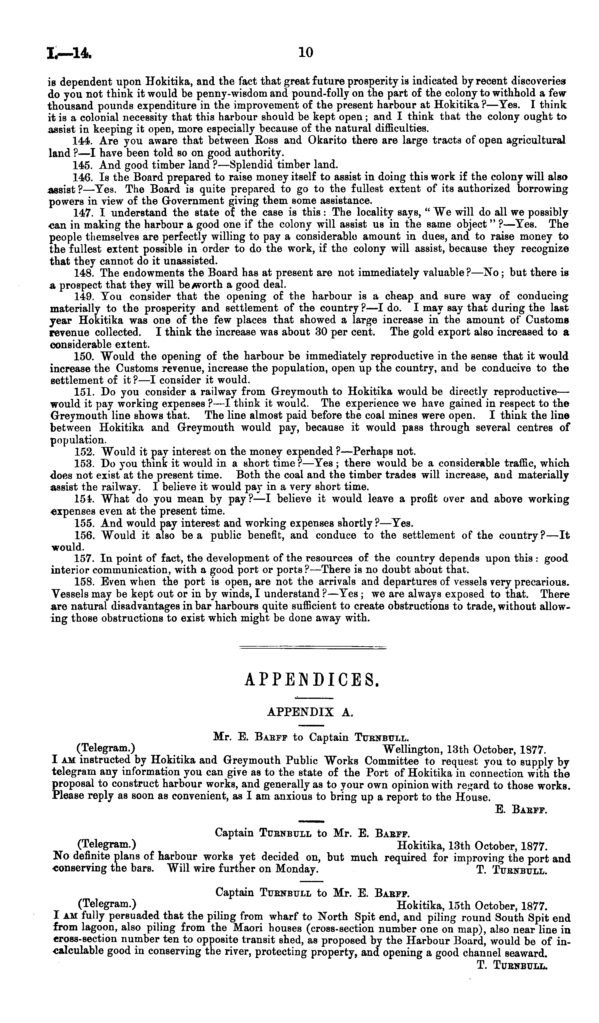 Mr. E. Baeff to Captain Tuenbull. (Telegram.) Wellington, 13th October, 1877. I am instructed by Hokitika and Greymouth Public Works Committee to request you to supply by telegram any information you can give as to the state of the Port of Hokitika in connection with the proposal to construct harbour works, and generally as to your own opinion with regard to those works. Please reply as soon as convenient, as I am anxious to bring up a report to the House. E. Baeff.