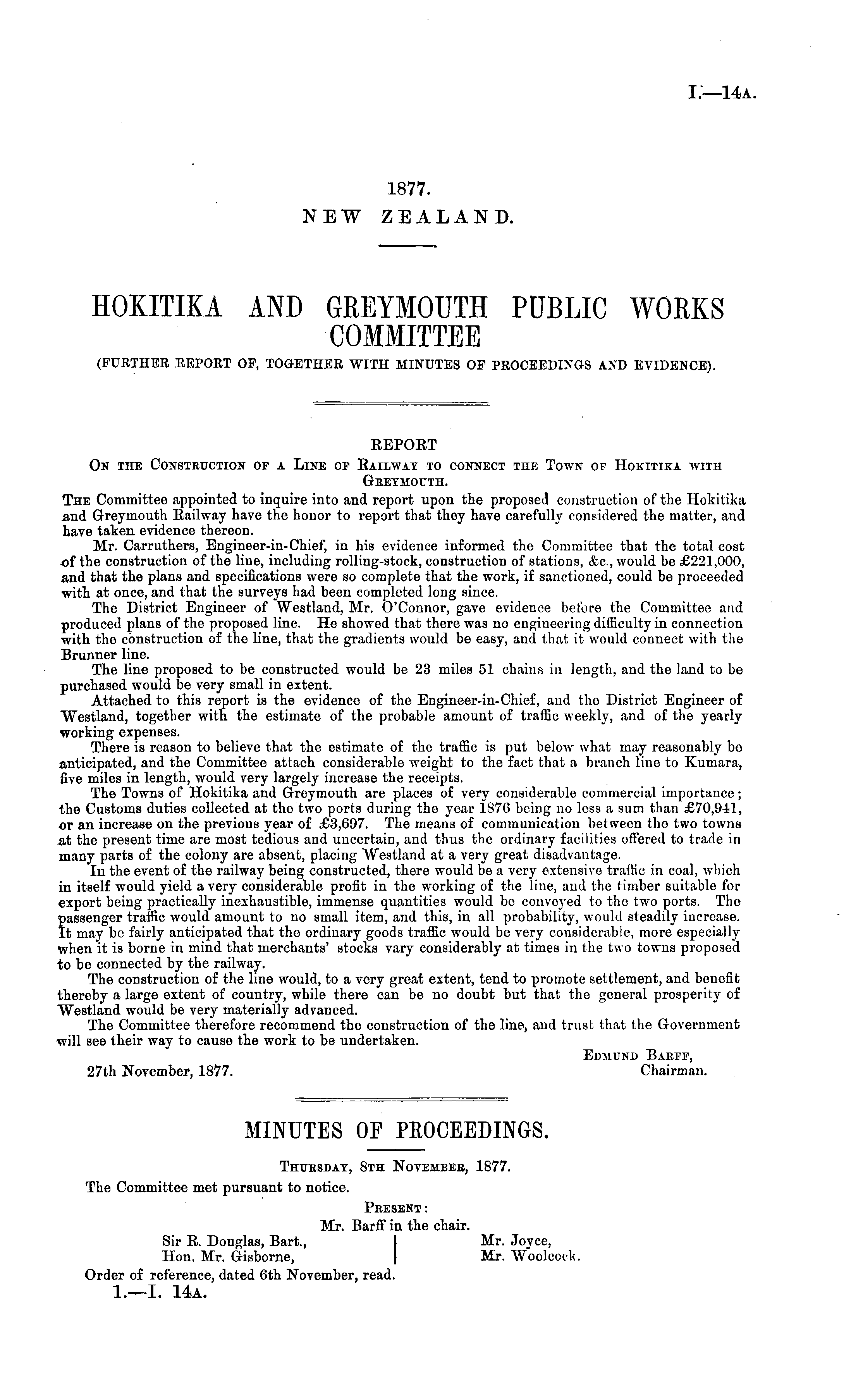Thttbsday, Bth Novembeb, 1877. The Committee met pursuant to notice. Present: Mr. Barff in the chair. Sir It. Douglas, Bart., I Mr. Joyce, Hon. Mr. G-isborne, Mr. Woolcock. Order of reference, dated 6th November, read. I.—l. 14a.