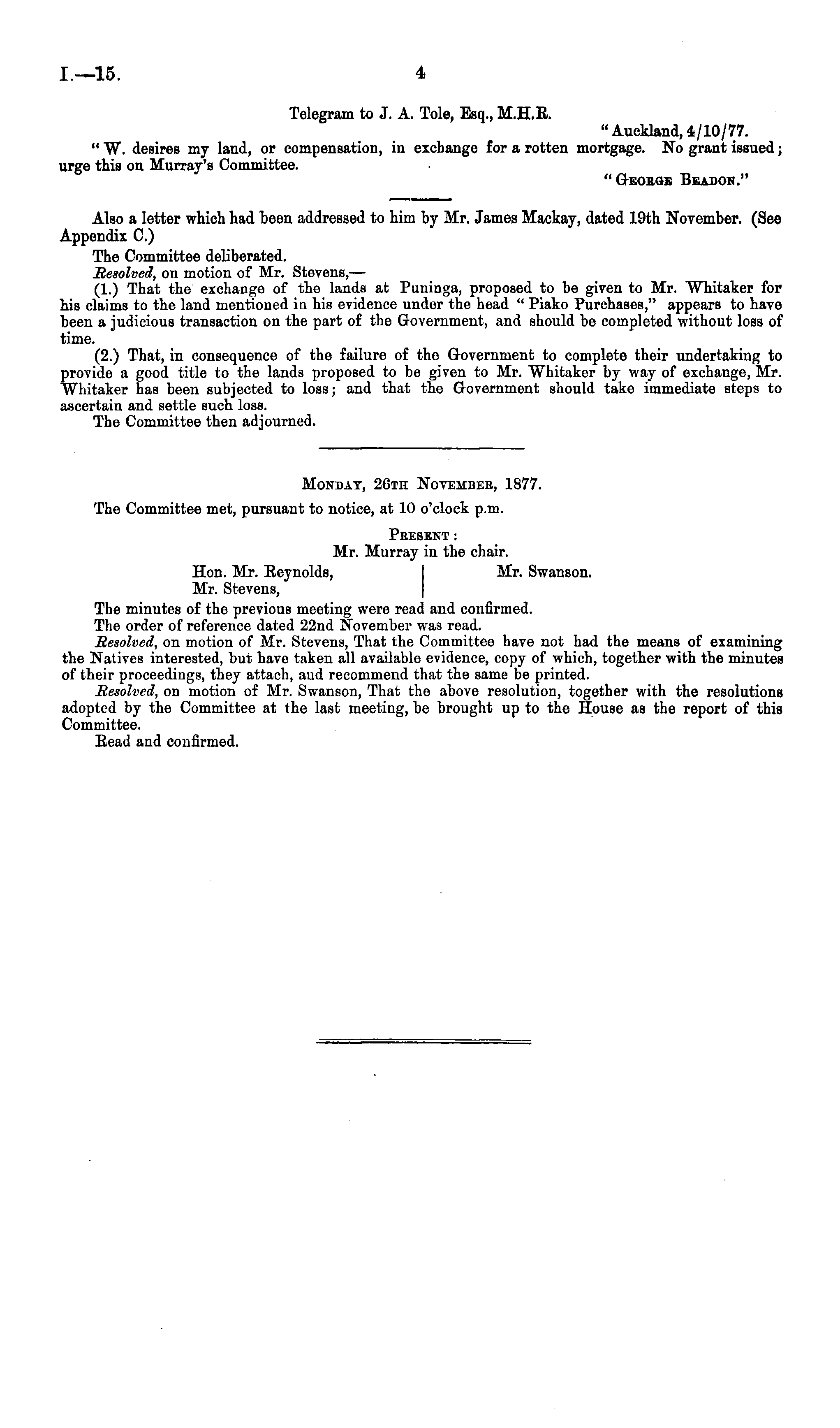 Monday, 26th November, 1877. The Committee met, pursuant to notice, at 10 o'clock p.m. Present: Mr. Murray in the chair. Hon. Mr. Reynolds, Mr. Swanson. Mr. Stevens, The minutes of the previous meeting were read and confirmed. The order of reference dated 22nd November was read. Resolved, on motion of Mr. Stevens, That the Committee have not had the means of examining the Natives interested, but have taken all available evidence, copy of which, together with the minutes of their proceedings, they attach, aud recommend that the same be printed. Resolved, on motion of Mr. Swanson, That the above resolution, together with the resolutions adopted by the Committee at the last meeting, be brought up to the House as the report of this Committee. Bead and confirmed.