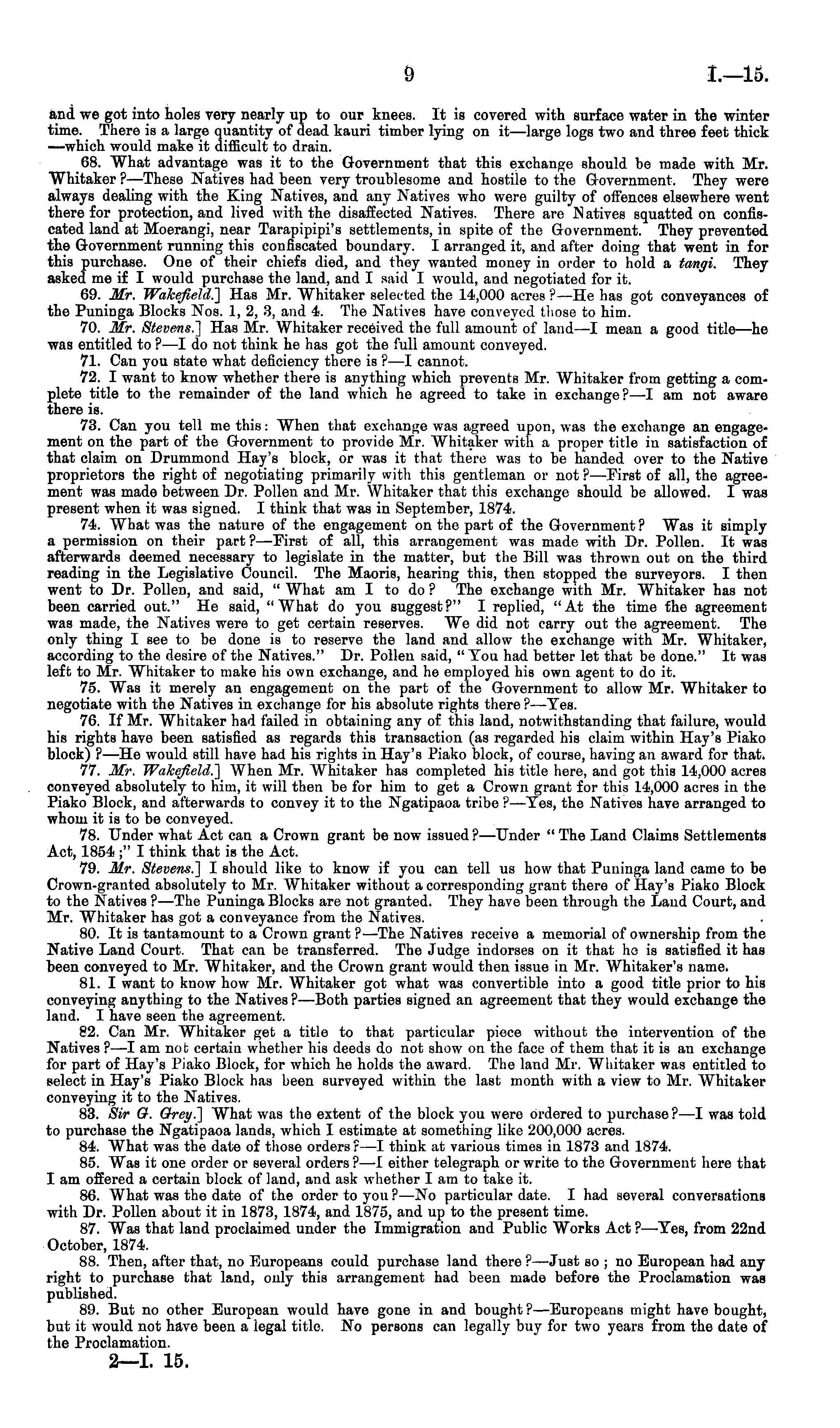 and we got into holes very nearly up to our knees. It is covered with surface water in the winter time. There is a large quantity of dead kauri timber lying on it—large logs two and three feet thick —which would make it difficult to drain. 68. What advantage was it to the Government that this exchange should be made with Mr. Whitaker ?—These Natives had been very troublesome and hostile to the Q-overnment. They were always dealing with the King Natives, and any Natives who were guilty of offences elsewhere went there for protection, and lived with the disaffected Natives. There are Natives squatted on confiscated land at Moerangi, near Tarapipipi's settlements, in spite of the Government. They prevented the Government running this confiscated boundary. I arranged it, and after doing that went in for this purchase. One of their chiefs died, and they wanted money in order to hold a tangi. They asked me if I would purchase the land, and I said I would, and negotiated for it. 69. Mr. Wakefield.] Has Mr. "Whitaker selected the 14,000 acres ?—He has got conveyances of the Puninga Blocks Nos. 1, 2, 8, and 4. The Natives have conveyed those to him. 70. Mr. Stevens.] Has Mr. Whitaker received the full amount of land—l mean a good title—he ■was entitled to ? —I do not think he has got the full amount conveyed. 71. Can you state what deficiency there is ?—I cannot. 72. I want to know whether there is anything which prevents Mr. Whitaker from getting a complete title to the remainder of the land which he agreed to take in exchange?—l am not aware there is. 73. Can you tell me this: "When that exchange was agreed upon, was the exchange an engagement on the part of the Government to provide Mr. Whitaker with a proper title in satisfaction of that claim on Drummond Hay's block, or was it that there was to be handed over to the Native proprietors the right of negotiating primarily with this gentleman or not ? —First of all, the agreement was made between Dr. Pollen and Mr. Whitaker that this exchange should be allowed. I was present when it was signed. I think that was in September, 1874. 74. What was the nature of the engagement on the part of the Government? Was it simply a permission on their part ? —First of all, this arrangement was made with Dr. Pollen. It was afterwards deemed necessary to legislate in the matter, but the Bill was thrown out on the third reading in the Legislative Council. The Maoris, hearing this, then stopped the surveyors. I then went to Dr. Pollen, and said, " What am I to do ? The exchange with Mr. Whitaker has not been carried out." He said, "What do you suggest?" I replied, "At the time the agreement was made, the Natives were to get certain reserves. We did not carry out the agreement. The only thing I see to be done is to reserve the land and allow the exchange with Mr. Whitaker, according to the desire of the Natives." Dr. Pollen said, "You had better let that be done." It was left to Mr. Whitaker to make his own exchange, and he employed his own agent to do it. 75. Was it merely an engagement on the part of the Government to allow Mr. "Whitaker to negotiate with the Natives in exchange for his absolute rights there ?—Yes. 76. If Mr. "Whitaker had failed in obtaining any of this land, notwithstanding that failure, would his rights have been satisfied as regards this transaction (as regarded his claim within Hay's Piako block) ?—He would still have had his rights in Hay's Piako block, of course, having an award for that, 77. Mr. Wakefielcl.] When Mr. Whitaker has completed his title here, and got this 14,000 acres conveyed absolutely to him, it will then be for him to get a Crown grant for this 14,000 acres in the Piako Block, and afterwards to convey it to the Ngatipaoa tribe ?—Yes, the Natives have arranged to whom it is to be conveyed. 78. Under what Act can a Crown grant be now issued ?—Under " The Land Claims Settlements Act, 1854 ;" I think that is the Act. 79. Mr. Stevens.] I should like to know if you can tell us how that Puninga land came to be Crown-granted absolutely to Mr. Whitaker without a corresponding grant there of Hay's Piako Block to the Natives ? —The Puninga Blocks are not granted. They have been through the Laud Court, and Mr. Whitaker has got a conveyance from the Natives. 80. It is tantamount to a Crown grant ? —The Natives receive a memorial of ownership from the Native Land Court. That can be transferred. The Judge indorses on it that ho is satisfied it has been conveyed to Mr. Whitaker, aud the Crown grant would then issue in Mr. Whitaker's name. 81. I want to know how Mr. Whitaker got what was convertible into a good title prior to his conveying anything to the Natives ?—Both parties signed an agreement that they would exchange the land. I have seen the agreement. 82. Can Mr. Whitaker get a title to that particular piece without the intervention of the Natives ?—I am not certain whether his deeds do not show on the face of them that it is an exchange for part of Hay's Piako Block, for which he holds the award. The land Mr. Whitaker was entitled to select in Hay's Piako Block has been surveyed within the last month with a view to Mr. Whitaker conveying it to the Natives. 83. Sir Q. Qrey.~\ What was the extent of the block you were ordered to purchase ? —I was told to purchase the Ngatipaoa lands, which I estimate at something like 200,000 acres. 84. What was the date of those orders? —I think at various times in 1873 and 1874. 85. Was it one order or several orders ?—I either telegraph or write to the Government here that I am offered a certain block of laud, and ask whether I am to take it. 86. What was the date of the order to you ?—No particular date. I had several conversations with Dr. Pollen about it in 1873, 1874, and 1875, and up to the present time. 87. Was that land proclaimed under the Immigration and Public Works Act ?—Yes, from 22nd October, 1874. 88. Then, after that, no Europeans 