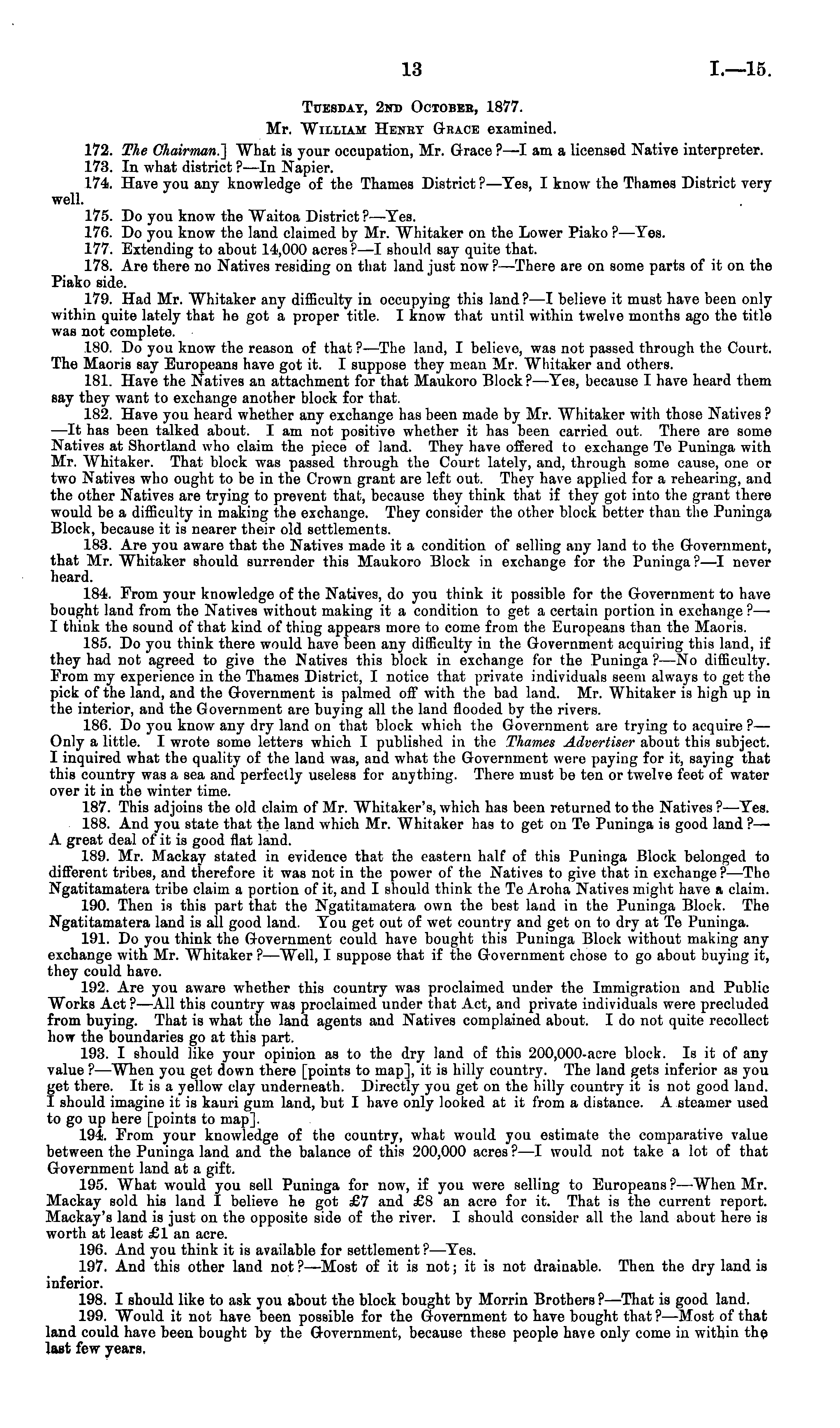 Tuesday, 2itd October, 1877. Mr. William Henky Grace examined. 172. The Chairman.~\ What is your occupation, Mr. Grace ?—I am a licensed Native interpreter. 173. In what district ? —ln Napier. 174. Have you any knowledge of the Thames District ?—Yes, I know the Thames District very well. 175. Do you know the Waitoa District ?—Yes. 176. Do you know the land claimed by Mr. Whitaker on the Lower Piako ? —Yes. 177. Extending to about 14,000 acres ? —I should say quite that. 178. Are there no Natives residing on that land just now ?—There are on some parts of it on the Piako side. 179. Had Mr. Whitaker any difficulty in occupying this land? —I believe it must have been only within quite lately that he got a proper title. I know that until within twelve months ago the title was not complete. 180. Do you know the reason of that ? —The land, I believe, was not passed through the Court. The Maoris say Europeans have got it. I suppose they mean Mr. Whitaker and others. 181. Have the Natives an attachment for that Maukoro Block? —Yes, because I have heard them say they want to exchange another block for that. 182. Have you heard whether any exchange has been made by Mr. Whitaker with those Natives ? ■ —It has been talked about. lam not positive whether it has been carried out. There are some Natives at Shortland who claim the piece of land. They have offered to exchange Te Puninga with Mr. Whitaker. That block was passed through the Court lately, and, through some cause, one or two Natives who ought to be in the Crown grant are left out. They have applied for a rehearing, and the other Natives are trying to prevent that, because they think that if they got into the grant there would be a difficulty in making the exchange. They consider the other block better than the Puninga Block, because it is nearer their old settlements. 183. Are you aware that the Natives made it a condition of selling any land to the Government, that Mr. Whitaker should surrender this Maukoro Block in exchange for the Puninga?—l never heard. 184. From your knowledge of the Natives, do you think it possible for the Government to have bought land from the Natives without making it a condition to get a certain portion in exchange?— I think the sound of that kind of thing appears more to come from the Europeans than the Maoris. 185. Do you think there would have been any difficulty in the Government acquiring this land, if they had not agreed to give the Natives this block in exchange for the Puninga ? —No difficulty. From my experience in the Thames District, I notice that private individuals seem always to get the pick of the land, and the Government is palmed off with the bad land. Mr. Whitaker is high up in the interior, and the Government are buying all the land flooded by the rivers. 186. Do you know any dry land on that block which the Government are trying to acquire ?— Only a little. I wrote some letters which I published in the Thames Advertiser about this subject. I inquired what the quality of the land was, and what the Government were paying for it, saying that this country was a sea and perfectly useless for anything. There must be ten or twelve feet of water over it in the winter time. 187. This adjoins the old claim of Mr. AVhitaker's, which has been returned to the Natives ?—Yes. 188. And you state that the land which Mr. Whitaker has to get on Te Puninga is good land ? — A great deal of it is good flat land. 189. Mr. Mackay stated in evidence that the eastern half of this Puninga Block belonged to different tribes, and therefore it was not in the power of the Natives to give that in exchange ? —The Ngatitamatera tribe claim a portion of it, and I should think the Te Aroha Natives might have a claim. 190. Then is this part that the Ngatitamatera own the best land in the Puninga Block. The Ngatitamatera land is all good land. You get out of wet country and get on to dry at Te Puninga. 191. Do you think the Government could have bought this Puiiinga Block without making any exchange with Mr. Whitaker ?—Well, I suppose that if the Government chose to go about buying it, they could have. 192. Are you aware whether this country was proclaimed under the Immigration and Public Works Act ? —All this country was proclaimed under that Act, and private individuals were precluded from buying. That is what the land agents and Natives complained about. Ido not quite recollect liovr the boundaries go at this part. 193. I should like your opinion as to the dry land of this 200,000-acre block. Is it of any value ? —When you get down there [points to map], it is hilly country. The land gets inferior as you get there. It is a yellow clay underneath. Directly you get on the hilly country it is not good laud. I should imagine it is kauri gum land, but I have only looked at it from a distance. A steamer used to go up here [points to map]. 194. From your knowledge of the country, what would you estimate the comparative value between the Puninga land and the balance of this 200,000 acres ? —I would not take a lot of that Government land at a gift. 195. What would you sell Puninga for now, if you were selling to Europeans ? —When Mr. Mackay sold his land I believe he got £7 and £8 an acre for it. That is the current report. Mackay's land is just on the opposite side of the river. I should consider all the land about here is worth at least £1 an acre. 196. And you think it is available for settlement ?—Yes. 197. And this other land not ? —Most of it is not; it is not drainable. Then the dry land is inferior. 198. I should like to ask you about the block bought by Morrin Brothers? —That is good land. 199. Would it not have been possible for the Government to have bought that ? —Most of that land could have been bought by the Q-overninent, because these people have only come in within the last few years.