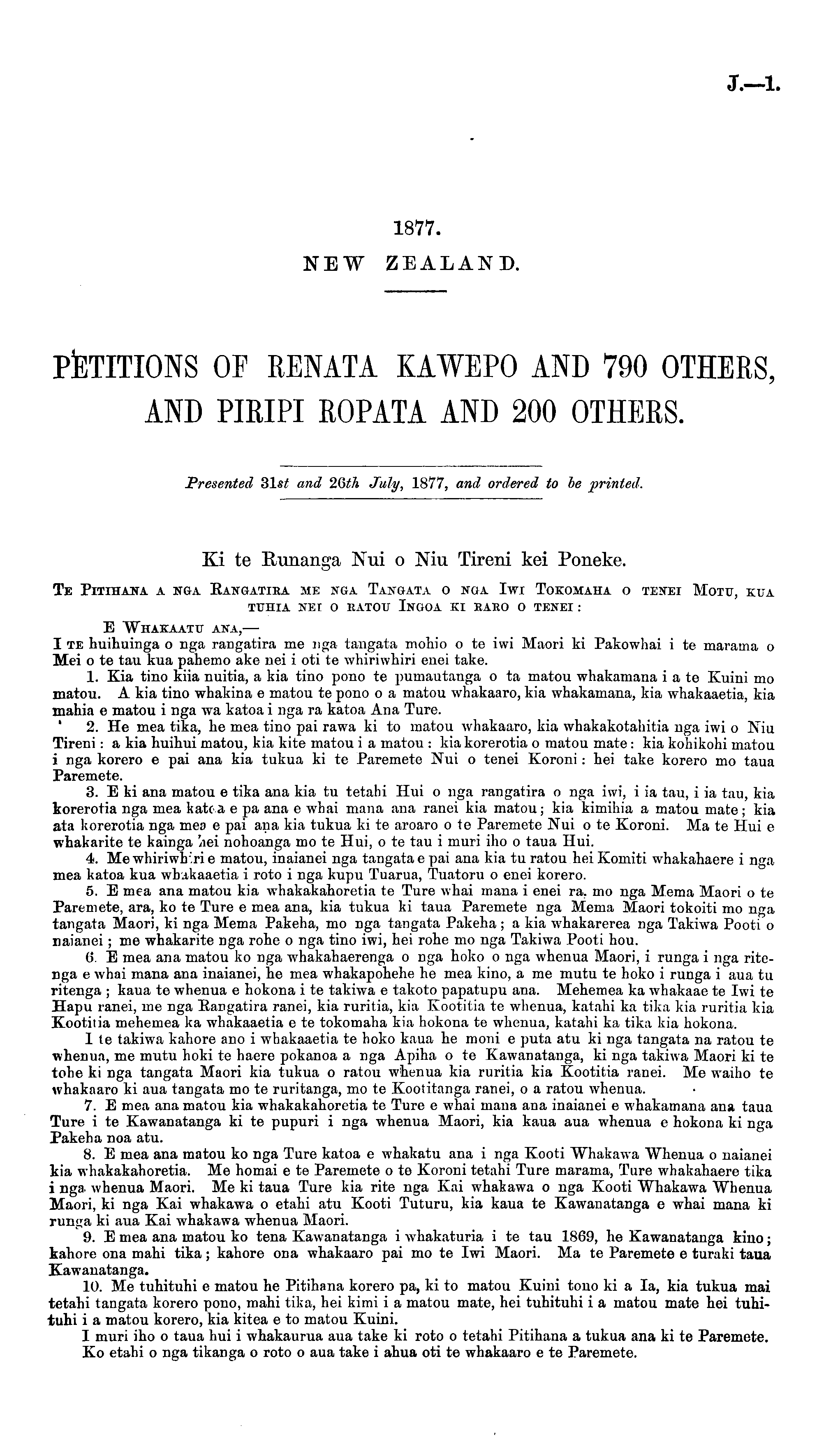 Xi te Runanga Nui o Niu Tireni kei Poneke. Te PITIHANA A UGA BaNGATIEA ME NGA TaNGATA O NOA Iwi ToKOMAHA O TEJfEI MoTU, KUA TUHIA NEI O EATOtT InGOA XI EAEO O TENEI : E WIIAKAATTT ANA, I te huihuinga o nga rangatira me nga tangata mohio o te iwi Maori ki Pakowhai i te maraina o Mci o te tau kua pahemo ake nei i oti te whiriwhiri enei take. 1. Kia tino kiia nuitia, a kia tino pono te pumautanga o ta matou whakamana i a te Kuini mo matou. A kia tino whakina c matou te pono o a matou whakaaro, kia whakamana, kia whakaaetia, kia mahia c matou i nga wa katoa i nga ra katoa Ana Ture. 2. He mea tika, he mea tino pai rawa ki to matou whakaaro, Ida whakakotahitia nga iwi o Niu Tireni: a kia huihui matou, kia kite matou i a matou : kiakorerotia o matou mate: kia kohikohi matou i nga korero c pai ana kia tukua kite Paremete Nui o tenei Koroni : hei take korero mo taua Paremete. 3. E ki ana matou c tika ana kia tv tetahi Hui o nga rangatira o nga iwi, i ia tau, i ia tau, kia torerotia nga mea katca epa ana o whai mana ana ranei kia matou; kia kimihia a matou mate; kia ata korerotia nga mea c pai ana kia tukua kite aroaro ote Paremete Nui ote Koroni. Ma te Hui c whakarite te kainga 'iei nohoanga mo te Hui, o te tau i muri iho o taua Hui. 4. Me whiriwhiri c matou, inaianei nga tangata c pai ana kia tv ratou hei Komiti whakahaere i nga mea katoa kua whukaaetia i roto i nga kupu Tuarua, Tuatoru o enei korero. 5. E mea ana matou kia whakakahoretia te Ture whai mana i enei ra. mo nga Mema Maori o te Paremete, ara, ko te Ture c mea ana, kia tukua ki taua Paremete nga Mema Maori tokoiti mo nga tangata Maori, ki nga Mema Pakeha, mo nga tangata Pakeha ; a kia whakarerea nga Takiwa Pooti o naianei; me whakarite nga rohe o nga tino iwi, hei rohe mo nga Takiwa Pooti hou. G. E mea ana matou ko nga whakahaerenga o nga hoko o nga whenua Maori, i runga i nga ritenga c whai mana ana inaianei, he mea whakapohehe he mea kino, a me mutu te hoko i runga i aua tv ritenga ; kaua te whenua c hokona ite takiwa c takoto papatupu ana. Mehemea ka whakaae te Iwi te Hapu ranei, me nga Bangatira ranei, kia ruritia, kia Kootitia te whenua, katahi ka tika kia ruritia kia Kootitia mehemea ka whakaaetia c te tokomaha kia hokona te whenua, katahi ka tika kia hokona. I te takiwa kahore ano i whakaaetia te hoko kaua he moni c puta atu ki nga tangata na ratou te whenua, me mutu hoki te haere pokanoa a nga Apiha o te Kawanatanga, ki nga takiwa Maori kite tohe ki nga tangata Maori kia tukua o ratou whenua kia ruritia kia Kootitia ranei. Me waiho te whakaaro ki aua tangata mo te ruritanga, mo te Kootitanga ranei, o a ratou whenua. 7. E mea ana matou kia whakakahoretia te Ture c whai mana ana inaianei c whakamana ana taua Ture i te Kawanatanga kite pupuri i nga whenua Maori, kia kaua aua whenua c hokona ki nga Pakeha noa atu. 8. E mea ana matou ko nga Ture katoa c whakatu ana i nga Kooti Whakawa Whenua o naianei kia whakakahoretia. Me homai etc Paremete ote Koroni tetahi Ture marama, Ture whakahaere tika i nga whenua Maori. Me ki taua Ture kia rite nga Kai whakawa o nga Kooti Whakawa Whenua Maori, ki nga Kai whakawa o etahi atu Kooti Tuturu, kia kaua te Kawanatanga c whai mana ki runga ki aua Kai whakawa whenua Maori. 9. E mea ana matou ko tena Kawanatanga i whakaturia i te tau 1869, he Kawanatanga kino; kahore ona mahi tika; kahore ona whakaaro pai mo te Iwi Maori. Ma te Paremete c turaki taua Kawanatanga. 10. Me tuhituhi c matou he Pitihana korero pa, ki to matou Kuini tono ki a la, kia tukua mai tetahi tangata korero pono, mahi tika, hei kimi i a matou mate, hei tuhituhi i a matou mate hei tuhituhi i a matou korero, kia kitea c to matou Kuini. I muri iho o taua hui i whakaurua aua take ki roto o tetahi Pitihana a tukua ana kite Paremete. Ko etahi o nga tikanga o roto o aua take i ahua oti te whakaaro c te Paremete.
