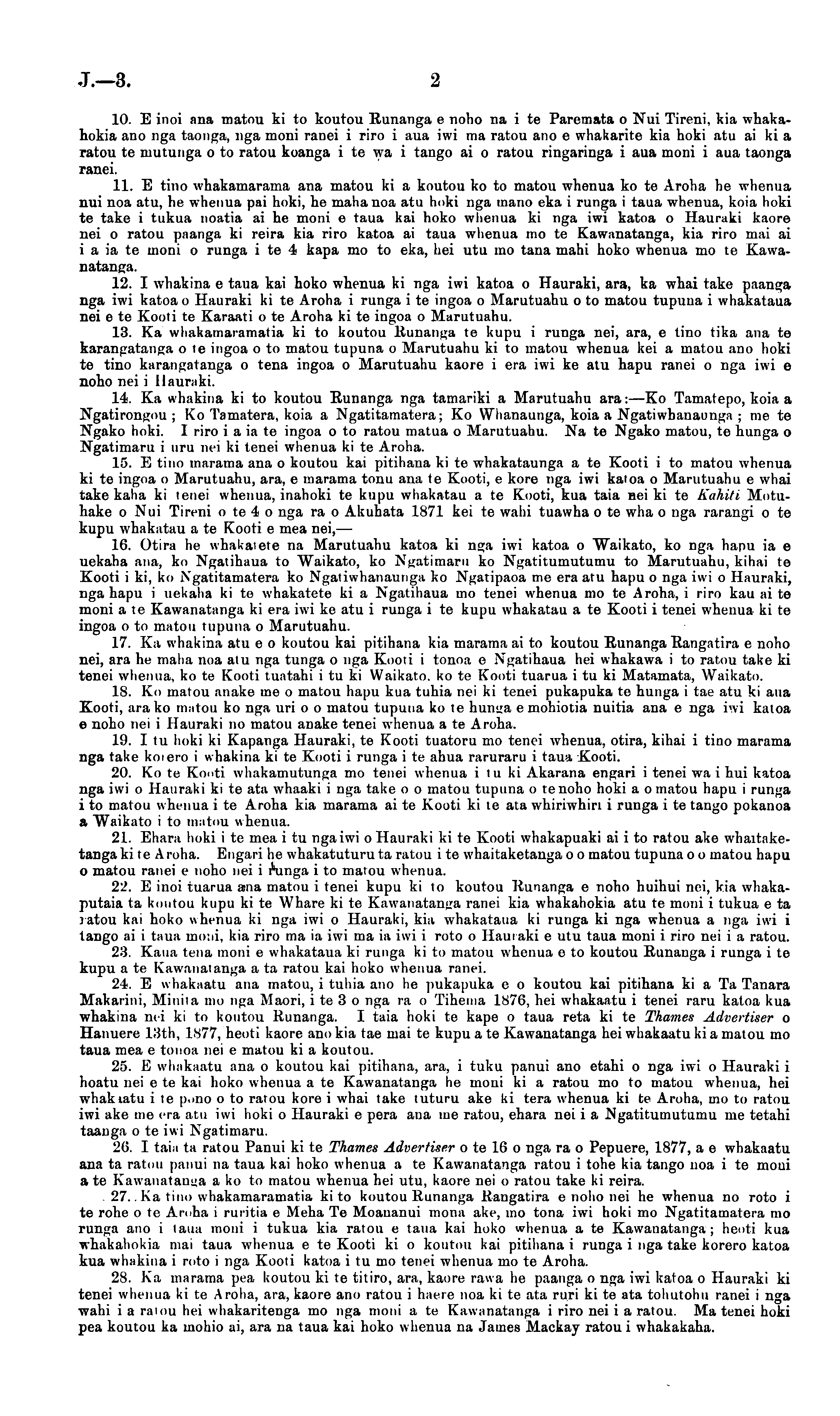 10. E inoi ana matou ki to koutou ltunanga c noho na i te Paremata o Nui Tireni, kia whakahokia ano nga taonga, nga moni ranei i riro i aua iwi ma ratou ano c whakarite kia hoki atu ai ki a ratou te mutunga o to ratou koanga i te wa i tango ai o ratou ringaringa i aua inoni i aua taonga ranei. 11. E tino whakamarama ana matou ki a koutou ko to matou whenua ko te Aroha he whenua nui noa atu, he whenua pai hoki, he mahanoa atu hoki nga inano eka i runga i taua whenua, koia hoki te take i tukua noatia ai he moni c taua kai hoko wlienua ki nga iwi katoa o Hauraki kaore nei o ratou pnanga ki reira kia riro katoa ai taua whenua mo te Kawanatanga, kia riro mai ai i a ia te uioni o runga i te 4 kapa mo to eka, hei utu tno tana mahi hoko wheuua mo te Kawanatanga. 12. I whakina c taua kai hoko whenua ki nga iwi katoa o Hauraki, ara, ka whai take paanga nga iwi katoa o Hauraki kite Aroha i runga i te ingoa o Marutuahu o to matou tupuna i whakataua nei c te Kooti te Karaati o te Aroha kite ingoa o Marutuahu. 13. Ka whakamaramatia ki to koutou liunan^a te kupu i runga nei, ara, c tino tika ana te kusngatanga o te ingoa o to matou tupuna o Marutuahu ki to matou whenua kei a matou ano hoki te tino karangatanga o tena ingoa o Marutuahu kaore i era iwi ke atu hapu ranei o nga iwi c noho nei i Hauraki. 14. Ka whakina ki to koutou Runanga nga tamariki a Marutuahu ara:—Ko Tamatepo, koia a Ngatirongou ; Ko Tamatera, koia a Ngatitamatera; Ko Whanaunga, koia a Ngatiwhanaunga ; me te Ngako hoki. I riro iaia te ingoa oto ratou matua o Marutuahu. Na te Ngako matou, te hunga o Ngatimaru i uru nei ki tenei whenua kite Aroha. 15. E tino marama ana o koutou kai pitihana kite whakataunga a te Kooti i to matou whenua kite ingoa o Marutuahu, ara, c marama tonu ana te Kooti, c kore nga iwi kaloa o Marutuahu c whai take katia ki tenei whenua, inahoki te kupu wliakatau a te Kooti, kua taia nei kite h'ahiti Motuhake o Nui Tireni o te 4 o nga ra o Akuhata 1871 kei te wahi tuawha o te wha o nga rarangi o te kupu whakatau a te Kooti c mea nei, — 16. Otira he whakatete na Marutuahu katoa ki nga iwi katoa o Waikato, ko nga hapu ia c uekaha ana, ko Ngatihaua to Waikato, ko Ngatimaru ko Ngatitumutumu to Marutuahu, kihai te Kooti i ki, ko Ngatitamatera ko Ngatiwhanaunga ko Ngatipaoa me era atu hapu o nga iwi o Hauraki, nga hapu i uekaha kite whakatete ki a Ngatihaua mo tenei whenua mo te Aroha, i riro kau ai te moni a te Kawanatanga ki era iwi ke atu i runga i te kupu whakatau a te Kooti i tenei whenua kite ingoa o to matou tupuna o Marutuahu. 17. Ka whakina atu c o koutou kai pitihana kia marama ai to koutou Runanga Rangatira c noho nei, ara he maha noa alu nga tunga o nga Kooti i tonoa c Ngatihaua hei whakawa i to ratou take ki tenei wlienua. ko te Kooti tuntahi i tv ki Waikato. ko te Kooti tuarua i tv ki Matamata, Waikato. 18. Ko matou anake me o matou hapu kua tuhia nei ki tenei pukapuka te hunga i tae atu ki aua Kooti, ara ko matou ko nga uri o o matou tupuna ko te huntia c mohiotia nuitia ana c nga iwi katoa c noho nei i Hauraki no matou anake tenei whenua a te Aroha. 19. I tv hoki ki Kapanga Hauraki, te Kooti tuatoru mo tenei whenua, otira, kihai i tino marama nga take kniero i whakina kite Kooti i runga i te ahua raruraru i taua Kooti. 20. Ko te Konti whakamutunga mo tenet whenua i tv ki Akarana engari i tenei wa i hui katoa nga iwi o Hauraki kite ata whaaki i nga take o o matou tupuna o tenoho hoki a o matou hapu i runga i to matou whenua i te Aroha kia marama ai te Kooti ki ie ata whiriwhiri i runga i te tango pokanoa a Waikato i to matou whenua. 21. Ehara hoki i te mea i tv nga iwi o Hauraki kite Kooti whakapuaki ai i to ratou ake whaitaketanga kite A roha. Engari he whakatuturu ta ratou ite whaitaketanga o o matou tupuna o o matou hapu 0 matou ranei c noho nei i lHinga i to matou whenua. 2'J. E inoi tuarua ana matou i tenei kupu ki to koutou Runanga c noho huihui npi, kia whakaputaia ta koutou kupu kite Whore kite Kawanatanga ranei kia whakahokia atu te moni i tukua c ta 1 atou kai hoko whenua ki nga iwi o Hauraki, kia whakataua ki runga ki nga whenua a nga iwi i tango ai i taua mo:ii, kia riro ma ia iwi ma ia iwi i roto o Hauraki c utu taua moni i riro nei i a ratou. 23. Katia tena moni c whakataua ki runga ki to matou whenua c to koutou Runauga i runga i te kupu a te Kawanatanga a ta ratou kai hoko whenua ranei. 24. E whakaatu ana matou, i tuliia ano he pukapuka c o koutou kai pitihana ki a Ta Tanara Makarini, Mini!a mo nga Maori, ite 3 o nga ra o Tiheiua 1576, hei whakaatu i tenei raru katoa kua whakina mi ki to koutou Runanga. I taia hoki te kape o taua reta kite Thames Advertiser o Hanuere 13th, 1577, heoti kaore ano kia tae mai te kupu a te Kawauatanga hei whakaatu ki a matou mo taua mea c tonoa nei c matou ki a koutou. 25. E whakaatu ana o koutou kai pitihana, ara, i tuku panui ano etahi o nga iwi o Ilauraki i hoatu nei c te kai hoko whenua a te Kawanatanga he moni ki a ratou mo to matou whenua, hei whakiatu ite p.mo oto ratou kore i whai take tuturu ake ki tera whenua kite Aroha, mo to ratou iwi ake me era atu iwi hoki o Hauraki c pera aua me ratou, ehara nei i a Ngatitutnutumu me tetahi taanga o te iwi Ngatimaru. 20. I taia ta ratou Panui kite Thames Advertiser o te 16 o nga ra o Pepuere, 1877, a c whakaatu ana ta ratou panui na taua kai hoko whenua a te Kawanatanga ratou i tohe kia tango noa i te moui a te Kawanatanua a ko to matou whenua hei utu, kaore nei o ratou take ki reira. 27. Ka tino whakamaramatia ki to koutou Runanga Rangatira c noho nei he whenua no roto i te rohe o te Aroha i ruiitia c Meha Te Moananui mona ake, mo tona iwi hoki mo Ngatitamatera mo runga ano i taua moni i tukua kia ratou c taua kai hoko whenua a te Kawanatanga; heoti kua whakahokia mai taua whenua c te Kooti ki o koutou kai pitihana i runga i nga take korero katoa kua whakina i roto i nga Kooti katoa i tv mo tenei whenua mo te Aroha. 28. Ka marama pea koutou kite titiro, ara, kaore rawa he paanga o nga iwi katoa o Hauraki ki te