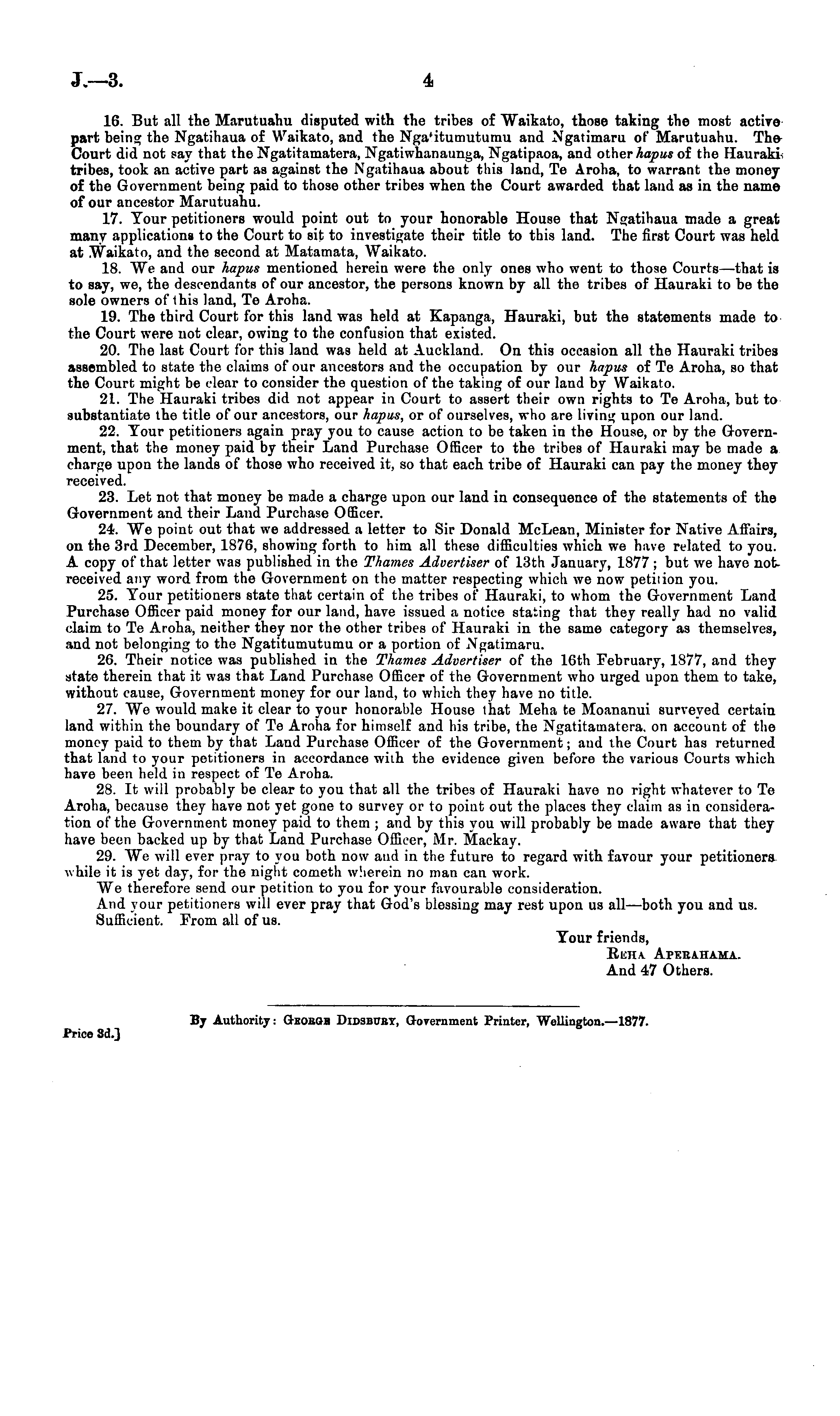 16. But all the Marutuahu disputed with the tribes of "Waikato, those taking the most active part being the Ngatitiaua of Waikato, and the Nga'itumutumu and Ngatimaru of Marutuahu. The Court did not say that the Ngatitamatera, Ngatiwhanaunga, Ngatipaoa, and other hapus of the Hauraki tribes, took an active part as against the Ngatihaua about this land, Te Aroha, to warrant the money of the Government being paid to those other tribes when the Court awarded that land as in the name of our ancestor Marutuahu. 17. Tour petitioners would point out to your honorable House that Ngatihaua made a great many applications to the Court to sit to investigate their title to this land. The first Court was held at Waikato, and the second at Matamata, Waikato. 18. We and our hapus mentioned herein were the only ones who went to those Courts —that is to say, we, the descendants of our ancestor, the persons known by all the tribes of Hauraki to be the sole owners of this land, Te Aroha. 19. The third Court for this land was held at Kapanga, Hauraki, but the statements made to the Court were not clear, owing to the confusion that existed. 20. The last Court for this land was held at Auckland. On this occasion all the Hauraki tribes assembled to state the claims of our ancestors and the occupation by our hapus of Te Aroha, so that the Court might be dear to consider the question of the taking of our land by Waikato. 21. The Hauraki tribea did not appear in Court to assert their own rights to Te Aroha, but to substantiate the title of our ancestors, our hapus, or of ourselves, who are living upon our land. 22. Tour petitioners again pray you to cause action to be taken in the House, or by the Government, that the money paid by their Land Purchase Officer to the tribes of Hauraki may be made a charge upon the lands of those who received it, so that each tribe of Hauraki can pay the money they received. 23. Let not that money be made a charge upon our land in consequence of the statements of the Government and their Land Purchase Officer. 24. We point out that we addressed a letter to Sir Donald McLean, Minister for Native Affairs, on the 3rd December, 1876, showing forth to him all these difficulties which we have related to you. A copy of that letter was published in the Thames Advertiser of 13th January, 1877 ; but we have not received any word from the Government on the matter respecting which we now petition you. 25. Tour petitioners state that certain of the tribes of Hauraki, to whom the Government Land Purchase Officer paid money for our land, have issued a notice stating that they really had no valid claim to Te Aroha, neither they nor the other tribes of Hauraki in the same category as themselves, and not belonging to the Ngatitumutumu or a portion of Ngatimaru. 26. Their notice was published in the Thames Advertiser of the 16th February, 1577, and they state therein that it was that Land Purchase Officer of the Government who urged upon them to take, without cause, Government money for our land, to which they have no title. 27. We would make it clear to your honorable House that Meha te Moananui surveyed certain land within the boundary of Te Aroha for himself and his tribe, the Ngatitamatera. on account of the money paid to them by that Land Purchase Officer of the Government; and the Court has returned that land to your petitioners in accordance with the evidence given before the various Courts which have been held in respect of Te Aroha. 28. It will probably be clear to you that all the tribes of Hauraki have no right whatever to Te Aroha, because they have not yet gone to survey or to point out the places they claim as in consideration of the Government money paid to them ; and by this you will probably be made aware that they have been backed up by that Land Purchase Officer, Mr. Mackay. 29. We will ever pray to you both now and in the future to regard with favour your petitioners it is yet day, for the night cometh wherein no man can work. We therefore send our petition to you for your favourable consideration. And your petitioners will ever pray that God's blessing may rest upon us all—both you and us. Sufficient. From all of us. Tour friends, Rkha. Aperahama. And 47 Others.