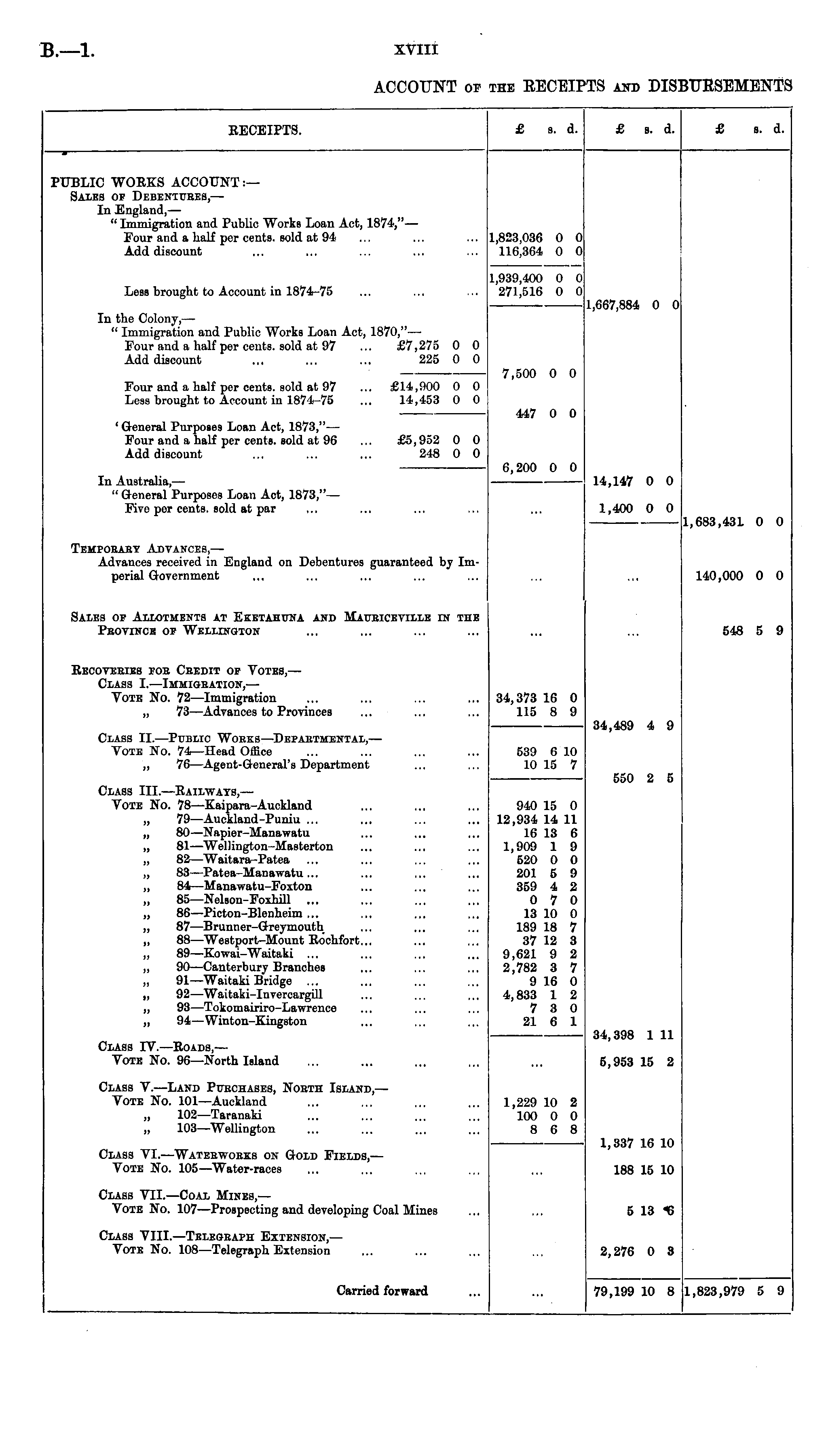 RECEIPTS. £ 8. d. £ s. d. £ s. d. PUBLIC WORKS ACCOUNT:— Sales of Debentures, — In England, — " Immigration and Public Works Loan Act, 1874," — Four and a half per cents, sold at 94 Add discount 1,823,036 0 116,364 0 Less brought to Account in 1874-75 1,939,400 0 0 271,516 0 0 1,667,884 0 0 In the Colony,— " Immigration and Public Works Loan Act, 1870," — Pour and a half per cents, sold at 97 ... £7,275 0 0 Add discount ... ... ... 225 0 0 Four and a half per cents, sold at 97 ... £14,900 0 0 Less brought to Account in 1871-75 ... 14,453 0 0 7,500 0 0 ' General Purposes Loan Act, 1873," — Four and a half per cents, sold at 96 ... £5,952 0 0 Add discount ... ... ... 248 0 0 447 0 0 6,200 0 0 In Australia, — " General Purposes Loan Act, 1873," — Five per cents, sold at par 14,147 0 0 1,400 0 0 Tempobaby Advances, — Advances received in England on Debentures guaranteed by Imperial Government 1,683,431 0 0 140,000 0 0 Sales op Allotments at Eketahuna and Maubiceville in the Pbovincb of Wellington 548 5 9 Recoyebies foe Cbedit of Votes, — Class I.—Isimigeation,— Vote No. 72 —Immigration „ 73 —Advances to Provinces 34,373 16 0 115 8 9 34,489 4 9 Class II. —Public Woeks—Departmental,— Vote No. 74 —Head Office „ 76 —Agent-General's Department 539 6 10 10 15 7 550 2 5 Class III.—Railways,— Vote No. 78 —Kaipara-Auckland „ 79 —• Auckland-Puniu ... „ 80 —Napier-Manawatu „ 81 —Wellington-Masterton „ 82—Waitara-Patea ... „ 83—Patea-Manawatu ... ,, 84 —Manawatu-Foxton „ 85—Nelson-Foxhill ... „ 86—Picton-Blenheim ... „ 87 —Brunner-Greymouth „ 88—Westport-Mount Roehfort... „ 89—Kowai-Waitaki ... „ 90 —Canterbury Branches „ 91—Waitaki Bridge ... „ 92 —Waitaki-Invercargill ,, 93 —Tokomairiro-Lawrence ,, 94 —Winton-Kingston 940 15 0 12,934 14 11 16 13 6 1,909 1 9 520 0 0 201 5 9 359 4 2 0 7 0 13 10 0 189 18 7 37 12 3 9,621 9 2 2,782 3 7 9 16 0 4,833 1 2 7 3 0 21 6 1 Class IV.—Roads, — Vote No. 96—North Island 34,398 1 11 Class V.—Land Puechases, Noeth Island, — Vote No. 101—Auckland „ 102—Taranaki „ 103—Wellington 5,953 15 2 1,229 10 2 100 0 0 8 6 8 1,337 16 10 Class VI.—Wateewoeks on Gold Fields, — Vote No. 105—Water-races 188 15 10 Class VII.—Coal Mines,— Vote No. 107 —Prospecting and developing Coal Mines 5 13 «6 Class VIII.—Telegeaph Extension, — Vote No. 108—Telegraph Extension 2,276 0 3 Carried forward 79,199 10 8 1,823,979 5 9
