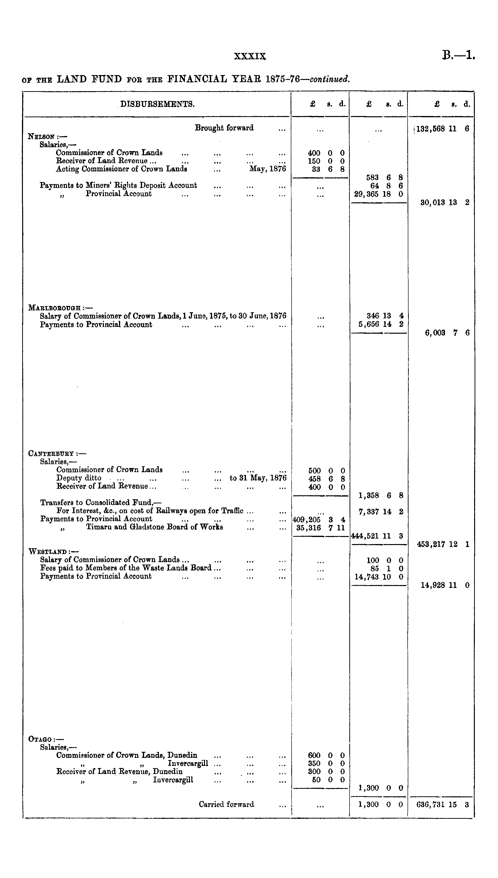 ip the LAND FUND foe the FINANCIAL YEAE 1875 '6 — continued. DISBUKSEMENTS. £ a. d. £ a. d. £ e. d. Brought forward 132,568 11 6 Nelson : — Salaries, — Commissioner of Crown Lands Receiver of Land Revenue ... Acting Commissioner of Crown Lands .., May, 1876 400 0 0 150 0 0 33 6 8 583 6 8 64 8 6 29,365 18 0 Payments to Miners' Rights Deposit Account „ Provincial Account 30,013 13 2 MARLBOBOtJGH :— Salary of Commissioner of Crown Lands, 1 June, 1875, to 30 June, 1876 Payments to Provincial Account 6,003 7 6 346 13 4 5,656 14 2 Canterbury : — Salaries, — Commissioner of Crown Lands Deputy ditto ... ... ... ... to 31 May, 1876 Receiver of Land Revenue... 453,217 12 1 500 0 0 458 6 8 400 0 0 Transfers to Consolidated Fund, — For Interest, &e., on cost of Railways open for Traffic ... Payments to Provincial Account „ Timaru and Gladstone Board of Works 409,205 3 4 35,316 7 11 1,358 6 8 7,337 14 2 444,521 11 3 WE3TLAND :— Salary of Commissioner of Crown Lands ... Fees paid to Members of the Waste Lands Board ... Payments to Provincial Account 100 0 0 85 1 0 14,743 10 0 14,928 11 0 Otago :— Salaries, — Commissioner of Crown Lands, Dunedin ,, „ Invercargill ... Receiver of Land Revenue, Dunedin „ „ Iuvercargill 600 O 0 350 0 0 300 0 0 60 0 0 1,300 0 0 Carried forward 1,300 0 0 033,731 15 3