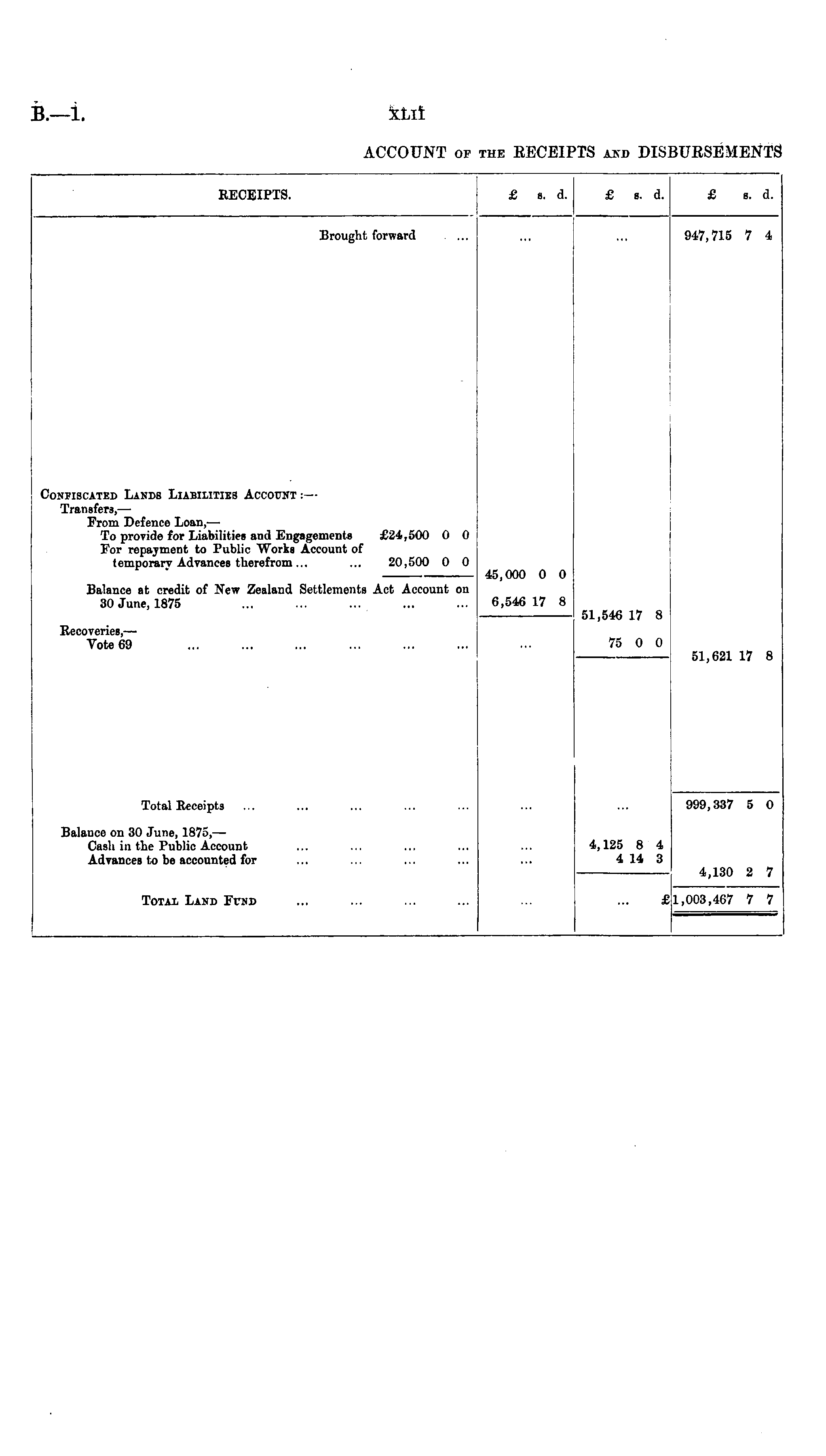 RECEIPTS. £ s. d. £ s. d. £ s. a. Brought forward 947,715 7 4 !o>-fiscated Lands Liabilities Account s— Transfers, — From Defence Loan, — To provide for Liabilities and Engagements £24,500 0 0 For repayment to Public "Works Account of temporary Advances therefrom... ... 20,500 0 0 Balance at credit of Xew Zealand Settlements Act Account on 30 June, 1875 45,000 0 0 6,546 17 8 Recoveries, — Vote 69 51,546 17 8 75 0 0 51,621 17 8 Total Receipts 999,337 5 0 Balance on 30 June, 1875, — Cash in the Public Account Advances to be accounted for 4,125 8 4 4 14 3 4,130 2 7 Total Laxd Fund 1,003,467 7 7