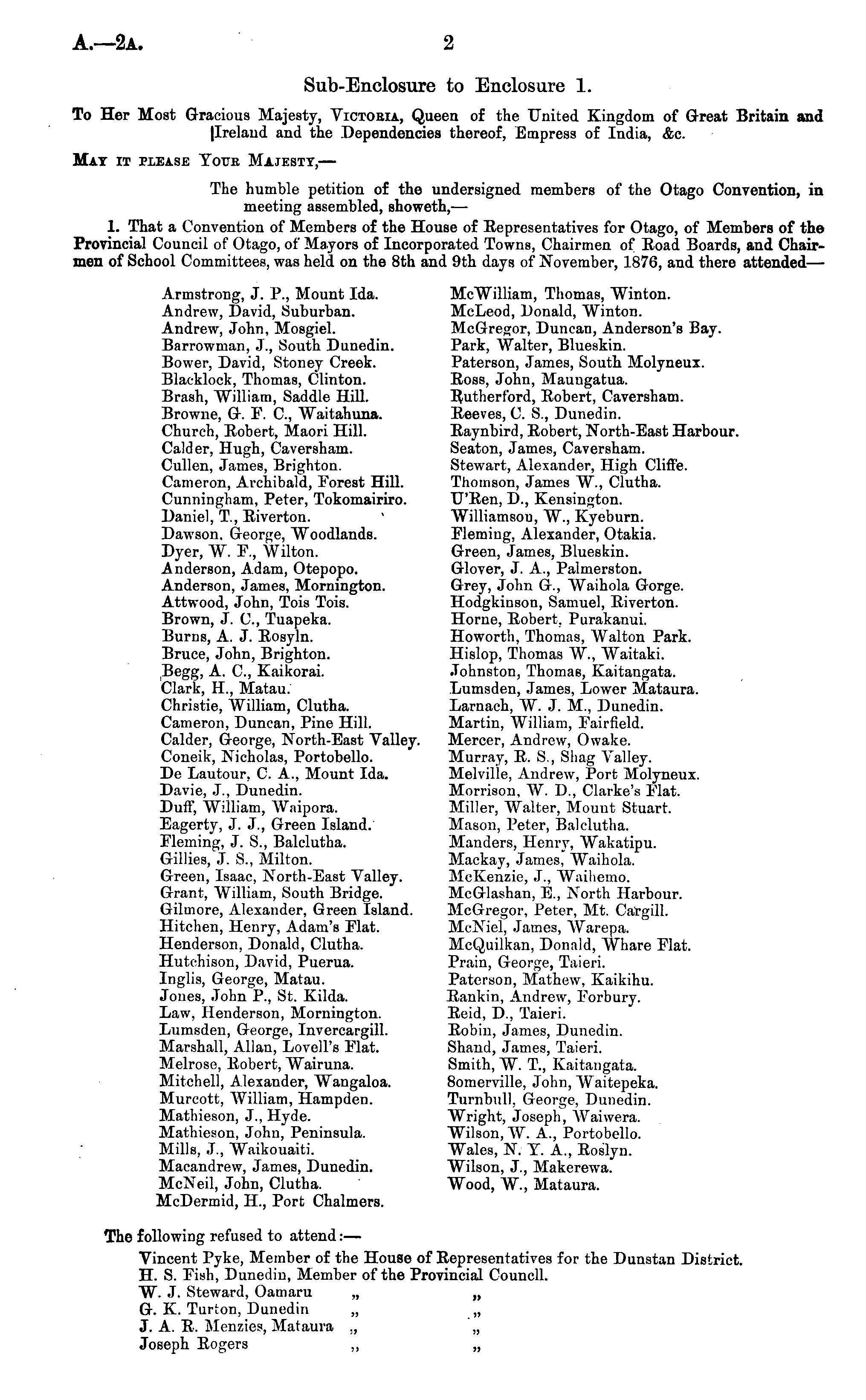 Sub-Enclosure to Enclosure 1. To Her Most Gracious Majesty, Victoria, Queen of the United Kingdom of Great Britain and |Ireland and the Dependencies thereof, Empress of India, &c. Mat it please Your Majesty,— The humble petition of the undersigned members of the Otago Convention, in meeting assembled, showeth, — 1. That a Convention of Members of the House of Eepresentatives for Otago, of Members of the Provincial Council of Otago, of Mayors of Incorporated Towns, Chairmen of Road Boards, and Chairmen of School Committees, was held on the Bth and 9th days of November, 187G, and there attended — Armstrong, J. P., Mount Ida. McWilliam, Thomas, "VVinton. Andrew, David, Suburban. McLeod, Donald, Winton. Andrew, John, Mosgiel. McGregor, Duncan, Anderson's Bay. Barrowman, J., South Dunedin. Park, Walter, Blueskin. Bower, David, Stoney Creek. Paterson, James, South Molyneux. Blacklock, Thomas, Clinton. Boss, John, Maungatua. Brash, William, Saddle Hill. Rutherford, Robert, Caversham. Browne, G. F. C, Waitahuna. Reeves, C. S., Dunedin. Church, Robert, Maori Hill. Raynbird, Robert, North-East Harbour. Calder, Hugh, Caversham. Seaton, James, Caversham. Cullen, James, Brighton. Stewart, Alexander, High Clifi'e. Cameron, Archibald, Forest Hill. Thomson, James W., Clutha. Cunningham, Peter, Tokomairiro. TJ'Ren, D., Kensington. Daniel, T., Riverton. ' Williamson, W., Kyeburn. Dawson. George, Woodlands. Fleming, Alexander, Otakia. Dyer, W. F., Wilton. Green, James, Blueskin. Anderson, Adam, Otepopo. Glover, J. A., Palmerston. Anderson, James, Mornington. Grey, John G., Waihola Gorge. Attwood, John, Tois Tois. Hodgkinson, Samuel, Riverton. Brown, J. C, Tuapeka. Home, Robert, Purakanui. Burns, A. J. Rosyln. Howorth, Thomas, Walton Park. Bruce, John, Brighton. Hislop, Thomas W., Waitaki. Begg, A. C, Kaikorai. Johnston, Thomas, Kaitangata. Clark, H, Matau. Lumsden, James, Lower Mataura. Christie, William, Clutha. Larnach, W. J. M., Dunedin. Cameron, Duncan, Pine Hill. Martin, William, Fairfield. Calder, George, North-East Valley. Mercer, Andrew, Owake. Coneik, Nicholas, Portobello. Murray, R. S., Shag Valley. De Lautour, C. A., Mount Ida. Melville, Andrew, Port Molyneux. Davie, J., Dunedin. Morrison, W. D., Clarke's Flat. Duff, William, Waipora. Miller, Walter, Mount Stuart. Eagerty, J. J., Green Island. Mason, Peter, Balclutha. Fleming, J. S., Balclutha. Manders, Henry, Wakatipu. Gillies, J. S., Milton. Mackay, James, Waihola. Green, Isaac, North-East Valley. McKenzie, J., Waihemo. Grant, William, South Bridge. McGlashan, E., North Harbour. Gilmore, Alexander, Green Island. McGregor, Peter, Mt. Cargill. Hitchen, Henry, Adam's Flat. McNiel, James, Warepa. Henderson, Donald, Clutha. McQuilkan, Donald, Whare Flat. Hutchison, David, Puerua. Pram, George, Taieri. Inglis, George, Matau. Paterson, Mathew, Kaikihu. Jones, John P., St. Kilda. Rankin, Andrew, Forbury. Law, Henderson, Mornington. Reid, D., Taieri. Lumsden, George, Invercargill. Robin, James, Dunedin. Marshall, Allan, Lovell's Flat. Shand, James, Taieri. Melrose, Robert, Wairuna. Smith, W. T., Kaitangata. Mitchell, Alexander, Wangaloa. Bomerville, John, Waitepeka. Murcott, William, Hampden. Turnbull, George, Dunedin. Mathieson, J., Hyde. Wright, Joseph, Waiwera. Mathieson, John, Peninsula. Wilson, W. A., Portobello. Mills, J., Waikouaiti. Wales, N. V. A., Roslyn. Macandrew, James, Dunedin. Wilson, J., Makerewa. McNeil, John, Clutha. Wood, W., Mataura. McDermid, H., Port Chalmers. The following refused to attend:— Vincent Pyke, Member of the House of Representatives for the Dunstan District. H. S. Fish, Dunedin, Member of the Provincial Council. W. J. Steward, Oamaru „ „ G. K. Turton, Dunedin „ „ J. A. R. Menzies, Mataura ~ „ Joseph Rogers „ „