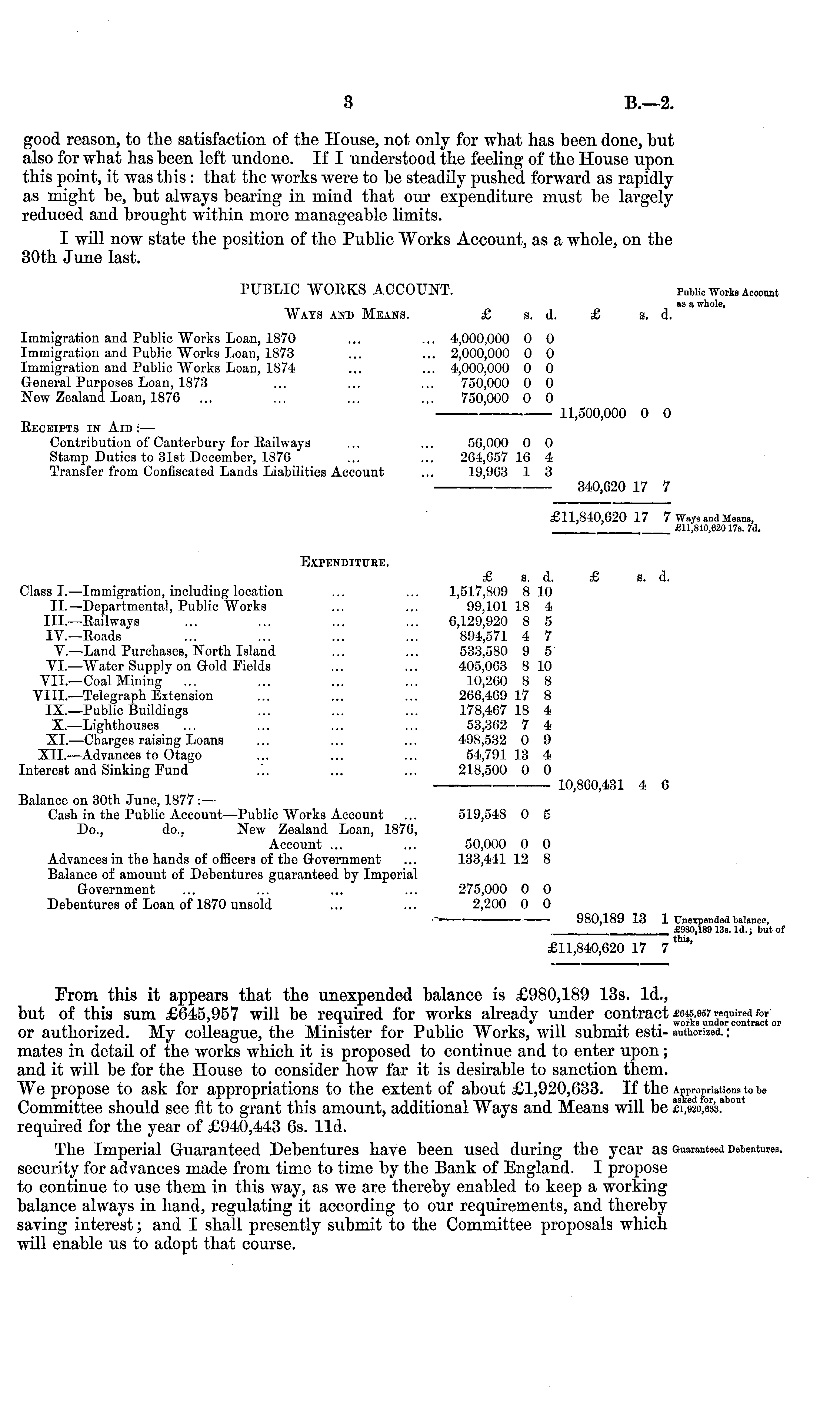 "Wats and Means. £ s. d. £ s, d. Immigration and Public "Works Loan, 1870 ... ... 4,000,000 0 0 Immigration and Public "Works Loan, 1873 ... ... 2,000,000 0 0 Immigration and Public Works Loan, 1874 ... ... 4,000,000 0 0 General Purposes Loan, 1873 ... ... ... 750,000 0 0 New Zealand Loan, 1876 ... ... ... ... 750,000 0 0 11,500,000 0 0 Receipts in Aid :— Contribution of Canterbury for Railways ... ... 56,000 0 0 Stamp Duties to 31st December, 1876 ... ... 204,657 16 4 Transfer from Confiscated Lands Liabilities Account ... 19,963 1 3 340,620 17 7 £11,840,620 17 7 » Expenditure. £ a. d. £ s. d. Class I. —Immigration, including location ... ... 1,517,809 8 10 II—Departmental, Public Works ... ... 99,101 18 4 III.—Railways ... ... ... ... 6,129,920 8 5 IV.—Roads ... ... ... ... 894,571 4 7 V.—Land Purchases, North Island ... ... 533,580 9 5 VI.—Water Supply on Gold Fields ... ... 405,003 8 10 VII—Coal Mining ... ... ... ... 10,260 8 8 VIII.—Telegraph Extension ... ... ... 266,469 17 8 IX.—Public Buildings ... ... ... 178,467 18 4 X.—Lighthouses ... ... ... ... 53,362 7 4 XL—Charges raising Loans ... ... ... 498,532 0 9 XII.—Advances to Otago ... ... ... 54,79113 4 Interest and Sinking Fund .'.. ... ... 218,500 0 0 10,800,431 4 6 Balance on 30th June, 1877 :— Cash in the Public Account —Public Works Account ... 519,548 0 5 Do., do., New Zealand Loan, 1876, Account ... ... 50,000 0 0 Advances in the hands of officers of the Government ... 133,441 12 8 Balance of amount of Debentures guaranteed by Imperial Government ... ... ... ... 275,000 0 0 Debentures of Loan of 1870 unsold ... ... 2,200 0 0 ■-> 980,189 13 li £11,840,620 17 7 '