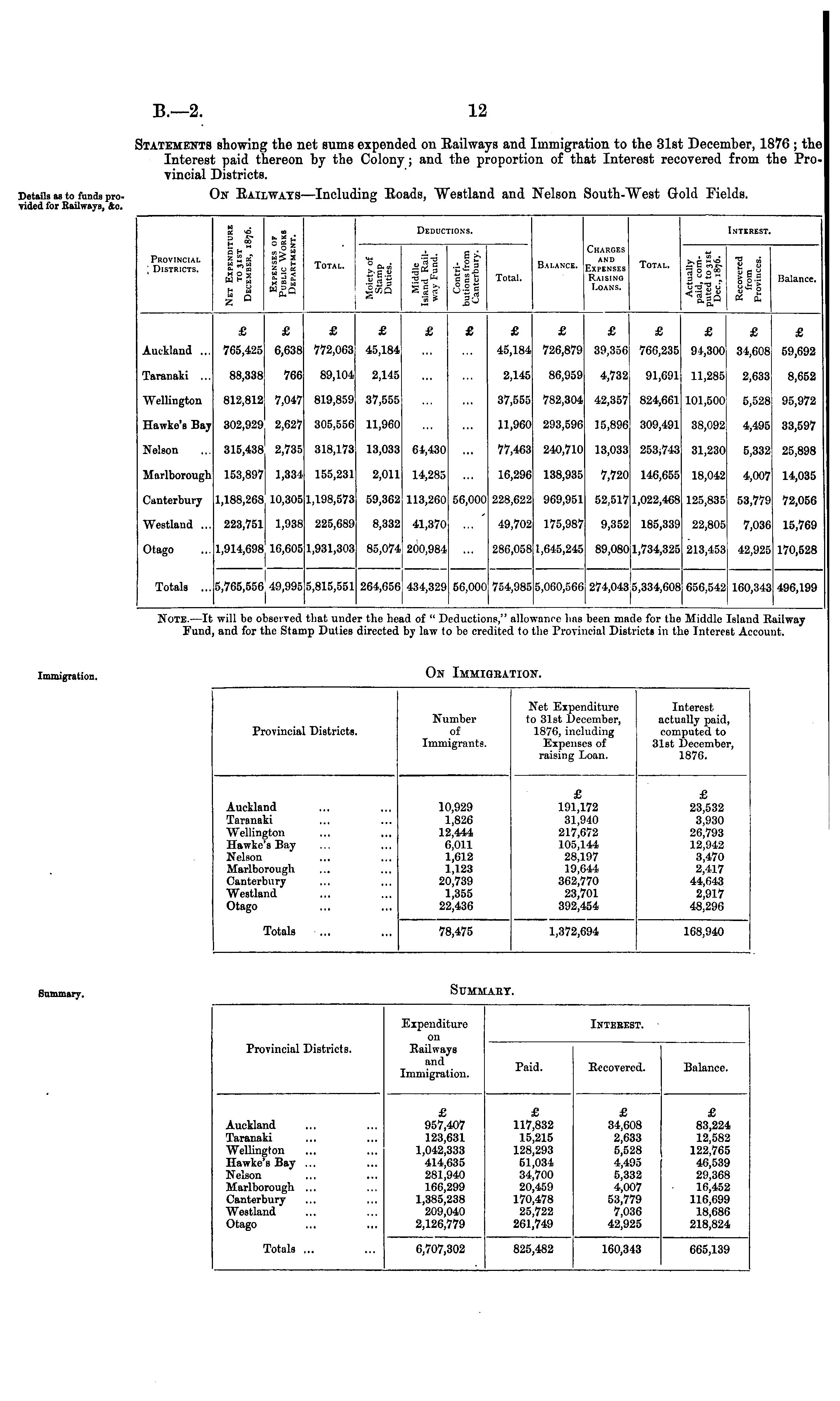 Provincial Districts. Expenditure on Railways and Immigration. Ixtebest. Paid. Recovered. Balance. Auckland Taranaki Wellington Hawke's Bay ... Kelson Marlborough ... Canterbury Westland Otago £ 957,407 123,631 1,042,333 414,635 281,940 166,299 1,385,238 209,040 2,126,779 £ 117,832 15,215 128,293 51,034 34,700 20,459 170,478 25,722 261,749 £ 34,608 2,633 5,528 4,495 5,332 4,007 53,779 7,036 42,925 £ 83,224 12,582 122,765 46,539 29,368 16,452 116,699 18,680 218,824 Totals ... 6,707,302 825,482 160,343 605,139