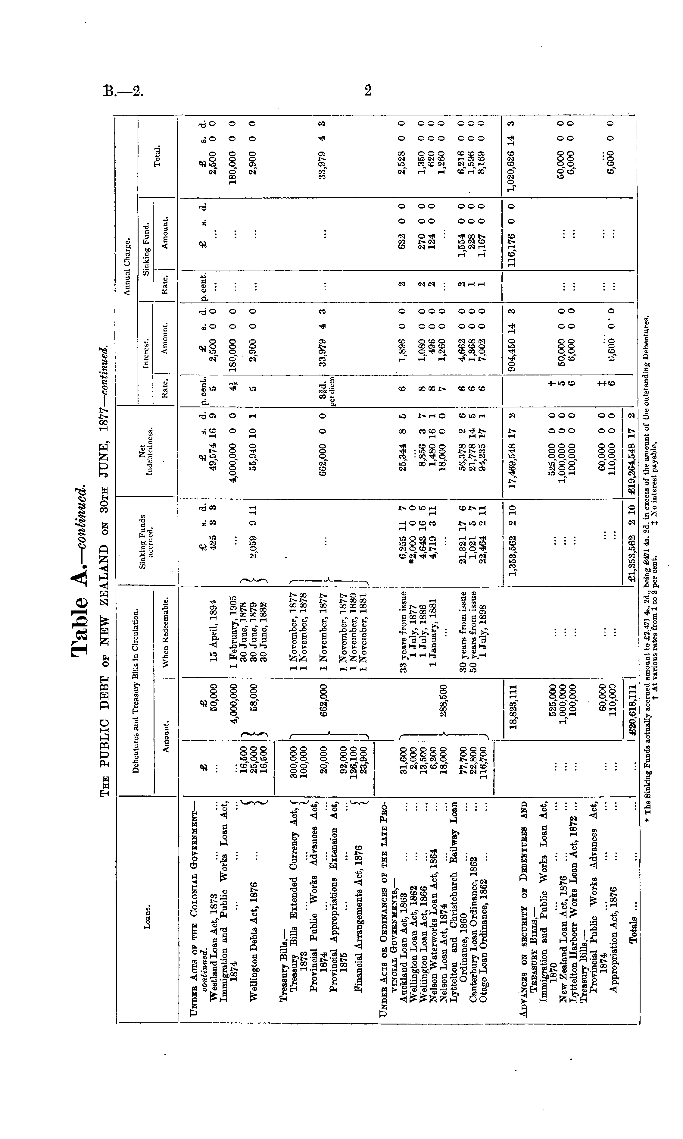 Tclble A. — continued. The PUBLIC DEBT of NEW ZEALAND on 30th JUNE, 1877— continued. Loans. Debentures and Treasury Bills in Circulation. Amount. When Redeemable. Sinking Funds accrued. Nel Interest. Annual Charge. Sinking Fund. Amount. Rate. Amount. Rate. Amount. Total. Under Acts of tiie Colonial Government — continued. Westland Loan Act, 1873 Immigration and Public Works Loan Act, 1874 Wellington Debts Act, 1876 ... j £ 16,500 25,000 16,500 £ 50,000 4,000,000 15 April, 1894 1 February, 1905 30 June, 1878 30 June, 1879 30 June, 1882 £ s. d. 425 3 3 £ s. d. 49,574 16 9 4,000,000 0 0 p. cent. 5 4\ £ s. d. 2,500 0 0 180,000 0 0 p. cent. £ s. d. £ s. d. 2,500 0 0 180,000 0 0 I 58,000 } 2,059 9 11 55,940 10 1 5 2,900 0 0 2,900 0 0 Treasury Bills, — Treasury Bills Extended Currency Act, ( 1873 ... ... I Provincial Public Works Advances Act, 1874 Provincial Appropriations Extension Act, 1875 Financial Arrangements Act, 1876 300,000 100,000 20,000 662,000 1 November, 1877 1 November, 1878 1 November, 1877 1 i 662,000 0 0 3fd. per diem 33,979 4 3 33,979 4 3 92,000 126,100 23,900 1 November, 1877 1 November, 1880 1 November, 1881 Under Acts or Ordinances of the late Provincial Governments, — ■ Auckland Loan Act, 1863 Wellington Loan Act, 1862 Wellington Loan Act, 1866 Nelson Waterworks Loan Act, 1864 Nelson Loan Act, 1874 Lyttelton and Christchurch Railway Loan Ordinance, 1860 Canterbury Loan Ordinance, 1862 Otago Loan Ordinance, 1862 33 vears from issue "l July, 1877 1 July, 1886 1 January, 1881 6,255 11 7 *2,000 0 0 4,643 16 5 4,719 3 11 25,344 8 5 2,528 0 0 31,600 2,000 13,500 6,200 18,000 8,856 3 7 1,480 16 1 18,000 0 0 6 8 8 7 1,896 0 0 1,080 0 0 496 0 0 1,260 0 0 2 2 2 632 0 0 270 0 0 124 0 0 1,350 0 0 620 0 0 1,260 0 0 288,500 77,700 22,800 116,700 30 years from issue 50 years from issue 1 July, 1898 21,321 17 6 1,021 5 7 22,464 2 11 56,378 2 6 21,778 14 5 94,235 17 1 6 6 6 4,662 0 0 1,368 0 0 7,002 0 0 2 1 1 1,554 0 0 228 0 0 1,167 0 0 6,216 0 0 1,596 0 0 8,169 0 0 : I 116,176 0 0 1,020,626 14 3 Advances on security of Debentures and Treasury Bills, — Immigration and Public Works Loan Act, 1870 New Zealand Loan Act, 1876 Lyttelton Harbour Works Loan Act, 1872 ... Treasury Bills, — Provincial Public Works Advances Act, 1874 Appropriation Act, 1876 18,823,111 1,353,562 2 10 17,469,548 17 2 901,150 14 3 525,000 1,000,000 100,000 525,000 0 0 1,000,000 0 0 100,000 0 0 + 5 6 50,000 0 0 6,000 0 0 50,000 0 0 6,000 0 0 60,000 110,000 £20,618,111 60,000 0 0 110,000 0 0 6 t!,600 0 ' 0 6,600 0 0 ... Totals ... £1,353,562 2 10 £19,264,548 17 2 * The Sinking Funds actually accrued amount to £2,471 4s. 2d., being £471 4s. 2d. in excess of the amount of the outstanding Debentures, t At various rates from 1 to 2 per cent. J N/o interest payable.