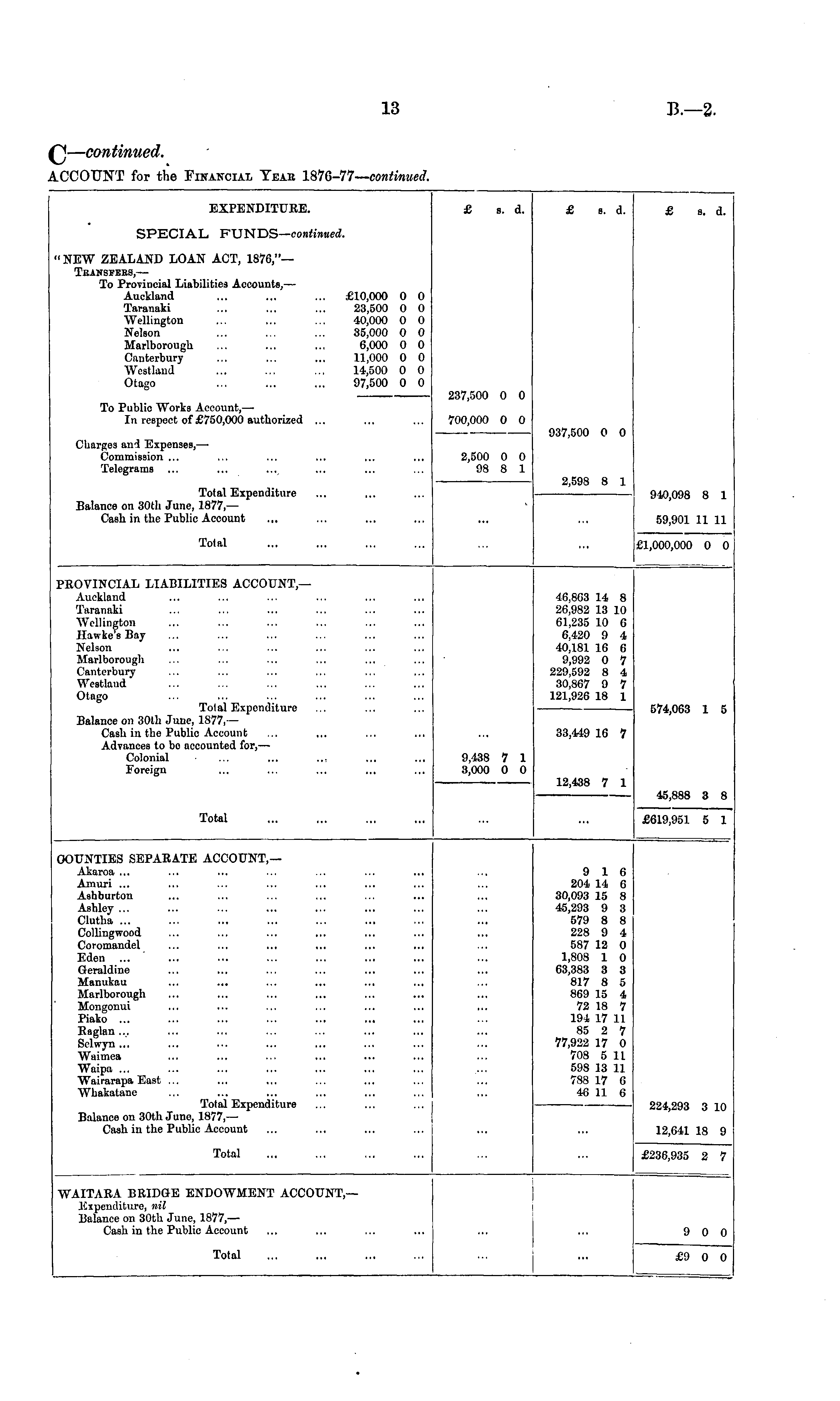 ~) — continued. CCOTTNT for the Financial Yeae 1816-77—continued. EXPENDITURE. £ s. d. £ s. d. £ s. d. SPECIAL FUNDS— continued. "NEW ZEALAND LOAN ACT, 1876,"— Transfers, — To Provincial Liabilities Accounts, — Auckland ... ... ... ; Taranaki Wellington Nelson Marlborough Canterbury Westlaud Otago £10,000 0 0 23,500 O O 40,000 0 O 35,000 0 0 6,000 0 0 11,000 0 0 14,500 0 0 97,500 0 0 237,500 0 0 To Public Works Account, — In respect of £750,000 authorized ... 700,000 0 0 Charges and Expenses, — Commission ... Telegrams 937,500 0 0 2,500 0 0 98 8 1 2,598 8 1 Total Expenditure Balance on 30th June, 1877 — Cash in the Public Account 910,098 8 1 59,901 11 11 Total £1,000,000 0 0 PROVINCIAL LIABILITIES ACCOUNT — Auckland Taranaki Wellington Hawke's Bay Nelson Marlborough Canterbury Westlaud Otago Total Expenditure Balance on 30th June, 1877,— Cash in the Public Account Advances to be nccounted for, — Colonial ... ... .., Foreign 46,863 14 8 26,982 13 10 61,235 10 6 6,420 9 4 40,181 16 6 9,992 0 7 229,592 8 4 30,867 9 7 121,926 18 1 574,063 1 5 33,449 16 7 9,438 7 1 3,000 0 0 45,888 3 8 £619,951 5 1 12,438 7 1 Total I COUNTIES SEPARATE ACCOUNT,— Akaroa ... Amuri ... Ashburton Ashley ... Clutha ... Collingwood Coromandel Eden ... Geraldine Manukau Marlborough Mongonui Piako ... Raglan ... Selwyn ... Wnimea Waipa ... Wairarapa East ... Whakatanc Total Expenditure Balance on 30lh June, 1877, — Cash in the Public Account 9 16 204 14 6 30,093 15 8 45,293 9 3 579 8 8 228 9 4 587 12 0 1,808 1 0 63,383 3 3 817 8 5 869 15 4 72 18 7 194 17 11 85 2 7 77,922 17 0 708 5 11 598 13 11 788 17 6 48 11 6 224,293 3 10 12,641 18 9 Total £236,935 2 7 WAITARA BRIDGE ENDOWMENT ACCOUNT,— Expenditure, nil Balance on 30th June, 1S77,— Cash in the Public Account 9 0 0 Total £9 0 0
