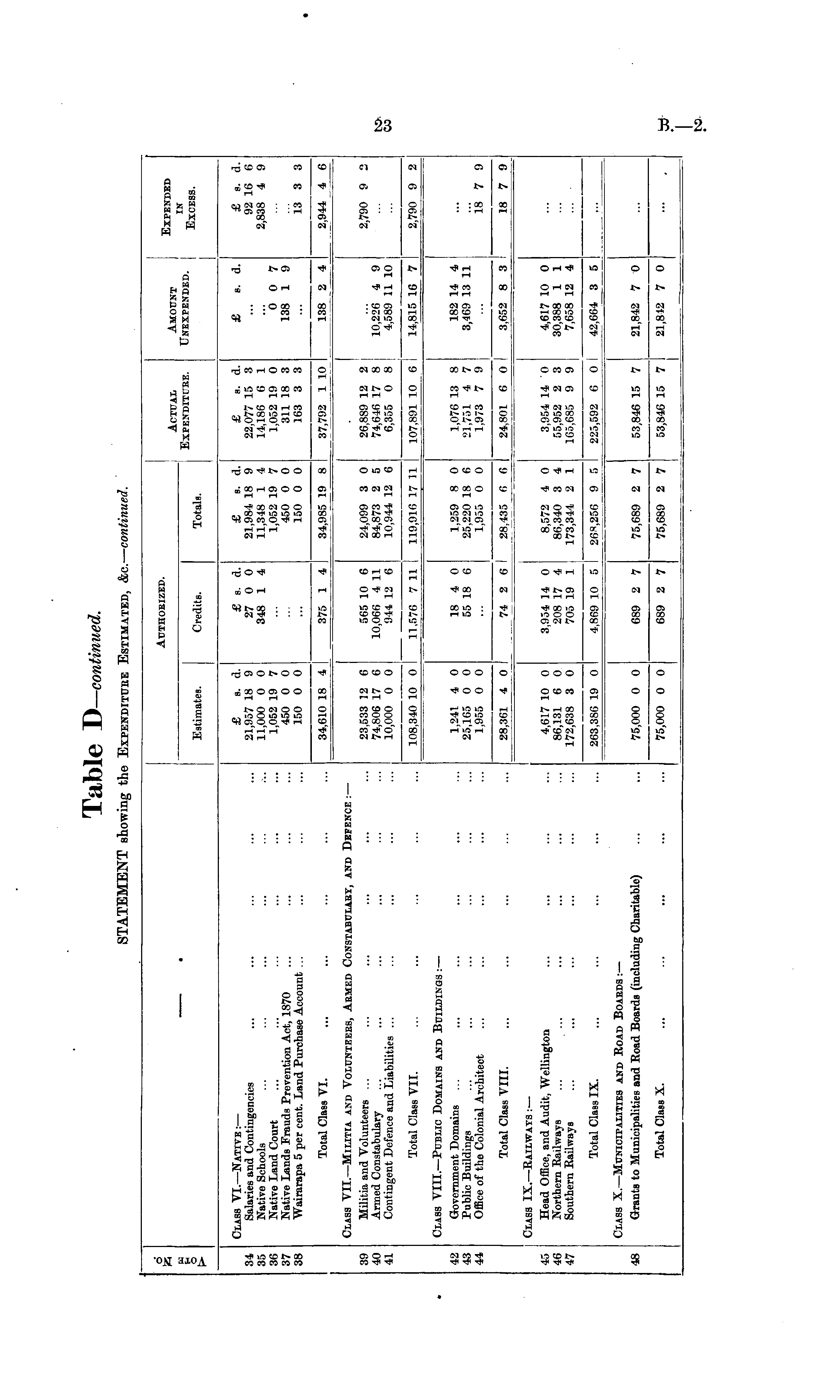 Tclble D — continued. STATEMENT showing the Expenditure Estimated, &c. — continued. d y, Authorized. Expended in Actual Amount Unexpended. O r* Expenditure. Excess. Estimates. Credits. Totals. 84 85 86 89 38 Class VI. —Native: — Salaries and Contingencies Native Schools Native Land Court Native Lands Frauds Prevention Act, 1870 Wairarapa 5 per cent. Land Purchase Account ... £ s. d. 21,957 18 9 11,000 0 0 1,052 19 7 450 0 0 150 0 0 £ s. d. 27 0 0 348 1 4 £ s. d. 21,984 18 9 11,348 1 4 1,052 19 7 450 0 0 150 0 0 £ s. a. 22,077 15 3 14,180 6 1 1,052 19 0 311 18 3 163 3 3 £ I. d. 0 0 7 138 1 9 £ s. a. 92 16 6 2,838 4 9 13 3 3 Total Class VI. 37,792 1 10 138 2 4 2,944 4 6 34,610 18 4 375 1 4 34,985 19 8 39 40 41 Class VII. —Militia and Volunteers, Armed Constabulary, and Defence :— Militia and Volunteers ... Armed Constabulary Contingent Defence and Liabilities ... 23,533 12 6 74,806 17 6 10,000 0 0 108,340 10 0 565 10 6 10,066 4 11 944 12 6 24,099 3 0 84,873 2 5 10,944 12 6 26,889 12 2 74,616 17 8 6,355 0 8 10,220 4 9 4,589 11 10 2,790 9 2 Total Class VII. 11,576 7 11 119,916 17 11 107,891 10 6 14,815 16 7 2,790 9 2 12 18 44 Class VIII. —Public Domains and Buildings :— Government Domains Public Buildings Office of the Colonial Architect. 1,241 4 0 25,165 0 0 1,955 0 0 18 4 0 55 18 6 1,259 8 0 25,220 18 6 1,955 0 0 1,076 13 8 21,751 4 7 1,973 7 9 182 14 4 3,469 13 11 18* 7 9 Total Class VIII. 28,361 4 0 74 2 6 28,435 <l 6 24.801 6 0 3,652 8 3 i 18 7 9 45 46 •17 Class IX. —Railways :— Head Office, and Audit, Wellington Northern Railways Southern Railways 4,617 10 0 86,131 6 0 172,638 3 0 3,954 14 0 208 17 4 705 19 1 8,572 4 0 86,340 3 4 173,344 2 1 3,954 14 0 55,952 2 3 105,685 9 9 4,617 10 0 30,388 1 1 7,658 12 4 ... ... ■ Total Class IX. 263,386 19 0 4,869 10 5 26S.256 9 5 225,592 6 0 42,664 3 5 ... IS Class X.—Municipalities and Road Boards :— 75,689 2 7 53,846 15 7 75,689 2 7 53,846 15 7 Grants to Municipalities and Road Boards (including Charitable) 75,000 0 0 689 2 7 21,842 7 0 Total Class X. 75,000 0 0 689 2 7 21,812 7 0