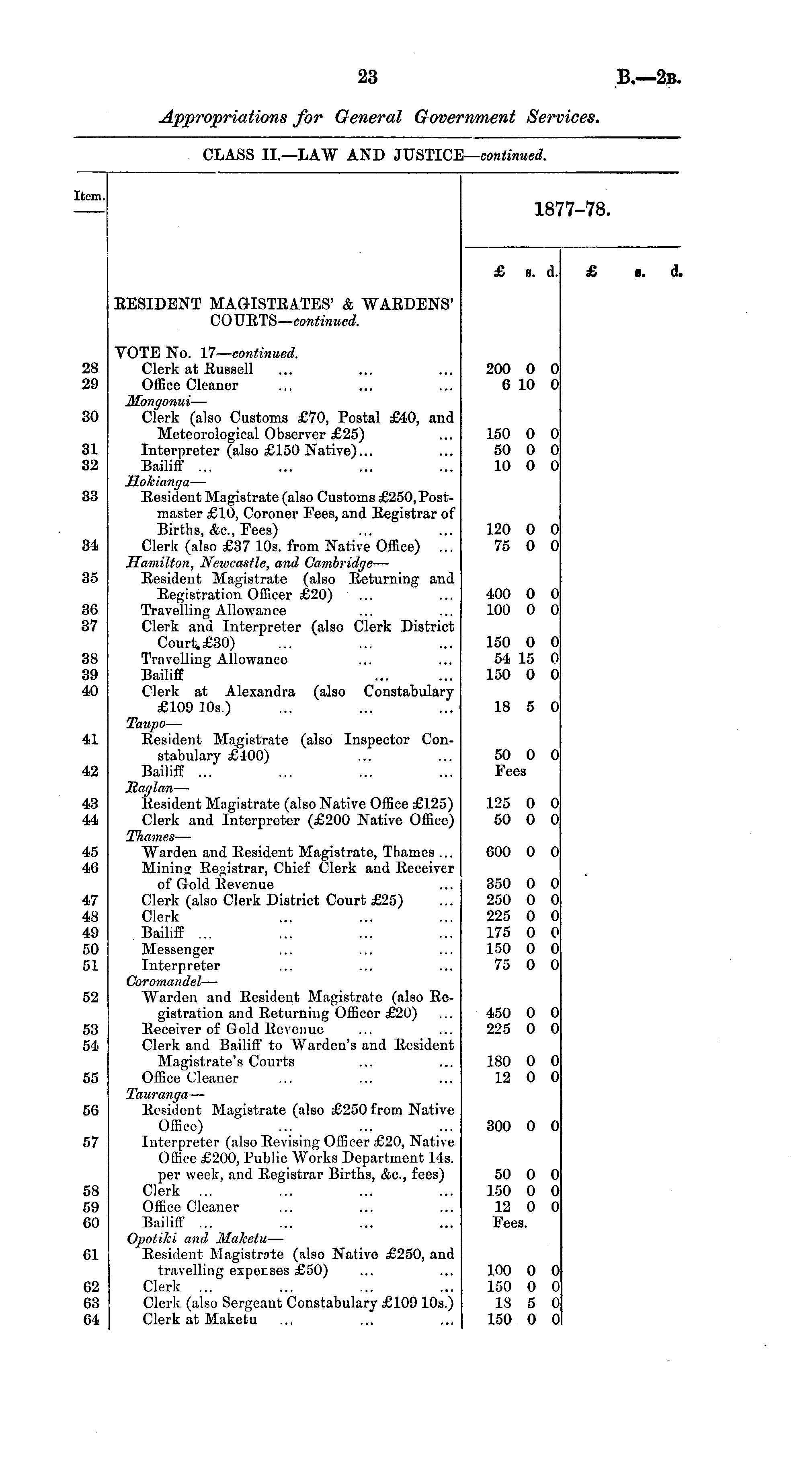 CLASS II.—LAW AND JUSTIC ! — continued. Item. 18 7-78. £ 8. d. £ s. d. EESIDENT MAGISTRATES' & WARDENS' COUETS— continued. 28 2!) VOTE No. 17— continued. Clerk at Russell Office Cleaner Monqonui — Cierk (also Customs £70, Postal £40, and Meteorological Observer £25) Interpreter (also £150 Native)... Bailiff ... Hokianga — Resident Magistrate (also Customs £250, Postmaster £10, Coroner Tees, and Eegistrar of Births, &c, Fees) Clerk (also £37 10s. from Native Office) ... Hamilton, Newcastle, and Cambridge — Resident Magistrate (also Returning and Registration Officer £20) Travelling Allowance Clerk and Interpreter (also Clerk District Court.£30) ... Travelling Allowance Bailiff Clerk at Alexandra (also Constabulary £109 10s.) 200 0 0 6 10 0 30 150 0 0 50 0 0 10 0 0 31 32 33 120 0 0 75 0 0 34 35 400 0 0 100 0 0 3G 87 38 89 40 150 0 0 54 15 0 150 0 0 18 5 0 41 42 ■13 44 45 4G 47 4S 49 50 61 Taupo — Resident Magistrate (also Inspector Constabulary £400) Bailiff ... Raglan — Resident Magistrate (also Native Office £125) Clerk and Interpreter (£200 Native Office) Thames — Warden and Resident Magistrate, Thames ... Mining Registrar, Chief Clerk and Receiver of Gold Revenue Clerk (also Clerk District Court £25) Clerk Bailiff ... Messenger Interpreter Coromandel — Warden and Resident Magistrate (also Registration and Returning Officer £20) Receiver of Gold Revenue Clerk and Bailiff to Warden's and Resident Magistrate's Courts Office Cleaner 50 0 0 Tees 125 0 0 50 0 0 600 0 0 350 0 0 250 0 0 225 0 0 175 0 0 150 0 0 75 0 0 52 450 0 0 225 0 0 5:! 64 55 180 0 0 12 0 0 50 57 68 69 GO Tauranga — Resident Magistrate (also £250 from Native Office) Interpreter (also Revising Officer £20, Native Office £200, Public Works Department 14s. per week, and Registrar Births, &c, fees) Clerk ... Office Cleaner Bailiff ... Opotilei and llaketu — Resident Magistrate (also Native £250, and travelling expenses £50) Clerk ... Clerk (also Sergeant Constabulary £109 10s.) Clerk at Maketu 300 0 0 50 0 0 150 0 0 12 0 0 Fees. Gl 100 0 0 150 0 0 18 5 0 150 0 0 02 68 64