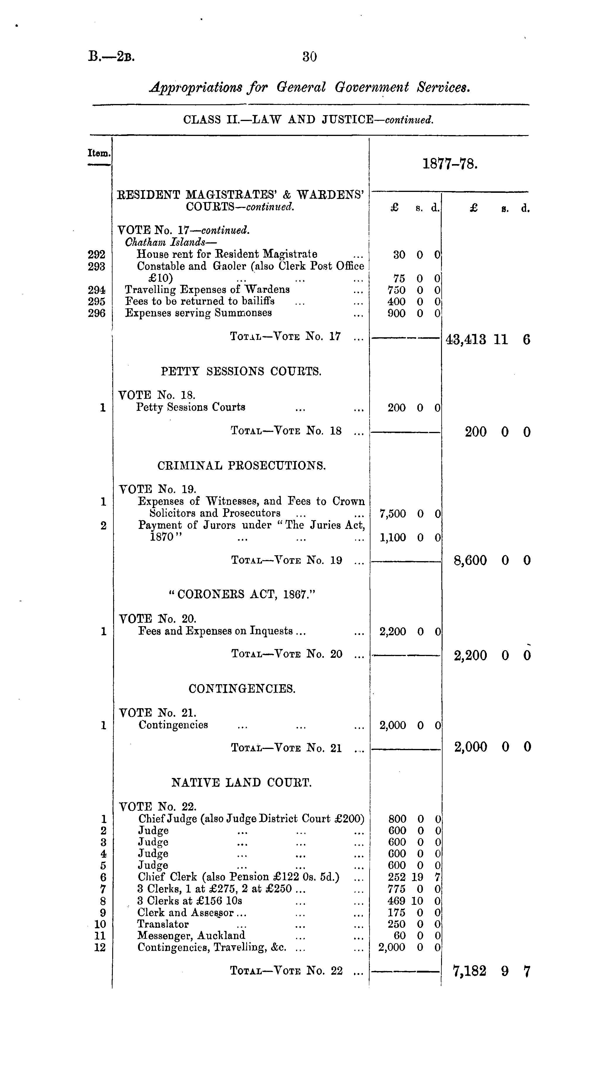 CLASS II.—LAW AND JUSTIC !— continued. Item. 18' 7-78. EESIDENT MAGISTEATES' & WAEDENS' COTJETS— continued. £ s. d. £ s. d. 292 293 VOTE No. 17— continued. Chatham Islands — House rent for Eesident Magistrate Constable and Gaoler (also Clerk Post Office £10) Travelling Expenses of Wardens Fees to be returned to bailiffs Expenses serving Summonses 30 75 750 400 900 0 0 0 0 0 0 0 0 0 0 294 205 296 Total—Vote No. 17 ... 43,413 11 6 PETTY SESSIONS COUETS. VOTE No. 18. Petty Sessions Courts 200 0 0 200 0 0 Total—Vote No. 18 ... CEIM1NAL PEOSECTTTIONS. 1 VOTE No. 19. Expenses of Witnesses, and Fees to Crown Solicitors and Prosecutors Payment of Jurors under " The Juries Act, 1870" 7,500 0 0 2 1,100 0 0 Total—Vote No. 19 ... 8,G00 0 0 " COEONEES ACT, 1867." VOTE No. 20. Tees and Expenses on Inquests ... 2,200 0 0 Total—Vote No. 20 ... 2,200 0 0 CONTINGENCIES. VOTE No. 21. Contingencies 2,000 0 0 2,000 0 0 Total—Vote No. 21 .... NATIVE LAND COUET. 1 2 3 4 5 6 7 8 9 10 11 12 VOTE No. 22. Chief Judge (also Judge District Court £200) Judge Judge Judge Judge Chief Clerk (also Pension £122 Os. 5d.) ... 3 Clerks, 1 at £275, 2 at £250 ... 3 Clerks at £156 10s Clerk and Assessor ... Translator Messenger, Auckland Contingencies, Travelling, &c. ... 800 0 0 GOO 0 0 COO 0 0 GOO 0 0 GOO 0 0 252 19 7 775 0 0 469 10 0 175 0 0 250 0 0 60 0 0 2,000 0 0 Total— Vote No. 22 ... 7,182 9 7