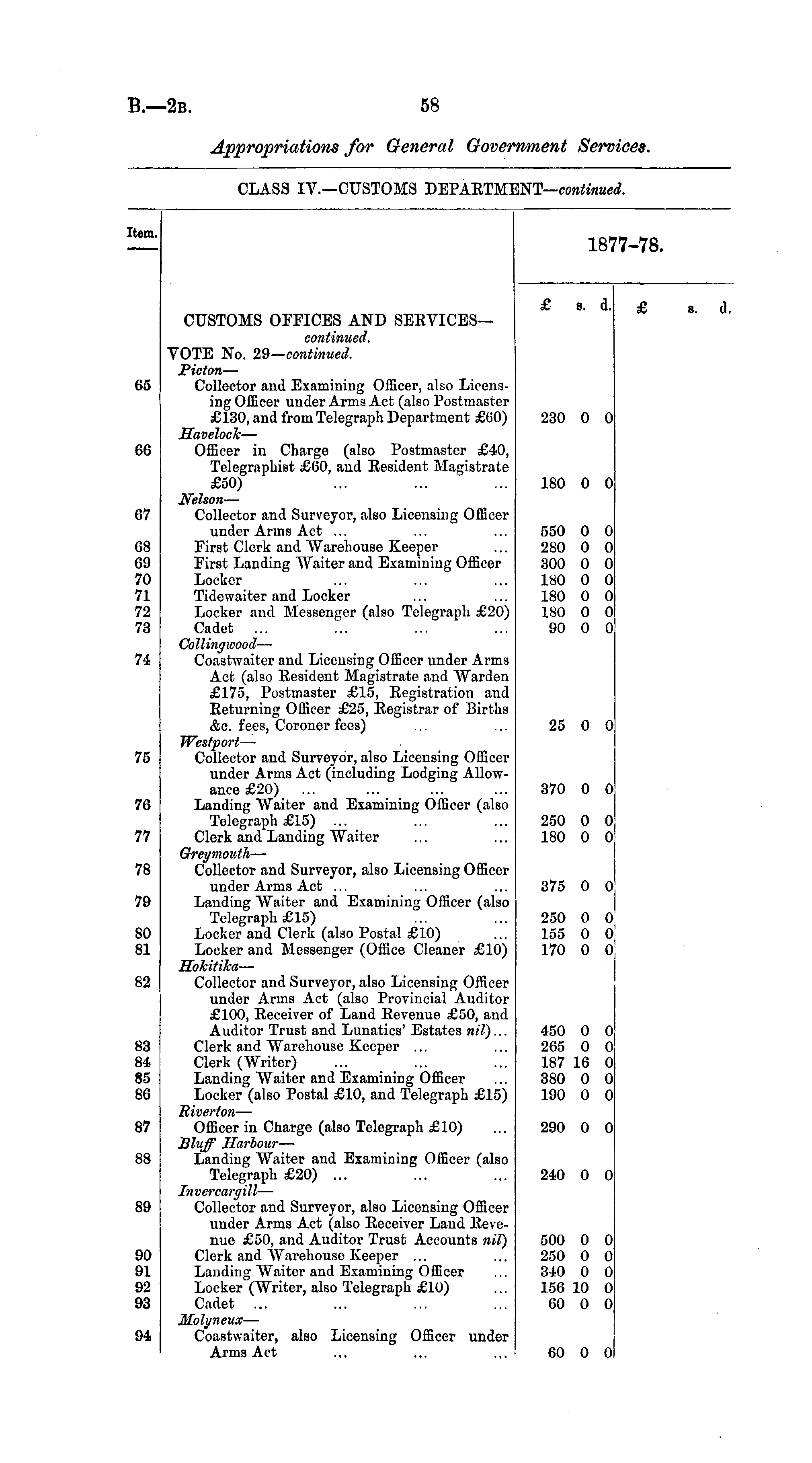 CLASS IV.—CUSTOMS DEPAETM: INT — continued. Item. 18 7-78. £ b. d. £ a. d 65 CUSTOMS OFFICES AND SEEVICES— continued. VOTE No. 29— continued, Picton — Collector and Examining Officer, also Licensing Officer under Arms Act (also Postmaster £130, and from Telegraph Department £60) Maveloch — Officer in Charge (also Postmaster £40, Telegraphist £60, and Kesident Magistrate £50) 230 0 0 66 180 0 0 67 OS 69 70 71 72 73 71 75 7(i 77 7s 70 80 81 Nelson — Collector and Surveyor, also Licensing Officer under Arms Act ... First Clerk and Warehouse Keeper First Landing Waiter and Examining Officer Locker Tidcwaiter and Locker Locker and Messenger (also Telegraph £20) Cadet ... ColHngwood — Coastwaiter and Licensing Officer under Arms Act (also Resident Magistrate and Warden £175, Postmaster £15, Eegistration and Ecturning Officer £25, Eegistrar of Births &c. fees, Coroner fees) Wesfport — Collector and Surveyor, also Licensing Officer under Arms Act (including Lodging Allowance £20) ... Landing Waiter and Examining Officer (also Telegraph £15) ... Clerk and Landing Waiter Greymouth — Collector and Surveyor, also Licensing Officer under Arms Act ... Landing Waiter and Examining Officer (also Telegraph £15) Locker and Clerk (also Postal £10) Locker and Messenger (Office Cleaner £10) Hokitika — Collector and Surveyor, also Licensing Officer under Arms Act (also Provincial Auditor £100, Eeceiver of Land Kevenue £50, and Auditor Trust and Lunatics' Estates nil)... Clerk and Warehouse Keeper ... Clerk (Writer) Landing Waiter and Examining Officer Locker (also Postal £10, and Telegraph £15) Riverton — Officer in Charge (also Telegraph £10) Bluff Harbour — Landing Waiter and Examining Officer (also Telegraph £20) ... Invercargill — Collector and Surveyor, also Licensing Officer under Arms Act (also Eeceiver Land Kevenue £50, and Auditor Trust Accounts nil) Clerk and AVarehouse Keeper ... Landing Waiter and Examining Officer Locker (Writer, also Telegraph £10) Cadet ... MoJyneux — Coastwaiter, also Licensing Officer under Arms Act 550 0 280 0 300 0 180 0 180 0 180 0 90 0 25 0 370 0 250 0 180 0 375 0 250 0 155 0 170 0 0 0 0 0 0 0 0 0 0 0 0 0 0 I 82 83 SI B5 su 450 0 265 0 187 16 380 0 190 0 0 0 0 0 0 87 290 0 0 ss 240 0 0 88 01 92 !)3 500 0 250 0 340 0 156 10 60 0 0 0 0 0 0 M 60 0 0