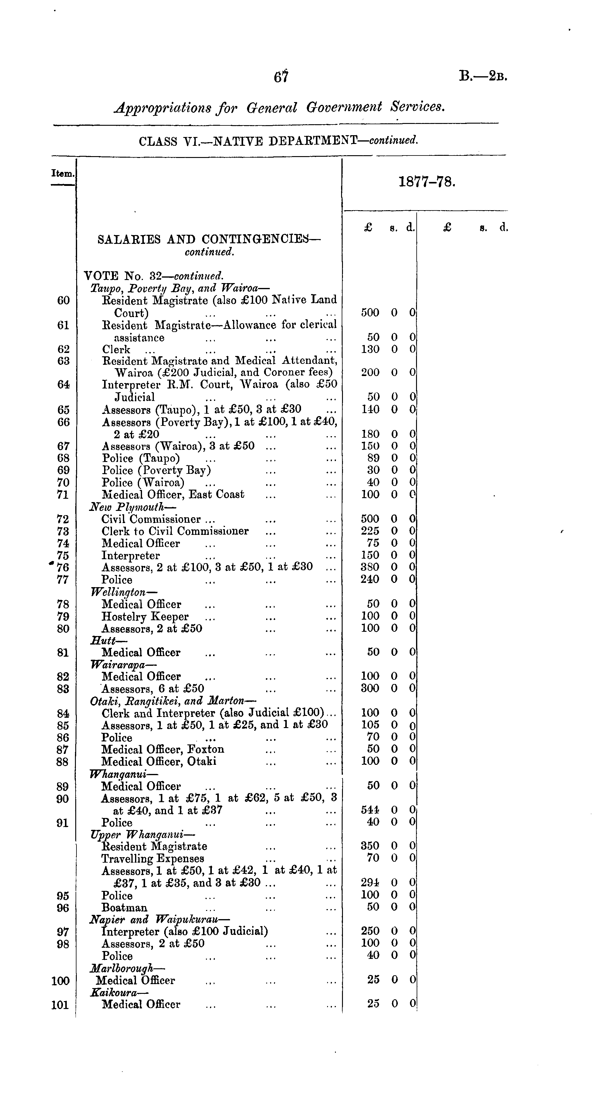 CLASS VI.—NATIVE DEPAETME !^T — continued. Item. 18 7-78. SALAEIES AND CONTINGENCIES— continued. £ 8. d. £ 8. (I 60 61 62 63 64 65 66 67 68 69 70 71 72 73 74 75 *76 77 78 79 80 VOTE No. 32— continued Tempo, Poverty Bay, and Wairoa — Eesident Magistrate (also £100 Naiive Land Court) Eesident Magistrate—Allowance for clerical assistance Clerk ... Eesident Magistrate and Medical Attendant, Wairoa (£200 Judicial, and Coroner fees) Interpreter E.M. Court, Wairoa (also £50 Judicial Assessors (Taupo), I at £50, 3 at £30 Assessors (Poverty Bay), 1 at £100,1 at £40, 2 at £20 Assessors ("Wairoa), 3 at £50 ... Police (Taupo) Police (Poverty Bay) Police (Wairoa) Medical Officer, East Coast New 'Plymouth — Civil Commissioner ... Clerk to Civil Commissioner Medical Officer Interpreter Assessors, 2 at £100, 3 at £50, 1 at £30 ... Police Wellinqton — Medical Officer Hostelry Keeper Assessors, 2 at £50 Rtitt— Medical Officer Wairarapa — Medical Officer Assessors, 6 at £50 Otaki, Eanqitikei, and Marton — Clerk and Interpreter (also Judicial £100)... Assessors, 1 at £50, 1 at £25, and 1 at £30 Police Medical Officer, Foxton Medical Officer, Otaki W hanqanui — Medical Officer Assessors, 1 at £75, 1 at £62, 5 at £50, 3 at £40, and 1 at £37 Police Upper Whanqanui — Eesident Magistrate Travelling Expenses Assessors, 1 at £50, 1 at £42, 1 at £40, 1 at £37, 1 at £35, and 3 at £30 ... Police Boatman Napier and TVaipukurau — Interpreter (also £100 Judicial) Assessors, 2 at £50 Police Marlborouffh — Medical Officer Kaikoura — Medical Officer 500 50 130 200 50 1-10 180 150 89 30 40 100 500 225 75 150 3 SO 240 50 100 100 0 0 0 0 0 0 0 0 0 0 0 0 0 0 0 0 0 0 0 0 0 0 0 0 0 0 0 0 0 0 0 0 0 0 (I 0 (I 0 0 0 (I 0 81 50 0 0 82 83 100 300 0 0 0 0 84 85 86 87 88 100 105 70 50 100 0 0 0 0 0 u 0 0 0 0 89 90 50 0 0 91 544 40 0 0 0 0 350 70 0 0 0 0 80 0(i 294 100 50 0 0 0 0 0 0 <J7 08 250 100 40 0 0 0 0 0 0 100 25 0 0 101 25 0 0