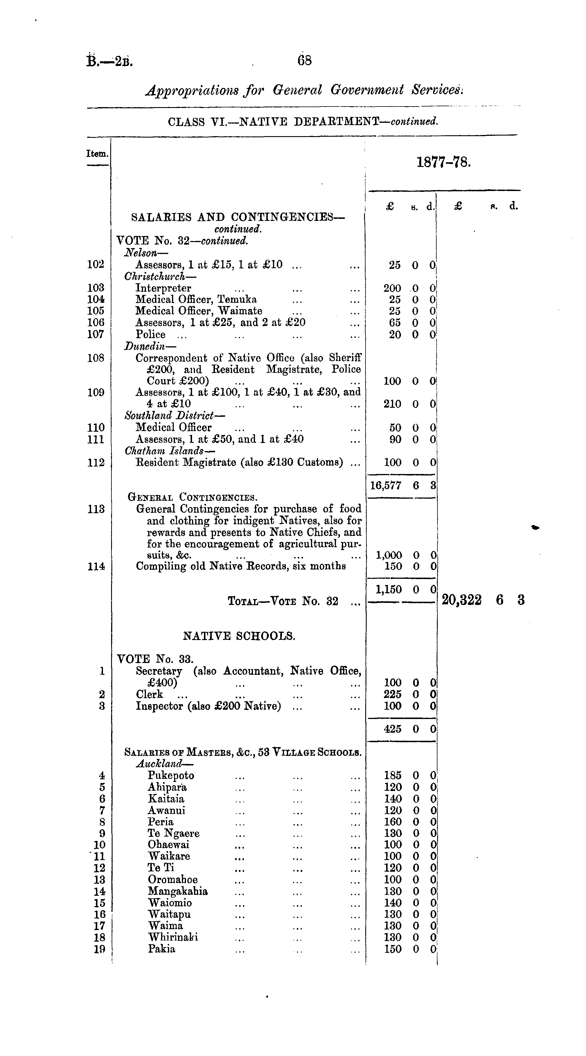 CLASS VI.—NATIVE DEPAETME: T — continued. Item. 18 7-78. 102 103 104 105 106 107 SALAEIES AND CONTINGENCIES— continued, VOTE No. 32— continued, Nelson — Assessors, 1 at £15, 1 at £10 ... Ch ristchurch — Interpreter Medical Officer, Temuka Medical Officer, AVaimate Assessors, 1 at £25, and 2 at £20 Police Dunedin — Correspondent of Native Office (also Sheriff £200, and Eesident Magistrate, Police Court £200) Assessors, 1 at £100, 1 at £40, 1 at £30, and 4 at £10 Southland District — Medical Officer Assessors, 1 at £50, and 1 at £40 Chatham Islands — Eesident Magistrate (also £130 Customs) ... £ s. d. 25 0 0 200 0 0 25 0 0 25 0 0 G5 0 0: 20 0 0 £ R. d. 108 100 0 0 109 210 0 0 110 111 50 0 0 90 0 0 112 100 0 0 113 General Contingencies. General Contingencies for purchase of food and clothing for indigent Natives, also for rewards and presents to Native Chiefs, and for the encouragement of agricultural pursuits, &c. Compiling old Native Eecords, six months 16,577 6 8 1,000 150 0 0 0 0 114 Total—Vote No. 32 ... 1,150 0 0 20,322 6 3 NATIVE SCHOOLS. I 2 8 VOTE No. 33. Secretary (also Accountant, Native Office, £400) Clerk ... Inspector (also £200 Native) ... 100 225 100 0 0 0 0 0 0 425 0 0 4 5 6 7 8 9 10 11 12 13 14 15 16 17 18 19 Salaeies or Mastees, &c, 53 Village Schools. Auckland — Pukepoto Ahipara Kaitaia Awanui Peria Te Ngaere Ohaewai Waikare TeTi Oromahoe Mangakahia Waiomio Waitapu Waima Whirinaki Pakia 185 120 140 120 160 130 100 100 120 100 130 140 130 130 130 150 0 0 0 0 0 0 0 0 0 0 0 0 0 0 0 0 0 0 0 0 0 0 0 0 0 0 o o 0 o 0 o: