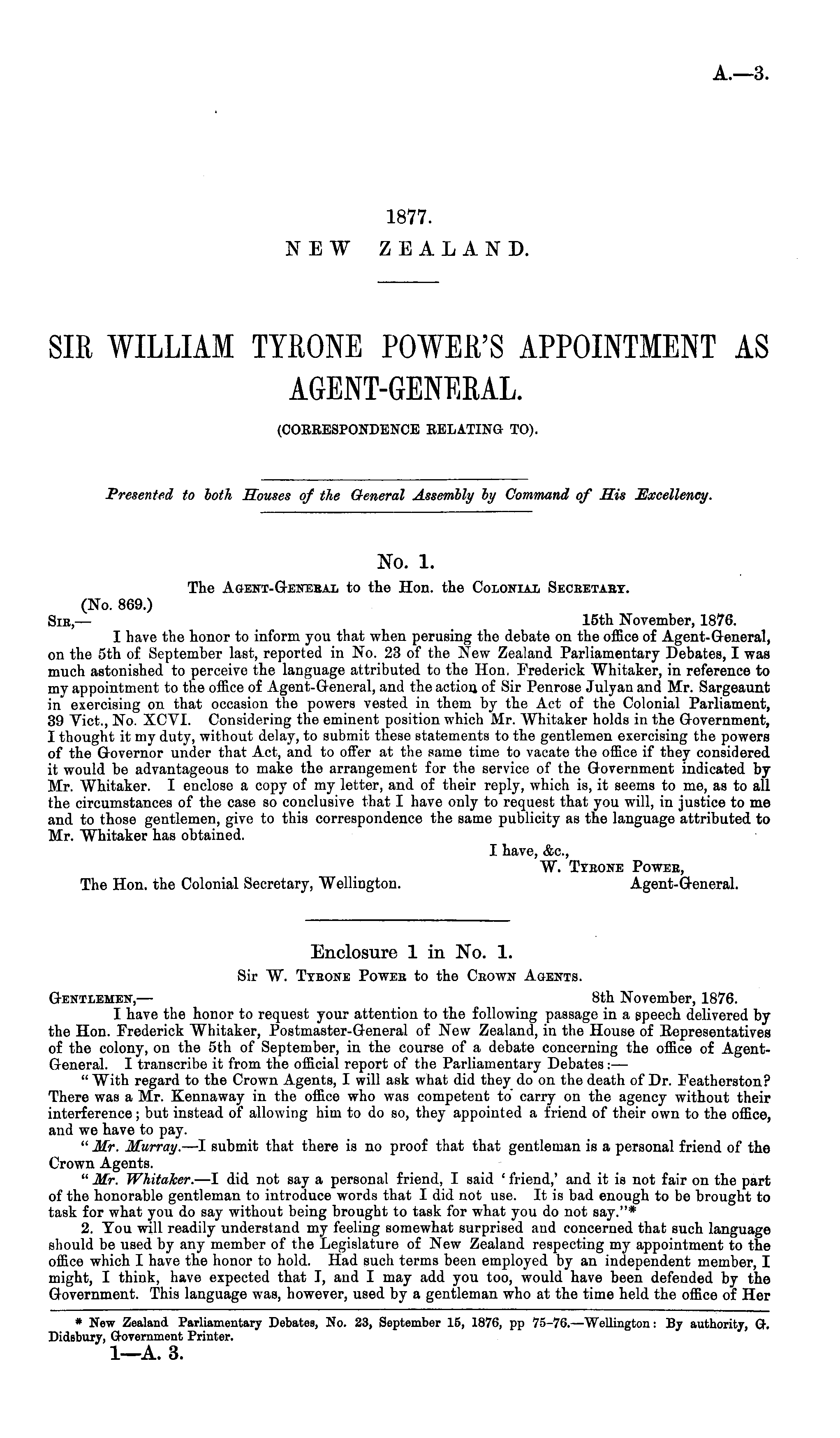 Enclosure 1 in No. 1. Sir W. Tybone Poweb to the Ceown Agents. Gentlemen, — Bth November, 1876. I have the honor to request your attention to the following passage in a speech delivered by the Hon. Frederick Whitaker, Postmaster-General of New Zealand, in the House of Eepresentatives of the colony, on the sth of September, in the course of a debate concerning the office of AgentGeneral. I transcribe it from the official report of the Parliamentary Debates: — "With regard to the Crown Agents, I will ask what did they do on the death of Dr. Featherston? There was a Mr. Kennaway in the office who was competent to" carry on the agency without their interference; but instead of allowing him to do so, they appointed a friend of their own to the office, and we have to pay. " Mr. Murray. —l submit that there is no proof that that gentleman is a personal friend of the Crown Agents. " Mr. Whitaker. —I did not say a personal friend, I said ' friend,' and it is not fair on the part of the honorable gentleman to introduce words that I did not use. It is bad enough to be brought to task for what you do say without being brought to task for what you do not say."* 2. Tou will readily understand my feeling somewhat surprised and concerned that such language should be used by any member of the Legislature of New Zealand respecting my appointment to the office which I have the honor to hold. Had such terms been employed by an independent member, I might, I think, have expected that I, and I may add you too, would have been defended by the Government. This language was, however, used by a gentleman who at the time held the office of Her