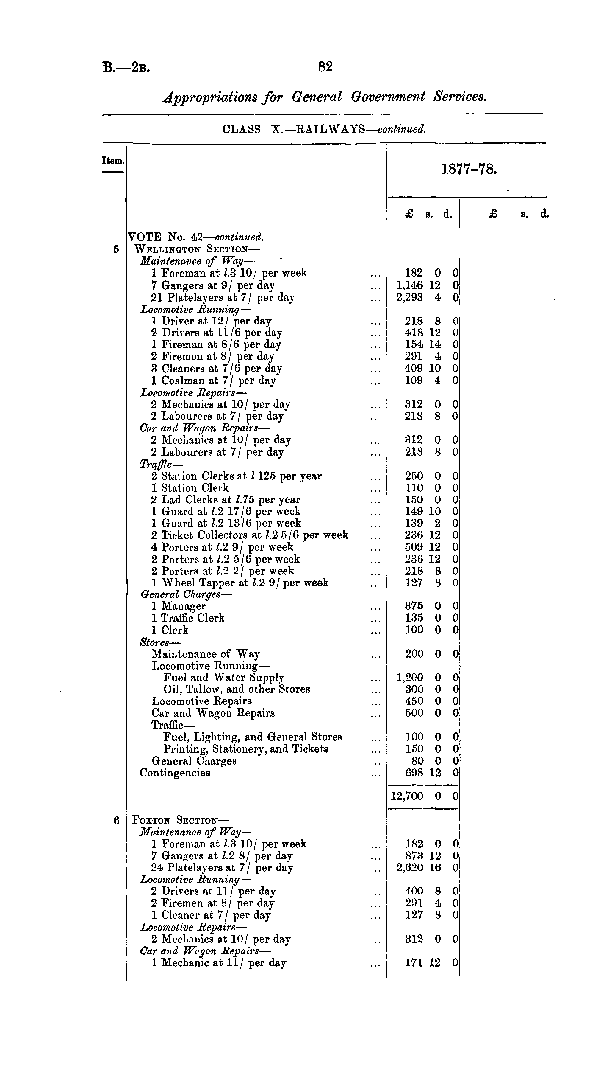 CLASS X. —EAILWATS— continued. Item. 18 7-78. £ s. d. £ 8. d. VOTE No. 42— continued. Wellington Section— Maintenance of Way — 1 Foreman at 1.3 10/ per week 7 Gangers at 9/ per day 21 Platelayers at 7/ per day Locomotive Sunning — 1 Driver at 12/ per day 2 Drivers at li/6 per day 1 Fireman at 8/6 per day 2 Firemen at 8/ per day 3 Cleaners at 7/(5 per day 1 Coalman at 7 / per day Locomotive Repairs — 2 Mechanics at 10/ per day 2 Labourers at 7/ per day Car and War/on Repairs — 2 Mechanics at 10/ per day 2 Labourers at 7/ per day Traffic— 2 Station Clerks at Z.125 per year 1 Station Clerk 2 Lad Clerks at Z.75 per year 1 Guard at 1.2 17/6 per week 1 Guard at 1.2 13/6 per week 2 Ticket Collectors at 1.2 5/6 per week 4 Porters at 1.2 9/ per week 2 Porters at 1.2 5/6 per week 2 Porters at 1.2 2/ per week 1 Wheel Tapper at 1.2 9/ per week General Charges — 1 Manager 1 Traffic Clerk 1 Clerk Stores — Maintenance of Way Locomotive Running — Fuel and Water Supply Oil, Tallow, and other Stores Locomotive Eepairs Car and Wagon Repairs TrafficFuel, Lighting, and General Stores Printing, Stationery, and Tickets General Charges Contingencies 182 0 0 1,146 12 0 2,293 4 0 218 8 0 418 12 0 154 14 0 291 4 0 409 10 0 109 4 0 312 0 0 218 8 0 312 0 0 218 8 0 250 0 0 110 0 0 150 0 0 149 10 0 139 2 0 236 12 0 509 12 0 236 12 0 218 8 0 127 8 0 375 0 0 135 0 0 100 0 0 200 0 0 1,200 0 0 300 0 0 450 0 0 500 0 0 100 0 0 150 0 0 80 0 0 698 12 0 12,700 0 0 i Foxton Section — Maintenance of Way — 1 Foreman at 1.3 10/ per week 7 Gangers at 1.2 8/ per day 24 Platelayers at 7 / per day Locomotive Running — 2 Drivers at 11/ per day 2 Firemen at 8/ per day 1 Cleaner at 7/ per day Locomotive Repair,* — 2 Mechanics at 10/ per day Car and Wagon Repairs — 1 Mechanic at 11/ per day 182 0 873 12 2,620 16 400 8 291 4 127 8 0 0 0 0 (» 0 312 0 0 171 12 0