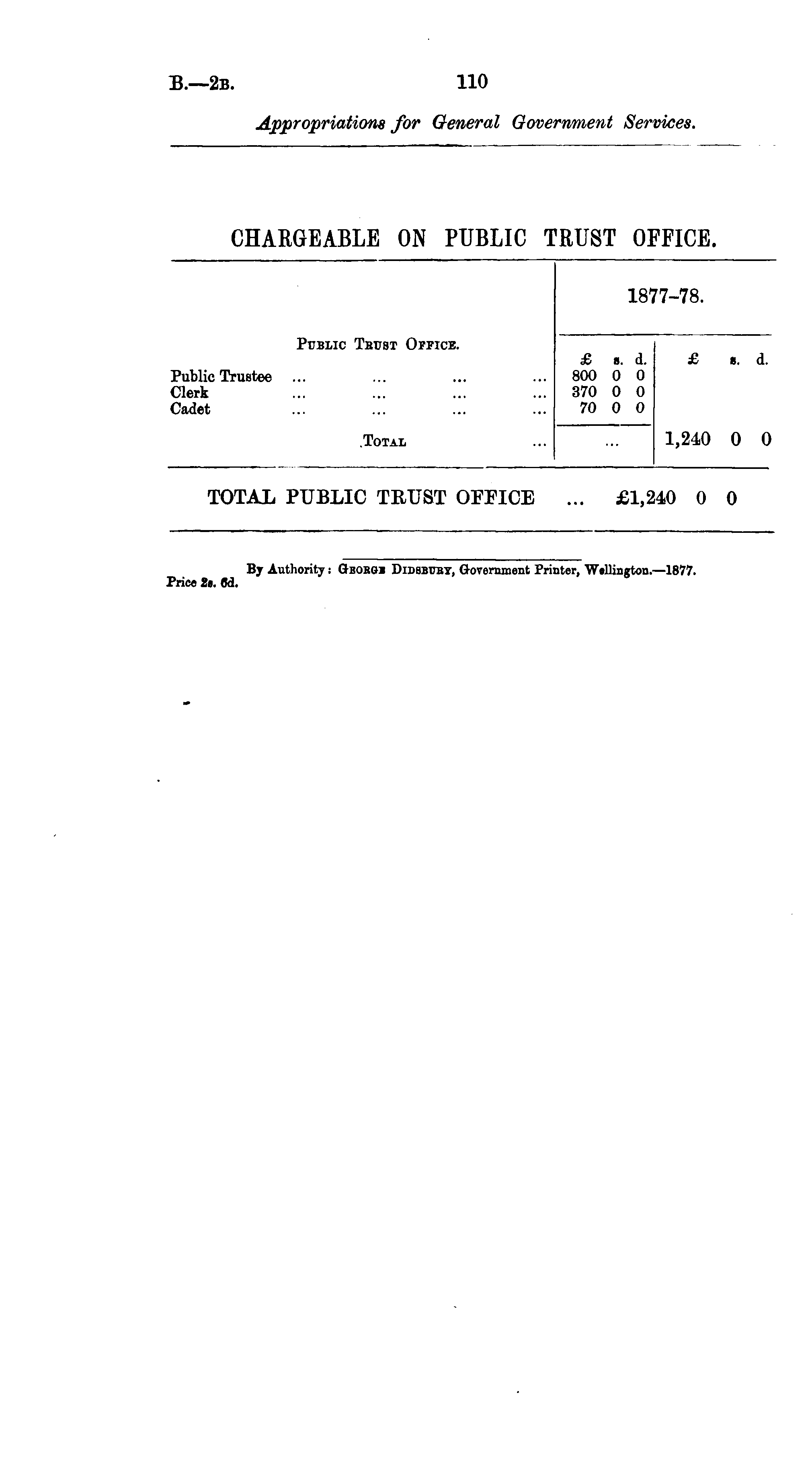 18 7-78. Public Tbust Office. Public Trustee Clerk Cadet £ 800 370 70 8. d. 0 0 0 0 0 0 £ 8. d. 1,240 0 0 .Total TOTAL PUBLIC TRUST OFFICE • • • £1,240 0 0 By Authority; G-bobgi Didsbuby, Government Printer, Wellington.—1877.