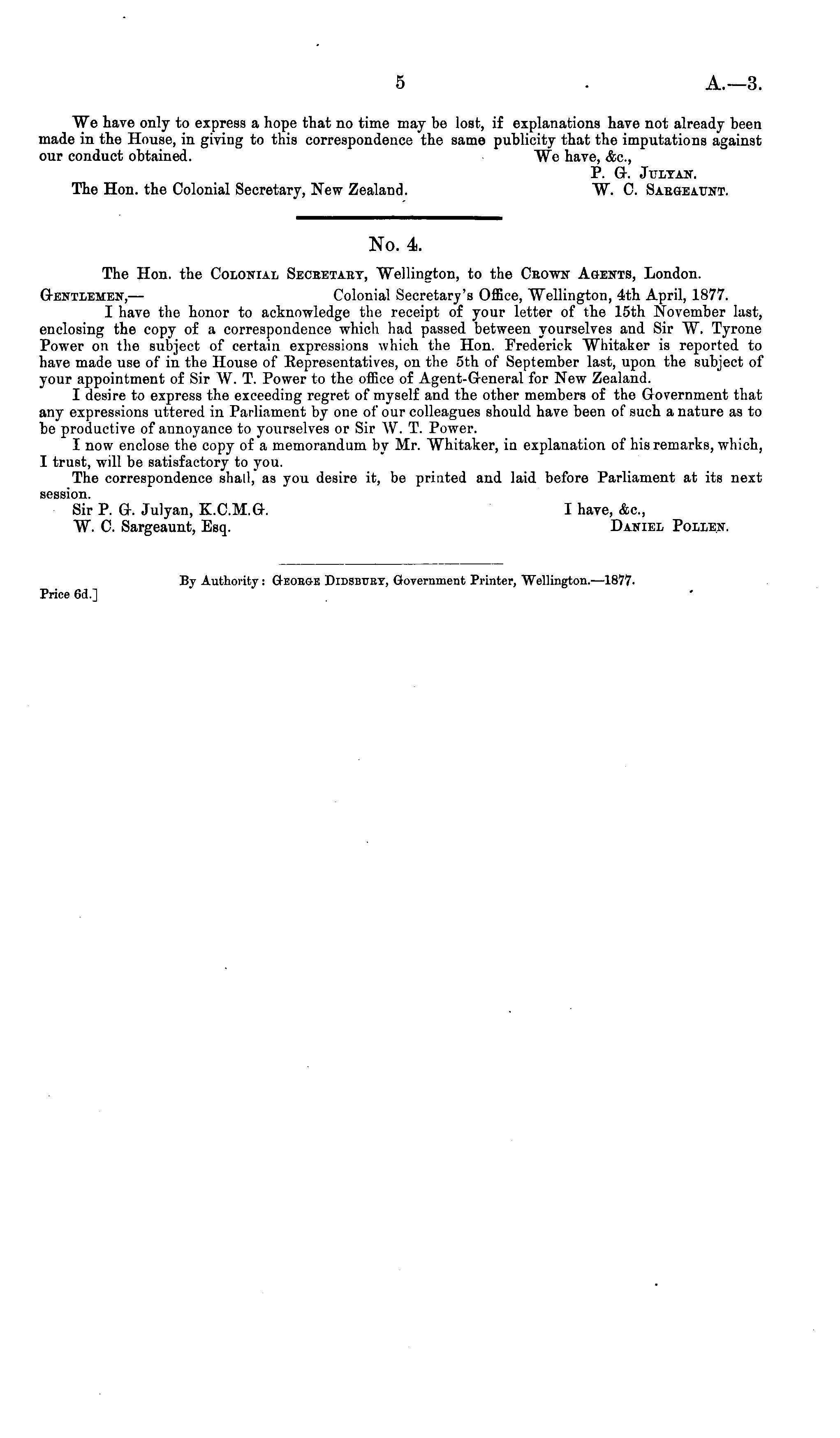 No. 4. The Hon. the Colonial Seceetaey, Wellington, to the Ceown Agents, London. Gentlemen, — Colonial Secretary's Office, Wellington, 4th April, 1877. I have the honor to acknowledge the receipt of your letter of the 15th November last, enclosing the copy of a correspondence which had passed between yourselves and Sir W. Tyrone Power on the subject of certain expressions which the Hon. Frederick Whitaker is reported to have made use of in the House of Eepresentatives, on the sth of September last, upon the subject of your appointment of Sir W. T. Power to the office of Agent-General for New Zealand. I desire to express the exceeding regret of myself and the other members of the Government that any expressions uttered in Parliament by one of our colleagues should have been of such a nature as to be productive of annoyance to yourselves or Sir W. T. Power. I now enclose the copy of a memorandum by Mr. Whitaker, in explanation of his remarks, which, I trust, will be satisfactory to you. The correspondence shall, as you desire it, be printed and laid before Parliament at its next session. Sir P. G. Julyan, K.C.M.G. I have, &c., W. C. Sargeaunt, Esq. Daniel Pollen.