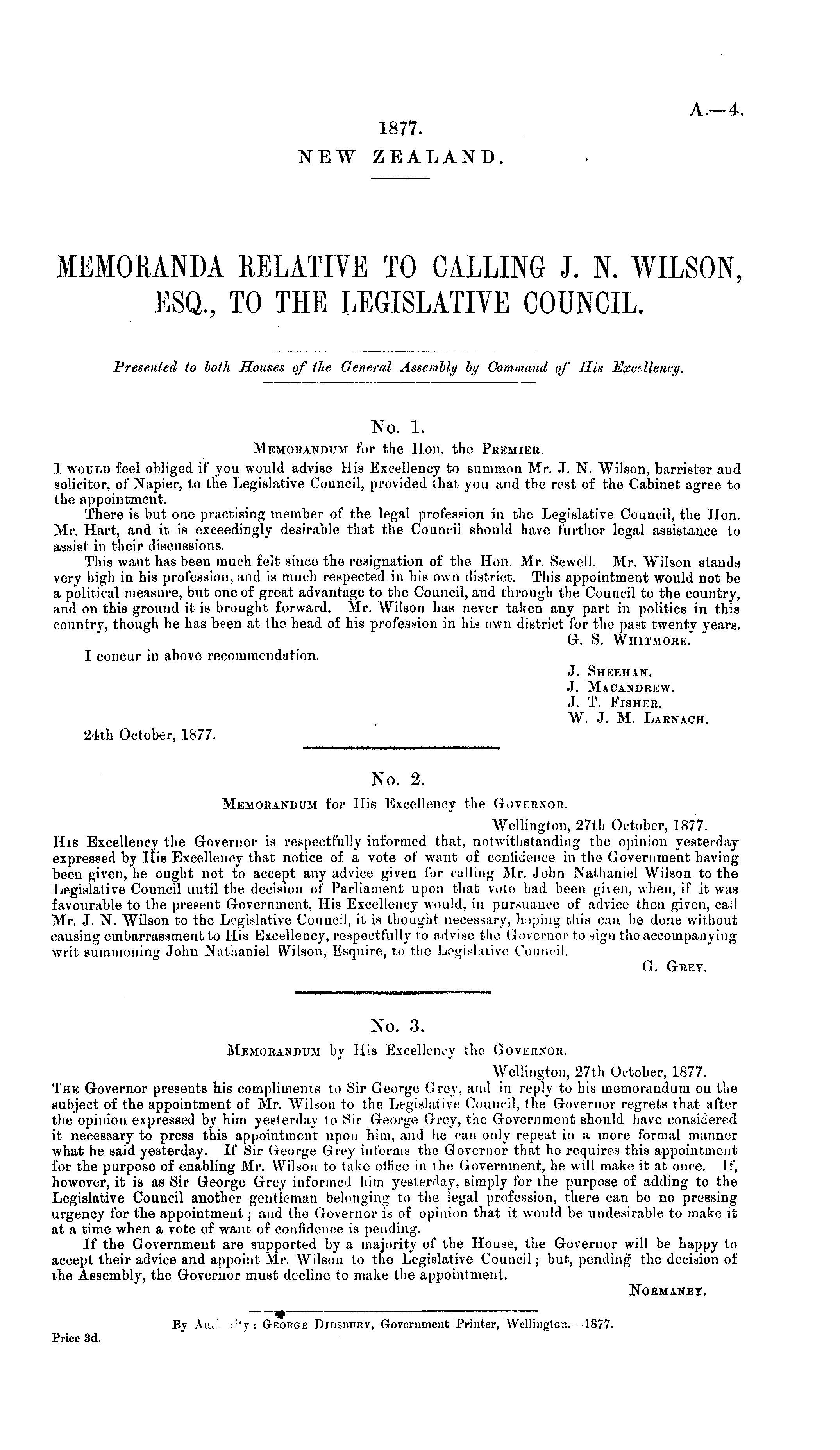 Presented to both Houses of the General Assembly by Command of His Excellency. No. 1. Memorandum for the Hon. the Premier. I would feel obliged if you would advise His Excellency to summon Mr. J. N. Wilson, barrister and solicitor, of Napier, to the Legislative Council, provided that you and the rest of the Cabinet agree to the appointment. There is but orre practising member of the legal profession in the Legislative Council, the Hon. Mr. Hart, aud it is exceedingly desirable that the Council should have further legal assistance to assist in their discussions. This want has been much felt since the resignation of the Hon. Mr. Sewell. Mr. Wilson stands very high in his profession, and is much respected in his own district. This appointment would not be a political measure, but one of great advantage to the Council, and through the Council to the country, and on this ground it is brought forward. Mr. Wilson has never taken any part in politics in this country, though he has been at the head of his profession in his own district for the past twenty years. G. S. Whitmore. I concur in above recommendation. J. Sheehan. J. Macandrew. J. T. Fisher. W. J. M. Larnach. 24th October, 1877.