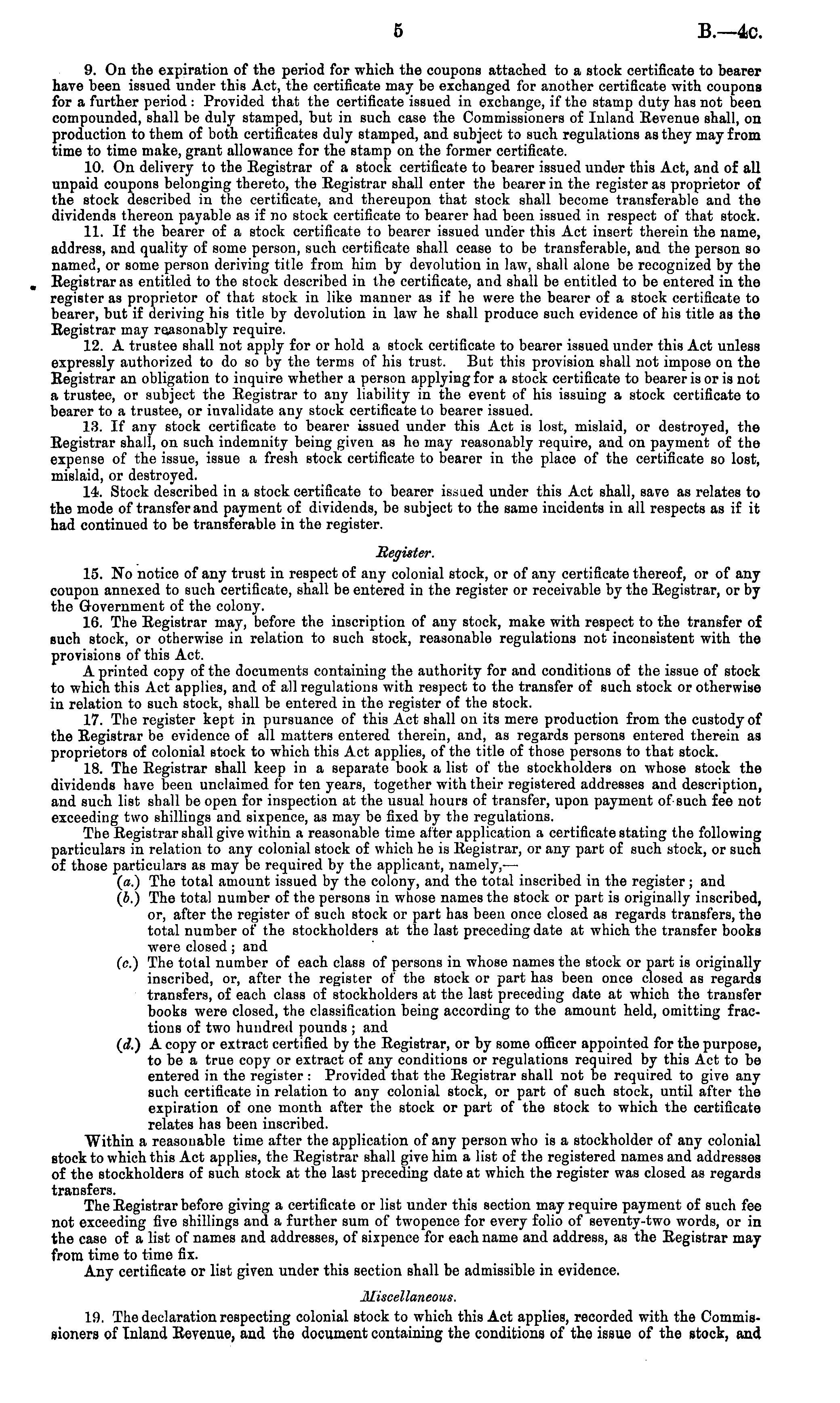 9. On the expiration of the period for which the coupons attached to a stock certificate to bearer have been issued under this Act, the certificate may be exchanged for another certificate with coupons for a further period : Provided that the certificate issued in exchange, if the stamp duty has not been compounded, shall be duly stamped, but in such case the Commissioners of Inland Eevenue shall, on production to them of both certificates duly stamped, and subject to such regulations as they may from time to time make, grant allowance for the stamp on the former certificate. 10. On delivery to the Registrar of a stock certificate to bearer issued under this Act, and of all unpaid coupons belonging thereto, the Eegistrar shall enter the bearer in the register as proprietor of the stock described in the certificate, and thereupon that stock shall become transferable and the dividends thereon payable as if no stock certificate to bearer had been issued in respect of that stock. 11. If the bearer of a stock certificate to bearer issued under this Act insert therein the name, address, and quality of some person, such certificate shall cease to be transferable, and the person so named, or some person deriving title from him by devolution in law, shall alone be recognized by the Eegistrar as entitled to the stock described in the certificate, and shall be entitled to be entered in the register as proprietor of that stock in like manner as if he were the bearer of a stock certificate to bearer, but if deriving his title by devolution in law he shall produce such evidence of his title as the Registrar may reasonably require. 12. A trustee shall not apply for or hold a stock certificate to bearer issued under this Act unless expressly authorized to do so by the terms of his trust. But this provision shall not impose on the Registrar an obligation to inquire whether a person applying for a stock certificate to bearer is or is not a trustee, or subject the Eegistrar to any liability in the event of his issuing a stock certificate to bearer to a trustee, or invalidate any stock certificate to bearer issued. 18. If any stock certificate to bearer issued under this Act is lost, mislaid, or destroyed, the Eegistrar shall, on such indemnity being given as he may reasonably require, and on payment of the expense of the issue, issue a fresh stock certificate to bearer in the place of the certificate so lost, mislaid, or destroyed. 14. Stock described in a stock certificate to bearer issued under this Act shall, save as relates to the mode of transfer and payment of dividends, be subject to the same incidents in all respects as if it had continued to be transferable in the register. Register. 15. No notice of any trust in respect of any colonial stock, or of any certificate thereof, or of any coupon annexed to such certificate, shall be entered in the register or receivable by the Eegistrar, or by the Government of the colony. 16. The Eegistrar may, before the inscription of any stock, make with respect to the transfer of such stock, or otherwise in relation to such stock, reasonable regulations not inconsistent with the provisions of this Act. A printed copy of the documents containing the authority for and conditions of the issue of stock to which this Act applies, and of all regulations with respect to the transfer of such stock or otherwise in relation to such stock, shall be entered in the register of the stock. 17. The register kept in pursuance of this Act shall on its mere production from the custody of the Eegistrar be evidence of all matters entered therein, and, as regards persons entered therein as proprietors of colonial stock to which this Act applies, of the title of those persons to that stock. 18. The Registrar shall keep in a separate book a list of the stockholders on whose stock the dividends have been unclaimed for ten years, together with their registered addresses and description, and such list shall be open for inspection at the usual hours of transfer, upon payment of such fee not exceeding two shillings and sixpence, as may be fixed by the regulations. The Eegistrar shall give within a reasonable time after application a certificate stating the following particulars in relation to any colonial stock of which he is Eegistrar, or any part of such stock, or such of those particulars as may be required by the applicant, namely, — (as.) The total amount issued by the colony, and the total inscribed in the register; and (b.) The total number of the persons in whose names the stock or part is originally inscribed, or, after the register of such stock or part has been once closed as regards transfers, the total number of the stockholders at the last preceding date at which the transfer books were closed ; and (c.) The total number of each class of persons in whose names the stock or part is originally inscribed, or, after the register of the stock or part has been once closed as regards transfers, of each class of stockholders at the last preceding date at which the transfer books were closed, the classification being according to the amount held, omitting fractions of two hundred pounds ; and (J.) A copy or extract certified by the Eegistrar, or by some officer appointed for the purpose, to be a true copy or extract of any conditions or regulations required by this Act to be entered in the register : Provided that the Eegistrar shall not be required to give any such certificate in relation to any colonial stock, or part of such stock, until after the expiration of one month after the stock or part of the stock to which the certificate relates has been inscribed. Within a reasonable time after the application of any person who is a stockholder of any colonial stock to which this Act applies, the Eegistrar shall give him a list of the registered names and addresses of the stockholders of such stock at the last preceding date at which the register was closed as regards transfers. The Eegi