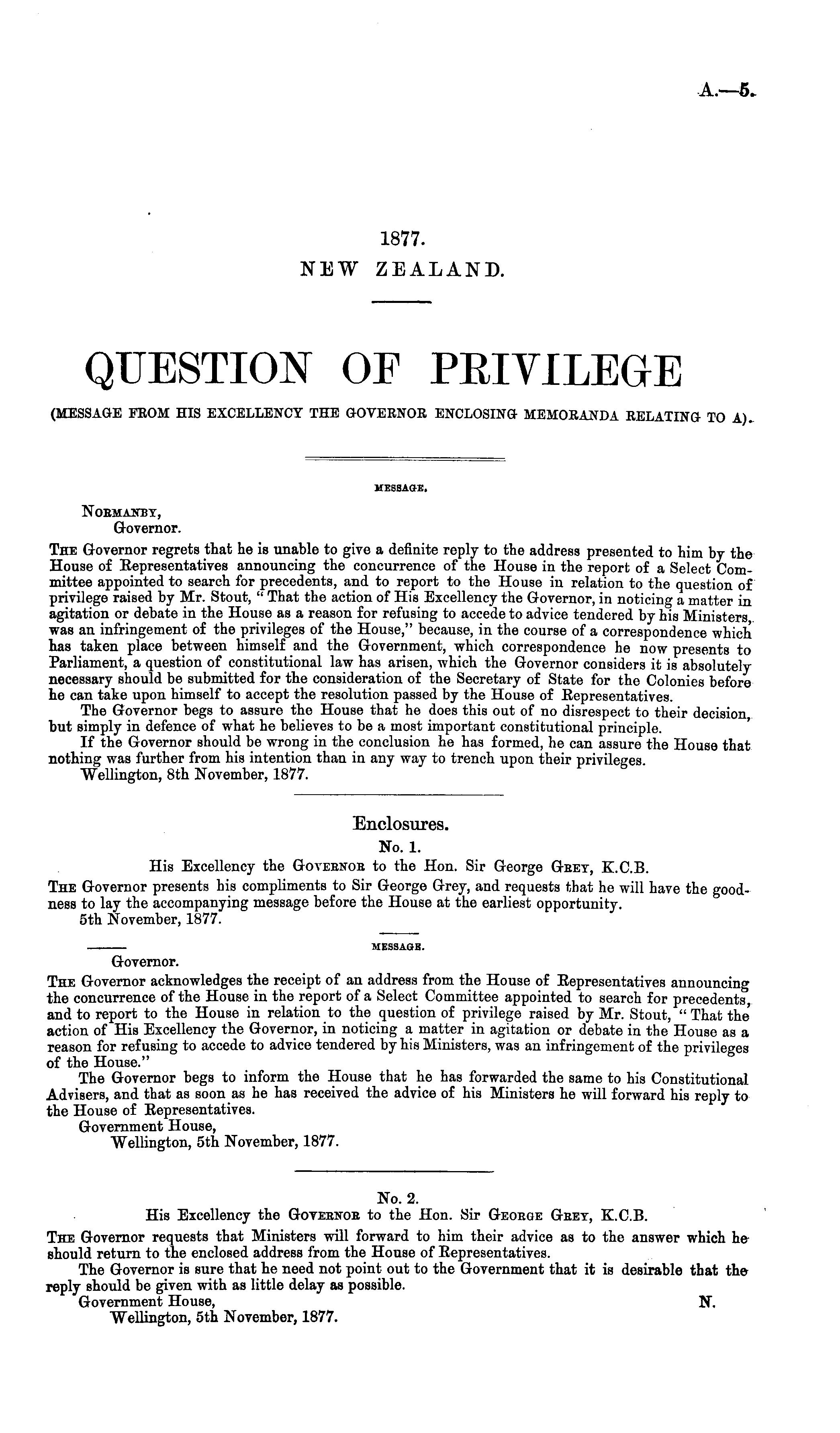 Enclosures. No. 1. His Excellency the Governor to the Hon. Sir George Gret, K.C.B. The Governor presents his compliments to Sir George Grey, and requests that he will have the goodness to lay the accompanying message before the House at the earliest opportunity. sth November, 1877. MESSAGE. Governor. The Governor acknowledges the receipt of an address from the House of Eepresentatives announcing the concurrence of the House in the report of a Select Committee appointed to search for precedents, and to report to the House in relation to the question of privilege raised by Mr. Stout, " That the' action of His Excellency the Governor, in noticing a matter in agitation or debate in the House as a reason for refusing to accede to advice tendered by his Ministers, was an infringement of the privileges of the House." The Governor begs to inform the House that he has forwarded the same to his Constitutional Advisers, and that as soon as he has received the advice of his Ministers he will forward his reply to the House of Eepresentatives. Government House, Wellington, sth November, 1877.