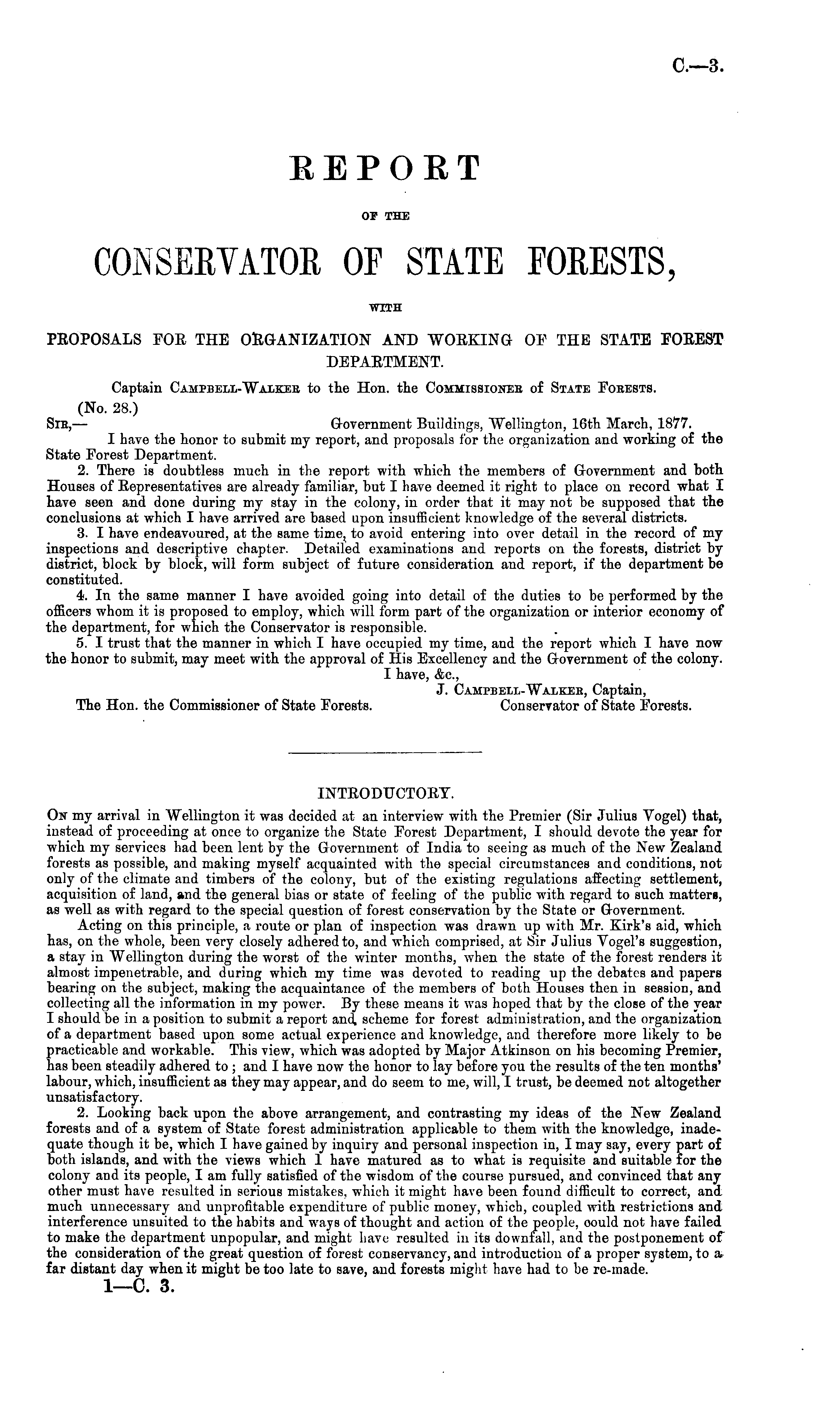 Captain Cahpbell-WaijKEE to the Hon. the Commissioneb of State Forests. (No. 28.) Sib, — Government Buildings, Wellington, 16th March, 1877. I have the honor to submit my report, and proposals for the organization and working of the State Forest Department. 2. There is doubtless much in the report with which the members of Government and both Houses of Eepresentatives are already familiar, but I have deemed it right to place on record what I have seen and done during my stay in the colony, in order that it may not be supposed that the conclusions at which I have arrived are based upon insufficient knowledge of the several districts. 3. I have endeavoured, at the same time, to avoid entering into over detail in the record of my inspections and descriptive chapter. Detailed examinations and reports on the forests, district by district, block by block, will form subject of future consideration and report, if the department be constituted. 4. In the same manner I have avoided going into detail of the duties to be performed by the officers whom it is proposed to employ, which will form part of the organization or interior economy of the department, for which the Conservator is responsible. 5. I trust that the manner in which I have occupied my time, and the report which I have now the honor to submit, may meet with the approval of His Excellency and the Government of the colony. I have, &c, J. Campbell-Walkee, Captain, The Hon. the Commissioner of State Forests. Conservator of State Forests.