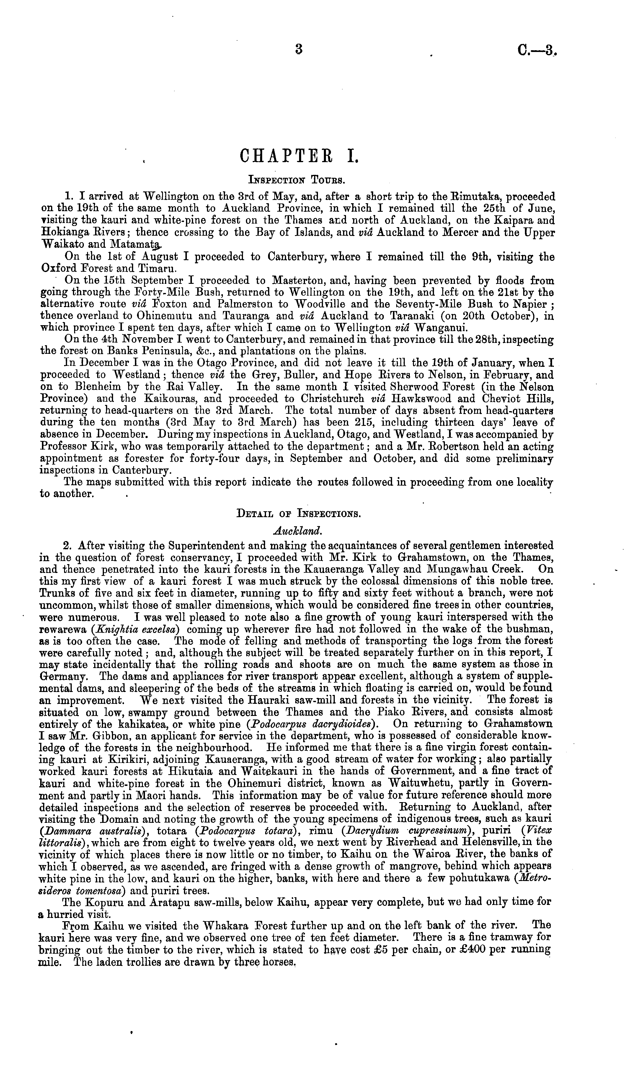 CHAPTER I. Inspection Toitbs. 1. I arrived at Wellington on the 3rd of May, and, after a short trip to the Eimutaka, proceeded on the 19th of the same month to Auckland Province, in which I remained till the 25th of June, visiting the kauri and white-pine forest on the Thames and north of Auckland, on the Kaipara and Hokianga Eivers; thence crossing to the Bay of Islands, and via Auckland to Mercer and the Upper Waikato and Matamatj,. On the Ist of August I proceeded to Canterbury, where I remained till the 9th, visiting the Oxford Forest and Timaru. On the 15th September I proceeded to Masterton, and, having been prevented by floods from going through the Forty-Mile Bush, returned to Wellington on the 19th, and left on the 21st by the alternative route via Foxton and Palmerston to Woodville and the Seventy-Mile Bush to Napier ; thence overland to Ohinemutu and Tauranga and via Auckland to Taranaki (on 20th October), in which province I spent ten days, after which I came on to Wellington via Wanganui. On the 4th November I went to Canterbury, and remained in that province till the 28th, inspecting the forest on Banks Peninsula, &c, and plantations on the plains. In December I was in the Otago Province, and did not leave it till the 19th of January, when I proceeded to Westland; thence via the Grey, Buller, and Hope Eivers to Nelson, in February, and on to Blenheim by the Eai Valley. In the same month I visited Sherwood Forest (in the Nelson Province) and the Kaikouras, and proceeded to Christchurch via Hawkswood and Cheviot Hills, returning to head-quarters on the 3rd March. The total number of days absent from head-quarters during the ten months (3rd May to 3rd March) has been 215, including thirteen days' leave of absence in December. During my inspections in Auckland, Otago, and Westland, I was accompanied by Professor Kirk, who was temporarily attached to the department; and a Mr. Eobertson held an acting appointment as forester for forty-four days, in September and October, and did some preliminary inspections in Canterbury. The maps submitted with this report indicate the routes followed in proceeding from one locality to another. Detail of Inspections. Auckland. 2. After visiting the Superintendent and making the acquaintances of several gentlemen interested in the question of forest conservancy, I proceeded with Mr. Kirk to Grahamstown, on the Thames, and thence penetrated into the kauri forests in the Kauaeranga Valley and Mungawhau Creek. On this my first view of a kauri forest I was much struck by the colossal dimensions of this noble tree. Trunks of five and six feet in diameter, running up to fifty and sixty feet without a branch, were not uncommon, whilst those of smaller dimensions, which would be considered fine trees in other countries, were numerous. I was well pleased to note also a fine growth of young kauri interspersed with the rewarewa (Knightia excelsa) coming up wherever fire had not followed in the wake of the bushman, as is too often the case. The mode of felling and methods of transporting the logs from the forest were carefully noted ; and, although the subject will be treated separately further on in this report, I may state incidentally that the rolling roads and shoots are on much the same system as those in Germany. The dams and appliances for river transport appear excellent, although a system of supplemental dams, and sleepering of the beds of the streams in which floating is carried on, would be found an improvement. We next visited the Hauraki saw-mill and forests in the vicinity. The forest is situated on low, swampy ground between the Thames and the Piako Eivers, and consists almost entirely of the kahikatea, or white pine (Podocarpus dacrydioides). On returning to Grahamstown I saw Mr. Gibbon, an applicant for service in the department, who is possessed of considerable knowledge of the forests in the neighbourhood. He informed me that there is a fine virgin forest containing kauri at Kirikiri, adjoining Kauaeranga, with a good stream of water for working; also partially worked kauri forests at Hikutaia and Waitekauri in the hands of Government, and a fine tract of kauri and white-pine forest in the Ohinemuri district, known as Waituwhetu, partly in Government and partly in Maori hands. This information may be of value for future reference should more detailed inspections and the selection of reserves be proceeded with. Eeturning to Auckland, after visiting the Domain and noting the growth of the young specimens of indigenous trees, such as kauri (Dammara australis), totara (Podocarpus totara), rimu (Dacrydium cupressinum), puriri (Vitex littoralis), which are from eight to twelve years old, we next went by Eiverhead and Helensville, in the vicinity of which places there is now little or no timber, to Kaihu on the Wairoa Eiver, the banks of which I observed, as we ascended, are fringed with a dense growth of mangrove, behind which appears white pine in the low, and kauri on the higher, banks, with here and there a few pohutukawa (Metrosideros tomentosd) and puriri trees. The Kopuru and Aratapu saw-mills, below Kaihu, appear very complete, but we had only time for a hurried visit. From Kaihu we visited the Whakara Forest further up and on the left bank of the river. The kauri here was very fine, and we observed one tree of ten feet diameter. There is a fine tramway for bringing out the timber to the river, which is stated to have cost £5 per chain, or £400 per running mile. The laden trollies are drawn by three horses.