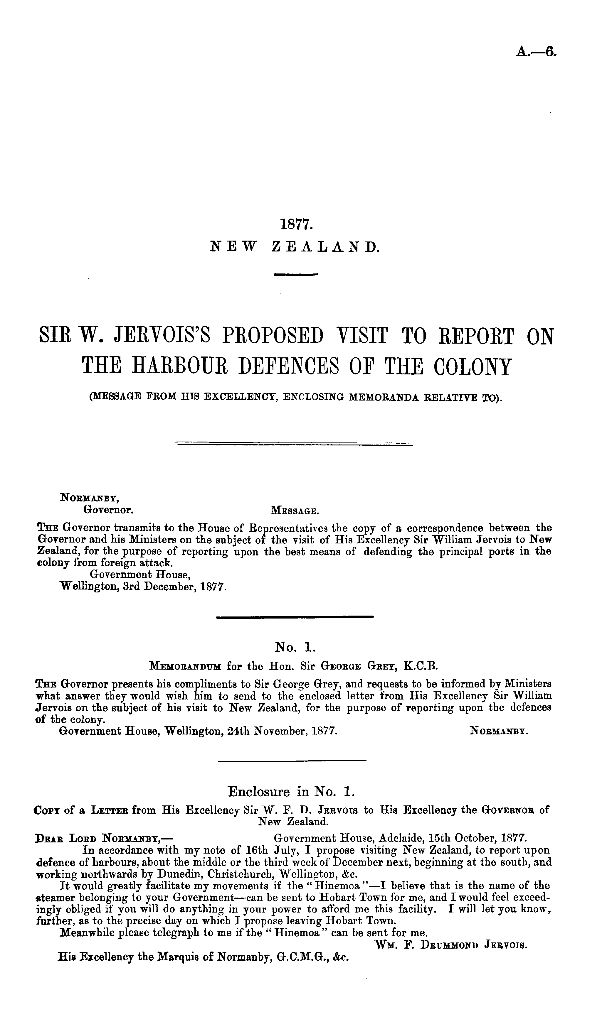 NOBMANBT, Governor. Message. The Governor transmits to the House of Representatives the copy of a correspondence between the Governor and his Ministers on the subject of the visit of His Excellency Sir William Jervois to New Zealand, for the purpose of reporting upon the best means of defending the principal ports in the colony from foreign attack. Government House, Wellington, 3rd December, 1877.