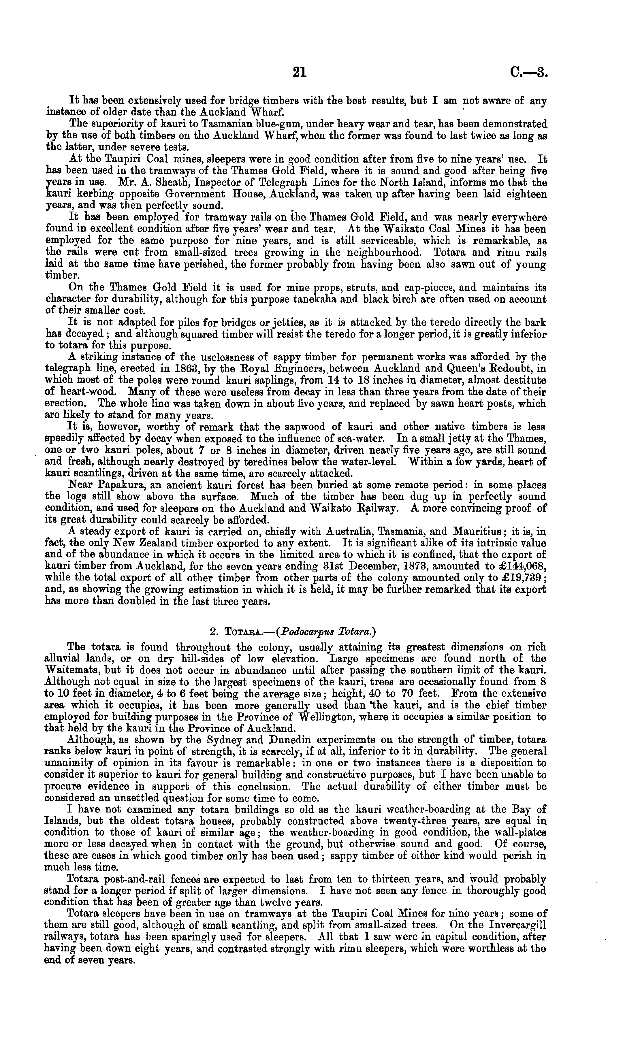 It has been extensively used for bridge timbers with the best results, but I am not aware of any instance of older date than the Auckland Wharf. The superiority of kauri to Tasmanian blue-gum, under heavy wear and tear, has been demonstrated by the use of both timbers on the Auckland Wharf, when the former was found to last twice as long as the latter, under severe tests. At the Taupiri Coal mines, sleepers were in good condition after from five to nine years' use. It has been used in the tramways of the Thames Gold Field, where it is sound and good after being five years in use. Mr. A. Sheath, Inspector of Telegraph Lines for the North Island, informs me that the kauri kerbing opposite Government House, Auckland, was taken up after having been laid eighteen years, and was then perfectly sound. It has been employed for tramway rails on the Thames Gold Field, and was nearly everywhere found in excellent condition after five years' wear and tear. At the Waikato Coal Mines it has been employed for the same purpose for nine years, and is still serviceable, which is remarkable, as the rails were cut from small-sized trees growing in the neighbourhood. Totara and rimu rails laid at the same time have perished, the former probably from having been also sawn out of young timber. On the Thames Gold Field it is used for mine props, struts, and cap-pieces, and maintains its character for durability, although for this purpose tanekaha and black birch are often used on account of their smaller cost. It is not adapted for piles for bridges or jetties, as it is attacked by the teredo directly the bark has decayed ; and although squared timber will resist the teredo for a longer period, it is greatly inferior to totara for this purpose. A striking instance of the uselessness of sappy timber for permanent works was afforded by the telegraph line, erected in 1863, by the Eoyal Engineers, between Auckland and Queen's Eedoubt, in which most of the poles were round kauri saplings, from 14 to 18 inches in diameter, almost destitute of heart-wood. Many of these were useless from decay in less than three years from the date of their erection. The whole line was taken down in about five years, and replaced by sawn heart posts, which are likely to stand for many years. It is, however, worthy of remark that the sapwood of kauri and other native timbers is less speedily affected by decay when exposed to the influence of sea-water. In a small jetty at the Thames, one or two kauri poles, about 7 or 8 inches in diameter, driven nearly five years ago, are still sound and fresh, although nearly destroyed by teredines below the water-level. Within a few yards, heart of kauri scantlings, driven at the same time, are scarcely attacked. Near Papakura, an ancient kauri forest has been buried at some remote period: in some places the logs still show above the surface. Much of the timber has been dug up in perfectly sound condition, and used for sleepers on the Auckland and Waikato Eailway. A more convincing proof of its great durability could scarcely be afforded. A steady export of kauri is carried on, chiefly with Australia, Tasmania, and Mauritius; it is, in fact, the only New Zealand timber exported to any extent. It is significant alike of its intrinsic value and of the abundance in which it occurs in the limited area to which it is confined, that the export of kauri timber from Auckland, for the seven years ending 31st December, 1873, amounted to £144,068, while the total export of all other timber from other parts of the colony amounted only to £19,739 ; and, as showing the growing estimation in which it is held, it may be further remarked that its export has more than doubled in the last three years. 2. Totaba.— (Podocarpus Totara) The totara is found throughout the colony, usually attaining its greatest dimensions on rich alluvial lands, or on dry hill-sides of low elevation. Large specimens are found north of the Waitemata, but it does not occur in abundance until after passing the southern limit of the kauri. Although not equal in size to the largest specimens of the kauri, trees are occasionally found from 8 to 10 feet in diameter, 4to 6 feet being the average size; height, 40 to 70 feet. From the extensive area which it occupies, it has been more generally used than *the kauri, and is the chief timber employed for building purposes in the Province of Wellington, where it occupies a similar position to that held by the kauri in the Province of Auckland. Although, as shown by the Sydney and Dunedin experiments on the strength of timber, totara ranks below kauri in point of strength, it is scarcely, if at all, inferior to it in durability. The general unanimity of opinion in its favour is remarkable: in one or two instances there is a disposition to consider it superior to kauri for general building and constructive purposes, but I have been unable to procure evidence in support of this conclusion. The actual durability of either timber must be considered an unsettled question for some time to come. I have not examined any totara buildings so old as the kauri weather-boarding at the Bay of Islands, but the oldest totara houses, probably constructed above twenty-three years, are equal in condition to those of kauri of similar age; the weather-boarding in good condition, the wall-plates more or less decayed when in contact with the ground, but otherwise sound and good. Of course, these are cases in which good timber only has been used; sappy timber of either kind would perish in much less time. Totara post-and-rail fences are expected to last from ten to thirteen years, and would probably stand for a longer period if split of larger dimensions. I have not seen any fence in thoroughly good condition that has been of greater age than twelve years. Totara sleepers have been in use on tramways at the Taupiri Coal Mines for nine years ; some of them are still good, although of small scantling, and split from small-size