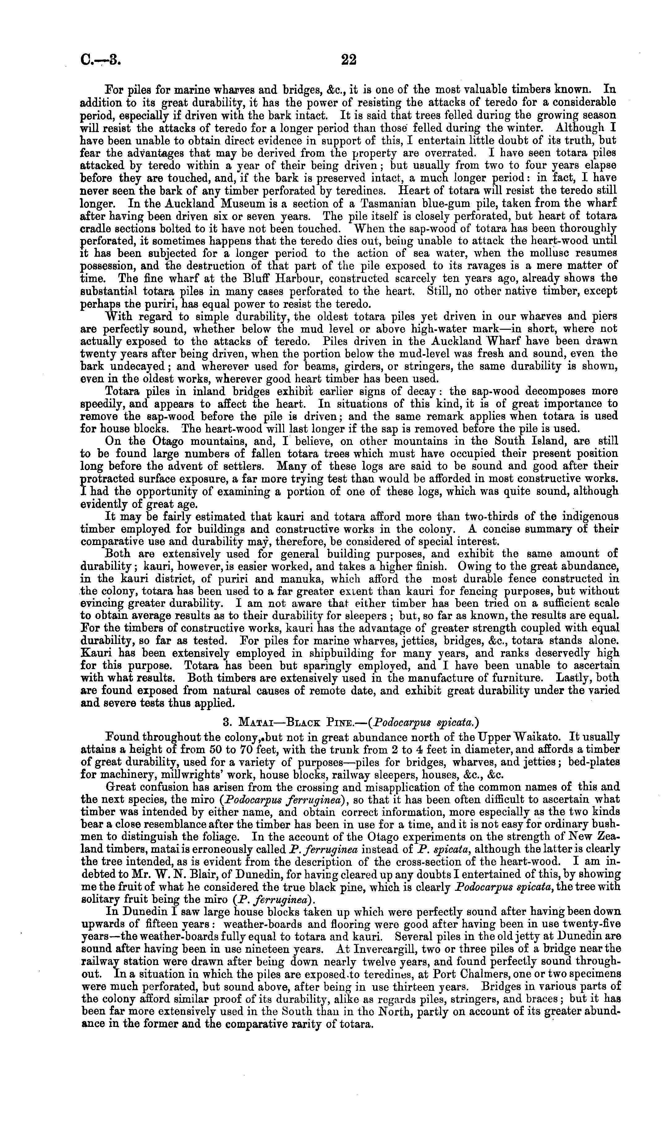 For piles for marine wharves and bridges, &c, it is one of the most valuable timbers known. In addition to its great durability, it has the power of resisting the attacks of teredo for a considerable period, especially if driven with the bark intact. It is said that trees felled during the growing season will resist the attacks of teredo for a longer period than those felled during the winter. Although I have been unable to obtain direct evidence in support of this, I entertain little doubt of its truth, but fear the advantages that may be derived from the property are overrated. I have seen totara piles attacked by teredo within a year of their being driven; but usually from two to four years elapse before they are touched, and, if the bark is preserved intact, a much longer period: in fact, I have never seen the bark of any timber perforated by teredines. Heart of totara will resist the teredo still longer. In the Auckland Museum is a section of a Tasmanian blue-gum pile, taken from the wharf after having been driven six or seven years. The pile itself is closely perforated, but heart of totara cradle sections bolted to it have not been touched. When the sap-wood of totara has been thoroughly perforated, it sometimes happens that the teredo dies out, being unable to attack the heart-wood until it has been subjected for a longer period to the action of sea water, when the mollusc resumes possession, and the destruction of that part of the pile exposed to its ravages is a mere matter of time. The fine wharf at the Bluff Harbour, constructed scarcely ten years ago, already shows the substantial totara piles in many cases perforated to the heart. Still, no other native timber, except perhaps the puriri. has equal power to resist the teredo. With regard to simple durability, the oldest totara piles yet driven in our wharves and piers are perfectly sound, whether below the mud level or above high-water mark —in short, where not actually exposed to the attacks of teredo. Piles driven in the Auckland Wharf have been drawn twenty years after being driven, when the portion below the mud-level was fresh and sound, even the bark undecayed ; and wherever used for beams, girders, or stringers, the same durability is shown, even in the oldest works, wherever good heart timber has been used. Totara piles in inland bridges exhibit earlier signs of decay : the sap-wood decomposes more speedily, and appears to affect the heart. In situations of this kind, it is of great importance to remove the sap-wood before the pile is driven; and the same remark applies when totara is used for house blocks. The heart-wood will last longer if the sap is removed before the pile is used. On the Otago mountains, and, I believe, on other mountains in the South Island, are still to be found large numbers of fallen totara trees which must have occupied their present position long before the advent of settlers. Many of these logs are said to be sound and good after their protracted surface exposure, a far more trying test than would be afforded in most constructive works. I had the opportunity of examining a portion of one of these logs, which was quite sound, although evidently of great age. It may be fairly estimated that kauri and totara afford more than two-thirds of the indigenous timber employed for buildings and constructive works in the colony. A concise summary of their comparative U3e and durability may, therefore, be considered of special interest. Both aro extensively used for general building purposes, and exhibit the same amount of durability ; kauri, however, is easier worked, and takes a higher finish. Owing to the great abundance, in the kauri district, of puriri and manuka, which afford the most durable fence constructed in the colony, totara has been used to a far greater extent than kauri for fencing purposes, but without evincing greater durability. I am not aware that either timber has been tried on a sufficient scale to obtain average results as to their durability for sleepers ; but, so far as known, the results are equal. For the timbers of constructive works, kauri has the advantage of greater strength coupled with equal durability, so far as tested. For piles for marine wharves, jetties, bridges, &c, totara stands alone. Kauri has been extensively employed in shipbuilding for many years, and ranks deservedly high for this purpose. Totara has been but sparingly employed, and I have been unable to ascertain with what results. Both timbers are extensively used in the manufacture of furniture. Lastly, both are found exposed from natural causes of remote date, and exhibit great durability under the varied and severe tests thus applied. 3. Matai—Black Pine.— (Podocarpus spicata.) Found throughout the colony,.but not in great abundance north of the Upper Waikato. It usually attains a height of from 50 to 70 feet, with the trunk from 2 to 4 feet in diameter, and affords a timber of great durability, used for a variety of purposes —piles for bridges, wharves, and jetties ; bed-plates for machinery, millwrights' work, house blocks, railway sleepers, houses, &c, &c. Great confusion has arisen from the crossing and misapplication of the common names of this and the next species, the miro (Podocarpus fierruginea), so that it has been often difficult to ascertain what timber was intended by either name, and obtain correct information, more especially as the two kinds bear a close resemblance after the timber has been in use for a time, and it is not easy for ordinary bushmen to distinguish the foliage. In the account of the Otago experiments on the strength of New Zealand timbers, matai is erroneously called P. fierruginea instead of P. spicata, although the latter is clearly the tree intended, as is evident from the description of the cross-section of the heart-wood. I am indebted to Mr. W. N. Blair, of Dunedin, for having cleared up any doubts I entertained of this, by showing me the fruit of what he c
