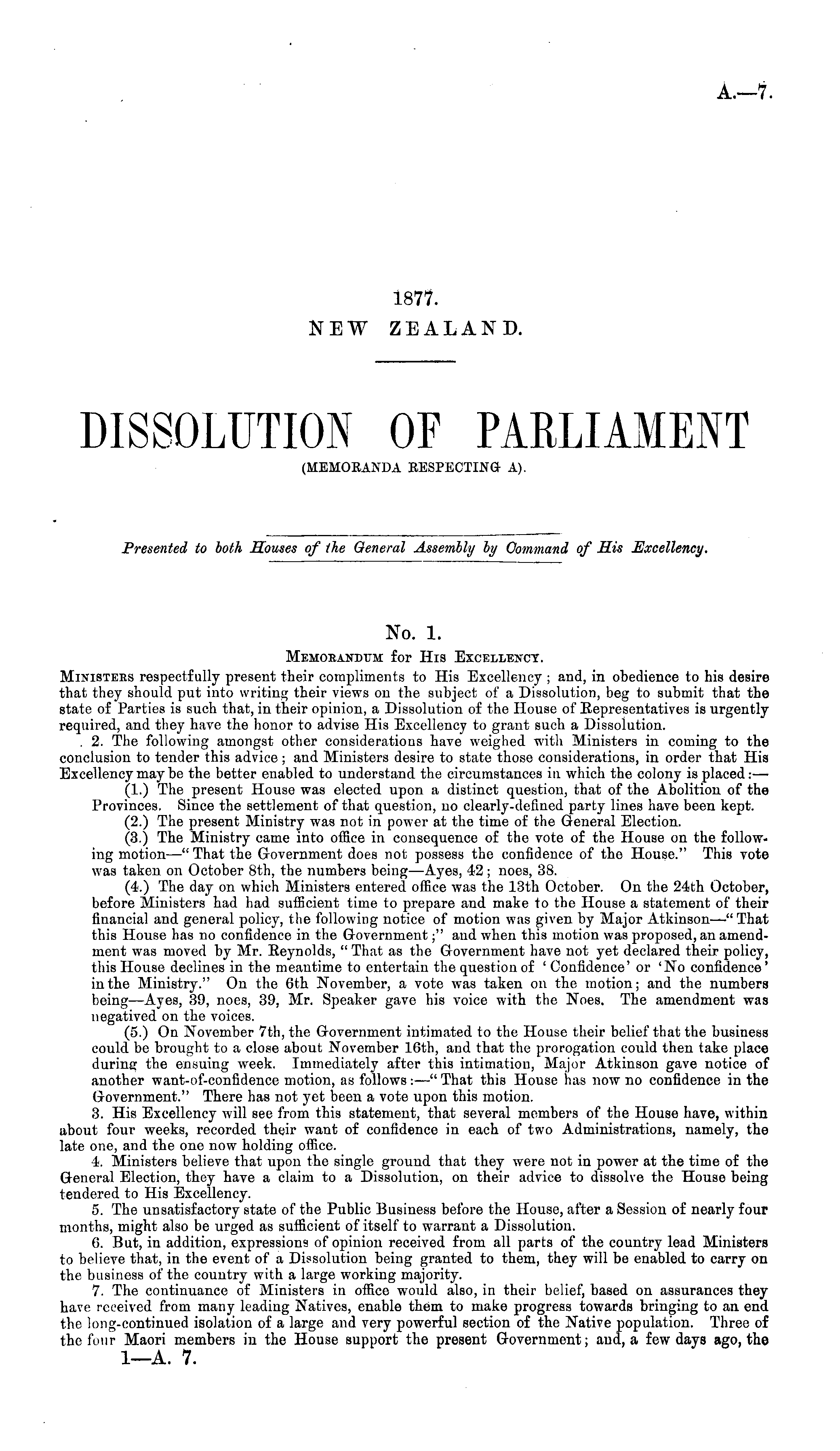 No. 1. Memoeandum for His Excellency. Ministebs respectfully present their compliments to His Excellency ; and, in obedience to his desire that they should put into writing their views on the subject of a Dissolution, beg to submit that the state of Parties is such that, in their opinion, a Dissolution of the House of Eepresentatives is urgently required, and they have the honor to advise His Excellency to grant such a Dissolution. . 2. The following amongst other considerations have weighed with Ministers in coming to the conclusion to tender this advice; and Ministers desire to state those considerations, in order that His Excellency may be the better enabled to understand the circumstances in which the colony is placed:— (1.) The present House was elected upon a distinct question, that of the Abolition of the Provinces. Since the settlement of that question, no clearly-defined party lines have been kept. (2.) The present Ministry was not in power at the time of the General Election. (3.) The Ministry came into office in consequence of the vote of the House on the following motion —" That the Government does not possess the confidence of the House." This vote was taken on October Bth, the numbers being—Ayes, 42 ; noes, 38. (4.) The day on which Ministers entered office was the 13th October. On the 24th October, before Ministers had had sufficient time to prepare and make to the House a statement of their financial and general policy, the following notice of motion was given by Major Atkinson—" That this House has no confidence in the Government;" aud when this motion was proposed, an amendment was moved by Mr. Eeynolds, " That as the Government have not yet declared their policy, this House declines in the meantime to entertain the question of ' Confidence' or 'No confidence ' in the Ministry." On the 6th November, a vote was taken on the motion; and the numbers being—Ayes, 39, noes, 39, Mr. Speaker gave his voice with the Noes. The amendment was negatived on the voices. (5.) On November 7th, the Government intimated to the House their belief that the business could be brought to a close about November 16th, and that the prorogation could then take place during the ensuing week. Immediately after this intimation, Major Atkinson gave notice of another want-of-confidence motion, as follows : —" That this House has now no confidence in the Government." There has not yet been a vote upon this motion. 3. His Excellency will see from this statement, that several members of the House have, within about four weeks, recorded their want of confidence in each of two Administrations, namely, the late one, and the one now holding office. 4. Ministers believe that upon the single ground that they were not in power at the time of the General Election, they have a claim to a Dissolution, on their advice to dissolve the House being tendered to His Excellency. 5. The unsatisfactory state of the Public Business before the House, after a Session of nearly four months, might also be urged as sufficient of itself to warrant a Dissolution. 6. But, in addition, expressions of opinion received from all parts of the country lead Ministers to believe that, in the event of a Dissolution being granted to them, they will be enabled to carry on the business of the country with a large working majority. 7. The continuance of Ministers in office would also, in their belief, based on assurances they have received from many leading Natives, enable them to make progress towards bringing to an end the long-continued isolation of a large and very powerful section of the Native population. Three of the four Maori members in the House support the present Government; aud, a few days ago, the I—A. 7.