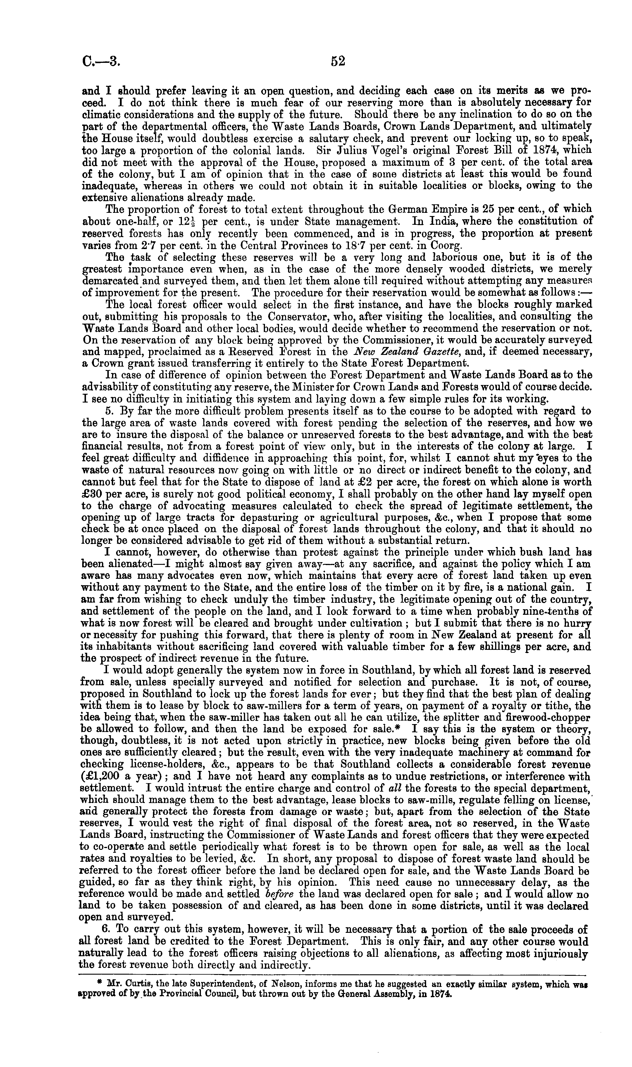 and I should prefer leaving it an open question, and deciding each case on its merits as we proceed. I do not think there is much fear of our reserving more than is absolutely necessary for climatic considerations and the supply of the future. Should there be any inclination to do so on the part of the departmental officers, the Waste Lands Boards, Crown Lands Department, and ultimately the House itself, would doubtless exercise a salutary check, and prevent our locking up, so to speak, too large a proportion of the colonial lands. Sir Julius Vogel's original Forest Bill of 1874, which did not meet with the approval of the House, proposed a maximum of 3 per cent, of the total area of the colony, but I am of opinion that in the case of some districts at least this would be found inadequate, whereas in others we could not obtain it in suitable localities or blocks, owing to the extensive alienations already made. The proportion of forest to total extent throughout the German Empire is 25 per cent., of which about one-half, or 12$ per cent., is under State management. In India, where the constitution of reserved forests has only recently been commenced, and is in progress, the proportion at present varies from 27 per cent, in the Central Provinces to 187 per cent, in Coorg. The task of selecting these reserves will be a very long and laborious one, but it is of the greatest importance even when, as in the case of the more densely wooded districts, we merely demarcated and surveyed them, and then let them alone till required without attempting any measures of improvement for the present. The procedure for their reservation would be somewhat as follows : — The local forest officer would select in the first instance, and have the blocks roughly marked out, submitting his proposals to the Conservator, who, after visiting the localities, and consulting the Waste Lands Board and other local bodies, would decide whether to recommend the reservation or not. On the reservation of any block being approved by the Commissioner, it would be accurately surveyed and mapped, proclaimed as a Eeserved Forest in the New Zealand Gazette, and, if deemed necessary, a Crown grant issued transferring it entirely to the State Forest Department. In case of difference of opinion between the Forest Department and Waste Lands Board as to the advisability of constituting any reserve, the Minister for Crown Lands and Forests would of course decide. I see no difficulty in initiating this system and laying down a few simple rules for its working. 5. By far the more difficult problem presents itself as to the course to be adopted with regard to the large area of waste lands covered with forest pending the selection of the reserves, and how we are to insure the disposal of the balance or unreserved forests to the best advantage, and with the best financial results, not from a forest point of view only, but in the interests of the colony at large. I feel great difficulty and diffidence in approaching this point, for, whilst I cannot shut my eyes to the waste of natural resources now going on with little or no direct or indirect benefit to the colony, and cannot but feel that for the State to dispose of land at £2 per acre, the forest on which alone is worth £30 per acre, is surely not good political economy, I shall probably on the other hand lay myself open to the charge of advocating measures calculated to check the spread of legitimate settlement, the opening up of large tracts for depasturing or agricultural purposes, &c, when I propose that some check be at once placed on the disposal of forest lands throughout the colony, and that it should no longer be considered advisable to got rid of them without a substantial return. I cannot, however, do otherwise than protest against the principle under which bush land has been alienated —I might almost say given away —at any sacrifice, and against the policy which lam aware has many advocates even now, which maintains that every acre of forest land taken up even without any payment to the State, and the entire loss of the timber on it by fire, is a national gain. I am far from wishing to check unduly the timber industry, the legitimate opening out of the country, and settlement of the people on the land, and I look forward to a time when probably nine-tenths of what is now forest will be cleared and brought under cultivation ; but I submit that there is no hurry or necessity for pushing this forward, that there is plenty of room in New Zealand at present for all its inhabitants without sacrificing land covered with valuable timber for a few shillings per acre, and the prospect of indirect revenue in the future. I would adopt generally the system now in force in Southland, by which all forest land is reserved from sale, unless specially surveyed and notified for selection and purchase. It is not, of course, proposed in Southland to lock up the forest lands for ever; but they find that the best plan of dealing with them is to lease by block to saw-millers for a term of years, on payment of a royalty or tithe, the idea being that, when the saw-miller has taken out all he can utilize, the splitter and firewood-chopper be allowed to follow, and then the land be exposed for sale.* I say this is the system or theory, though, doubtless, it is not acted upon strictly in practice, new blocks being given before the old ones are sufficiently cleared; but the result, even with the very inadequate machinery at command for checking license-holders, &c, appears to be that Southland collects a considerable forest revenue (£1,200 a year) ; and I have not heard any complaints as to undue restrictions, or interference with settlement. I would intrust the entire charge and control of all the forests to the special department, which should manage them to the best advantage, lease blocks to saw-mills, regulate felling on license, and generally protect the forests from damage or waste; but, ap
