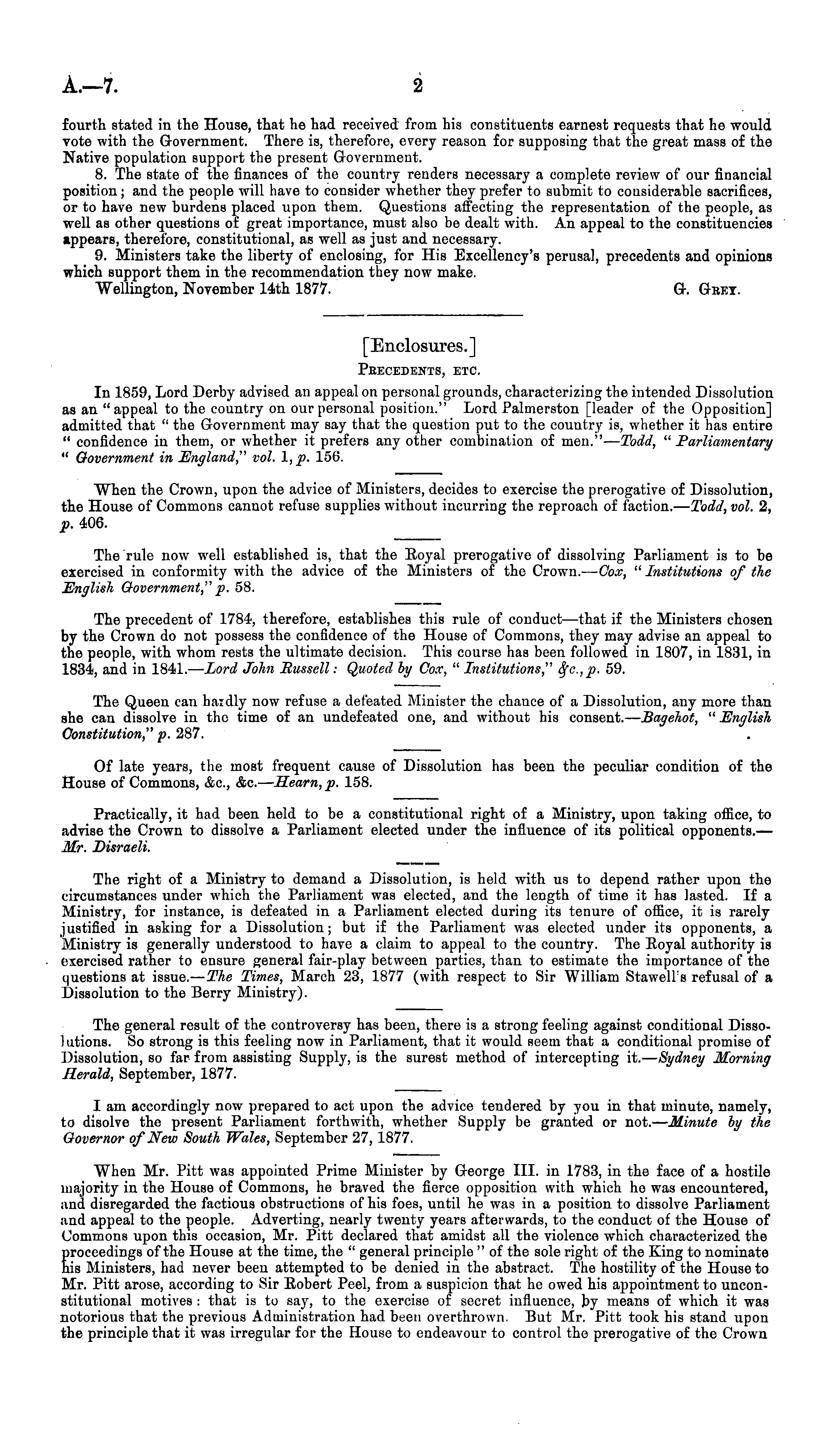 [Enclosures.] Peecedents, etc. In 1859, Lord Derby advised an appeal on personal grounds, characterizing the intended Dissolution as an "appeal to the country on our personal position." Lord Palmerston [leader of the Opposition] admitted that " the Government may say that the question put to the country is, whether it has entire " confidence in them, or whether it prefers any other combination of men."— Todd, "Parliamentary " Government in England," vol. 1, p. 156. AVhen the Crown, upon the advice of Ministers, decides to exercise the prerogative of Dissolution, the House of Commons cannot refuse supplies without incurring the reproach of faction.— Todd, vol. 2, p. 406. The rule now well established is, that the Eoyal prerogative of dissolving Parliament is to be exercised in conformity with the advice of the Ministers of the Crown. — Cox, "Institutions of the English Government," p. 58. The precedent of 1784, therefore, establishes this rule of conduct —that if the Ministers chosen by the Crown do not possess the confidence of the House of Commons, they may advise an appeal to the people, with whom rests the ultimate decision. This course has been followed in 1807, in 1831, in 1834, and in 1841. — Lord John Russell: Quoted by Cox, " Institutions," Sfc.,p. 59. The Queen can hardly now refuse a defeated Minister the chance of a Dissolution, any more than she can dissolve in the time of an undefeated one, and without his consent. — Bagehot, " English Constitution," p. 287. Of late years, the most frequent cause of Dissolution has been the peculiar condition of the House of Commons, &c, &c.—Hearn, p. 158. Practically, it had been held to be a constitutional right of a Ministry, upon taking office, to advise the Crown to dissolve a Parliament elected under the influence of its political opponents.— Mr. Disraeli. The right of a Ministry to demand a Dissolution, is held with us to depend rather upon the circumstances under which the Parliament was elected, and the length of time it has lasted. If a Ministry, for instance, is defeated in a Parliament elected during its tenure of office, it is rarely justified in asking for a Dissolution ; but if the Parliament was elected under its opponents, a Ministry is generally understood to have a claim to appeal to the country. The Eoyal authority is exercised rather to ensure general fair-play between parties, than to estimate the importance of the questions at issue.— The Times, March 23, 1877 (with respect to Sir William Stawelfs refusal of a Dissolution to the Berry Ministry). The general result of the controversy has been, there is a strong feeling against conditional DissoUitions. So strong is this feeling now in Parliament, that it would seem that a conditional promise of Dissolution, so far from assisting Supply, is the surest method of intercepting it.— Sydney Morning Herald, September, 1877. I am accordingly now prepared to act upon the advice tendered by you in that minute, namely, to disolve the present Parliament forthwith, whether Supply be granted or not. — Minute by the Governor of New South Wales, September 27, 1877. When Mr. Pitt was appointed Prime Minister by George 111. in 1783, in the face of a hostile majority in the House of Commons, he braved the fierce opposition with which he was encountered, and disregarded the factious obstructions of his foes, until he was in a position to dissolve Parliament and appeal to the people. Adverting, nearly twenty years afterwards, to the conduct of the House of Commons upon this occasion, Mr. Pitt declared that amidst all the violence which characterized the proceedings of the House at the time, the " general principle " of the sole right of the King to nominate his Ministers, had never been attempted to be denied in the abstract. The hostility of the House to Mr. Pitt arose, according to Sir Eobert Peel, from a suspicion that he owed his appointment to unconstitutional motives : that is to say, to the exercise of secret influence, by means of which it was notorious that the previous Administration had been overthrown. But Mr. Pitt took his stand upon the principle that it was irregular for the House to endeavour to control the prerogative of the Crown