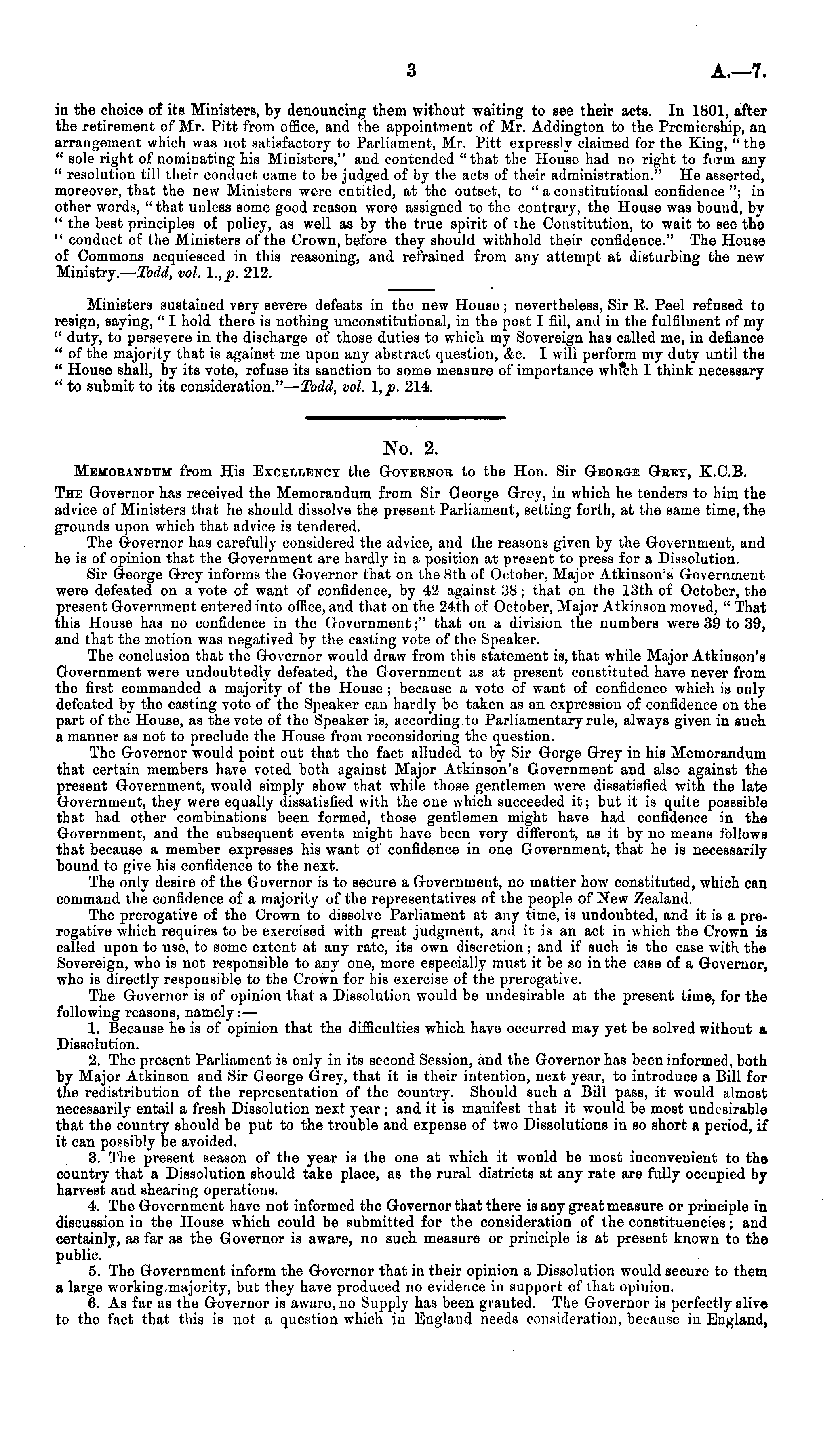 No. 2. Memoeandum from His Excellency the Goveenoe to the Hon. Sir Geoege Gbey, K.C.B. The Governor has received the Memorandum from Sir George Grey, in which he tenders to him the advice of Ministers that he should dissolve the present Parliament, setting forth, at the same time, the grounds upon which that advice is tendered. The Governor has carefully considered the advice, and the reasons given by the Government, and he is of opinion that the Government are hardly in a position at present to press for a Dissolution. Sir George Grey informs the Governor that on the Bth of October, Major Atkinson's Government were defeated on a vote of want of confidence, by 42 against 38; that on the 13th of October, the present Government entered into office, and that on the 24th of October, Major Atkinson moved, " That this House has no confidence in the Government;" that on a division the numbers were 39 to 39, and that the motion was negatived by the casting vote of the Speaker. The conclusion that the Governor would draw from this statement is, that while Major Atkinson's Government were undoubtedly defeated, the Government as at present constituted have never from the first commanded a majority of the House ; because a vote of want of confidence which is only defeated by the casting vote of the Speaker can hardly be taken as an expression of confidence on the part of the House, as the vote of the Speaker is, according to Parliamentary rule, always given in such a manner as not to preclude the House from reconsidering the question. The Governor would point out that the fact alluded to by Sir Gorge Grey in his Memorandum that certain members have voted both against Major Atkinson's Government and also against the present Government, would simply show that while those gentlemen were dissatisfied with the late Government, they were equally dissatisfied with the one which succeeded it; but it is quite posssible that had other combinations been formed, those gentlemen might have had confidence in the Government, and the subsequent events might have been very different, as it by no means follows that because a member expresses his want of confidence in one Government, that he is necessarily bound to give his confidence to the next. The only desire of the Governor is to secure a Government, no matter how constituted, which can command the confidence of a majority of the representatives of the people of New Zealand. The prerogative of the Crown to dissolve Parliament at any time, is undoubted, and it is a prerogative which requires to be exercised with great judgment, and it is an act in which the Crown is called upon to use, to some extent at any rate, its own discretion; and if such is the case with the Sovereign, who is not responsible to any one, more especially must it be so in the case of a Governor, who is directly responsible to the Crown for his exercise of the prerogative. The Governor is of opinion that a Dissolution would be undesirable at the present time, for the following reasons, namely : — 1. Because he is of opinion that the difficulties which have occurred may yet be solved without a Dissolution. 2. The present Parliament is only in its second Session, and the Governor has been informed, both by Major Atkinson and Sir George Grey, that it is their intention, next year, to introduce a Bill for the redistribution of the representation of the country. Should such a Bill pass, it would almost necessarily entail a fresh Dissolution next year; and it is manifest that it would be most undesirable that the country should be put to the trouble aud expense of two Dissolutions in so short a period, if it can possibly be avoided. 3. The present season of the year is the one at which it would be most inconvenient to the country that a Dissolution should take place, as the rural districts at any rate are fully occupied by harvest and shearing operations. 4. The Government have not informed the Governor that there is any great measure or principle in discussion in the House which could be submitted for the consideration of the constituencies; and certainly, as far as the Governor is aware, no such measure or principle is at present known to the public. 5. The Government inform the Governor that in their opinion a Dissolution would secure to them a large working,majority, but they have produced no evidence in support of that opinion. 6. As far as the Governor is aware, no Supply has been granted. The Governor is perfectly alive to the fact that this is not a question which in England needs consideration, because in England,