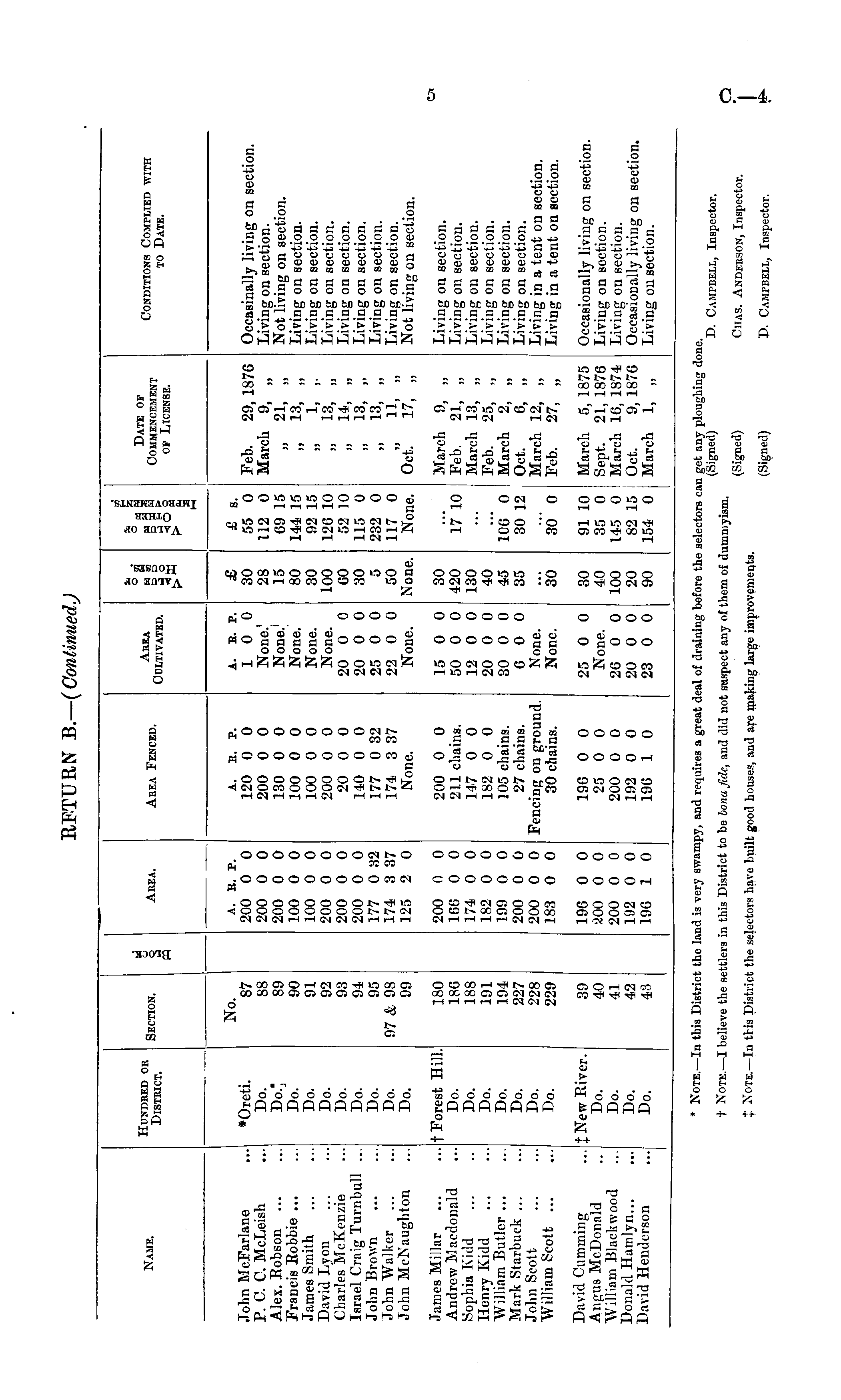 * Note.—In this District the land is very swampy, and requires a great deal of draining before the selectors can get any ploughing done. (Signed) D. Campbell, Inspector. T Isotk. — I believe the settlers in this District to be hona fide, and did not suspect any of them of dumniyism. (Signed) Cius. Anderson, Inspector. + JSote.—In tHs District the selectors have built good houses, and are making large improvements. (Signed) D- Campbell, Inspector.